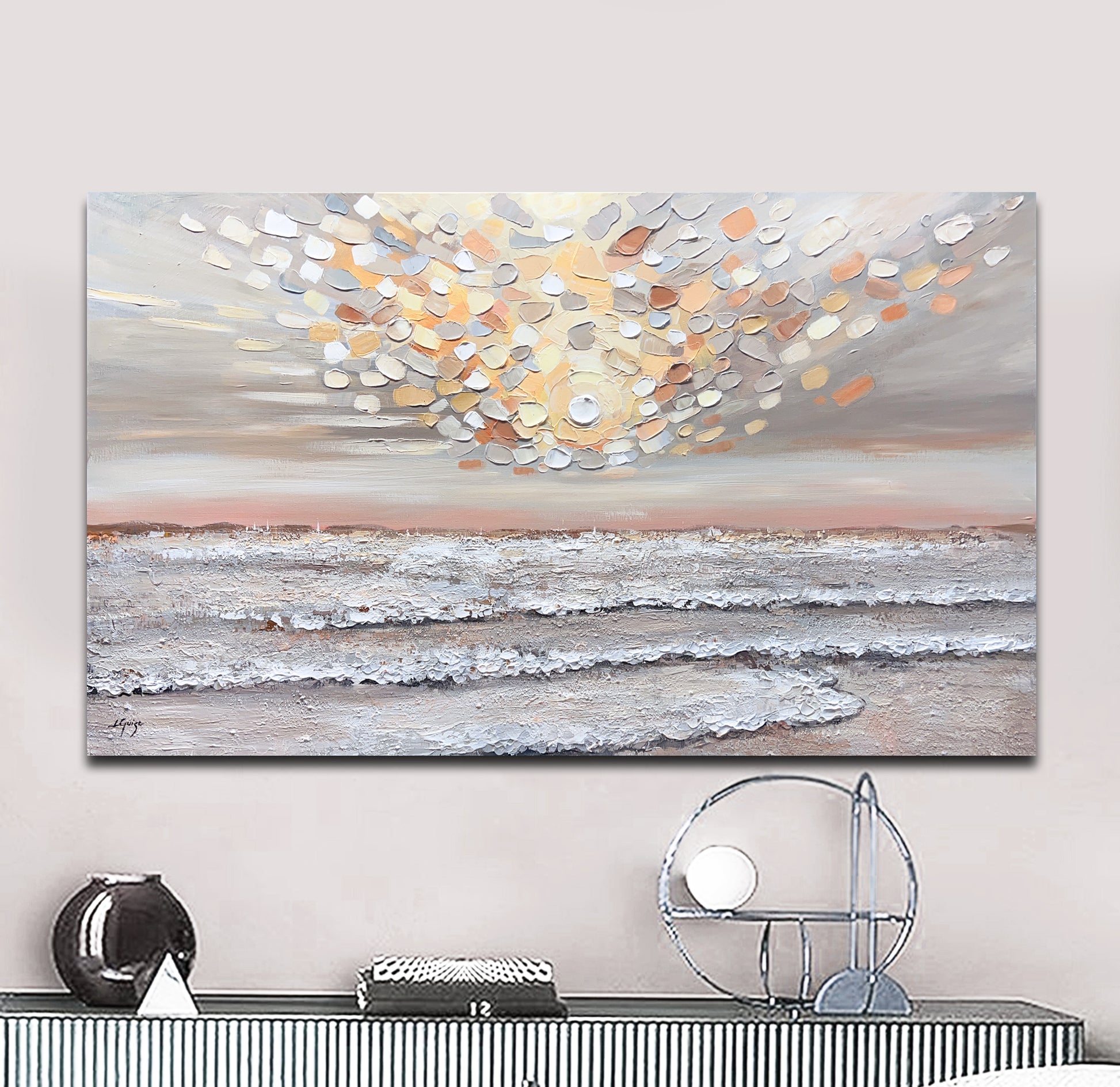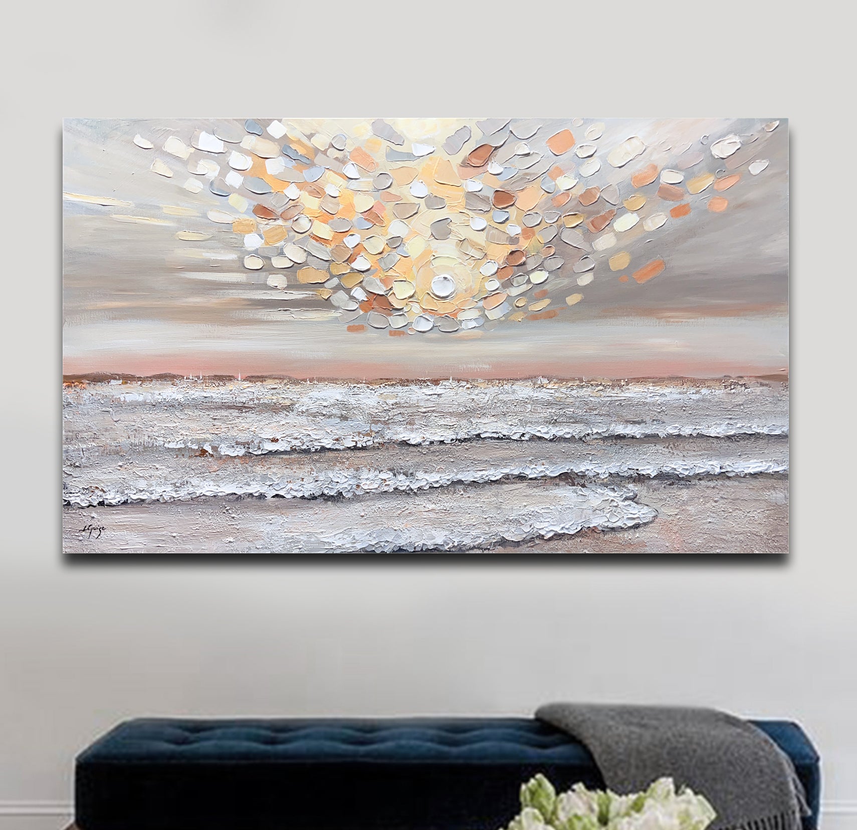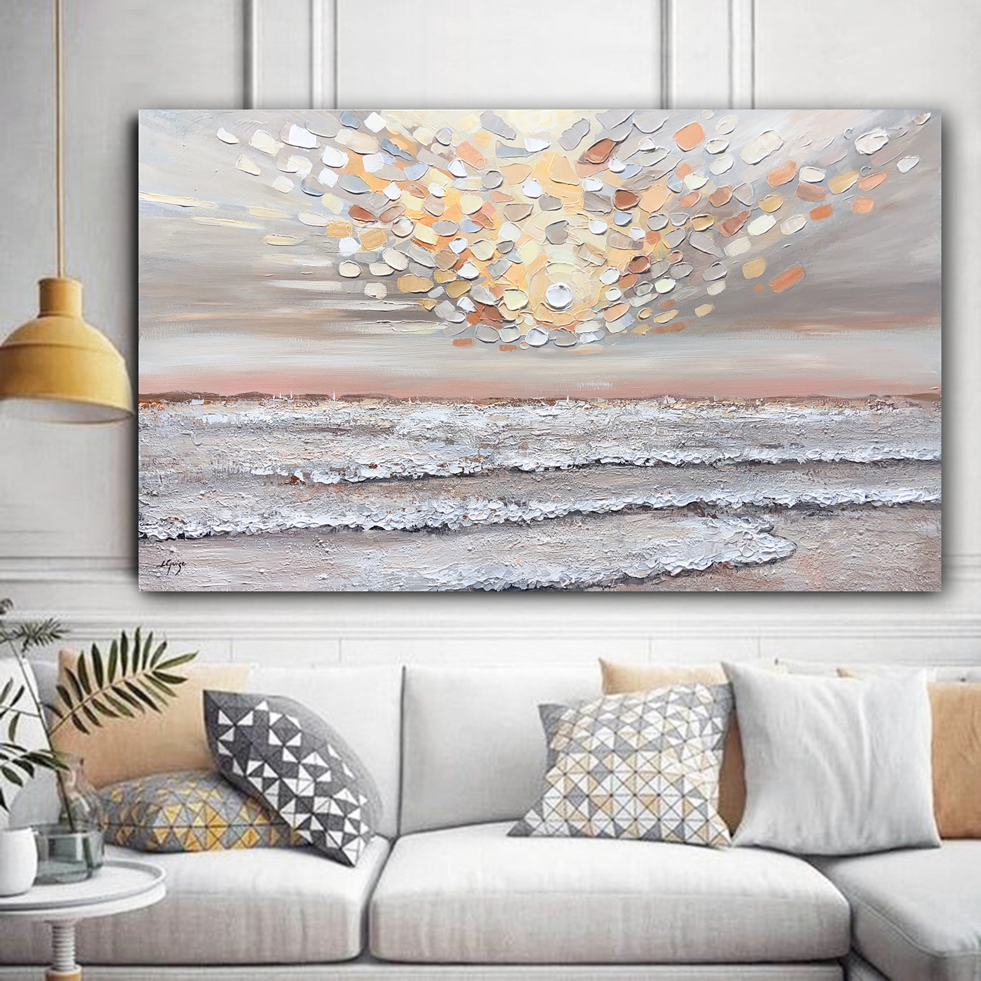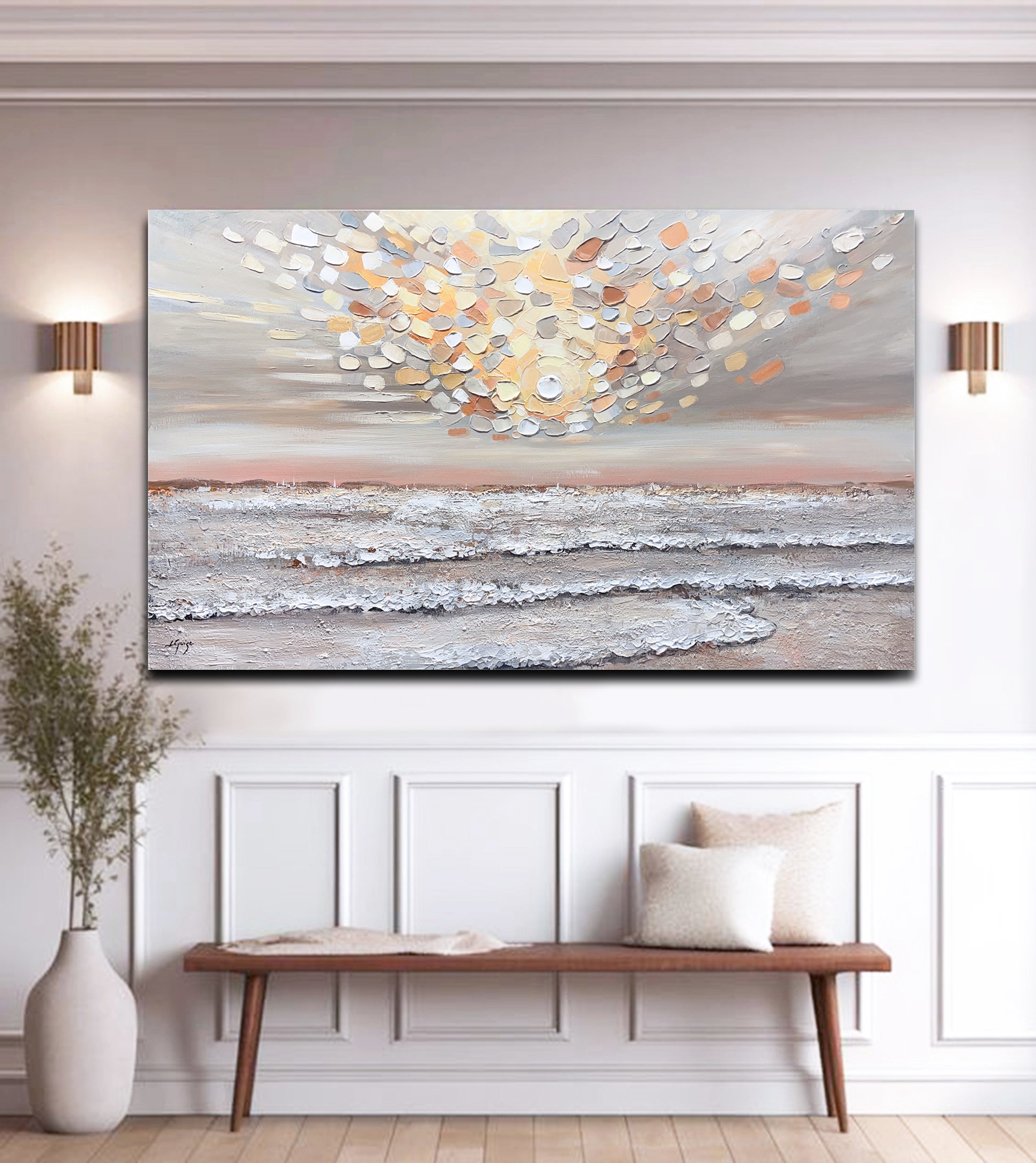 Heavenly Rise is a captivating textured seascape that evokes the serene warmth of a pastel sunrise.