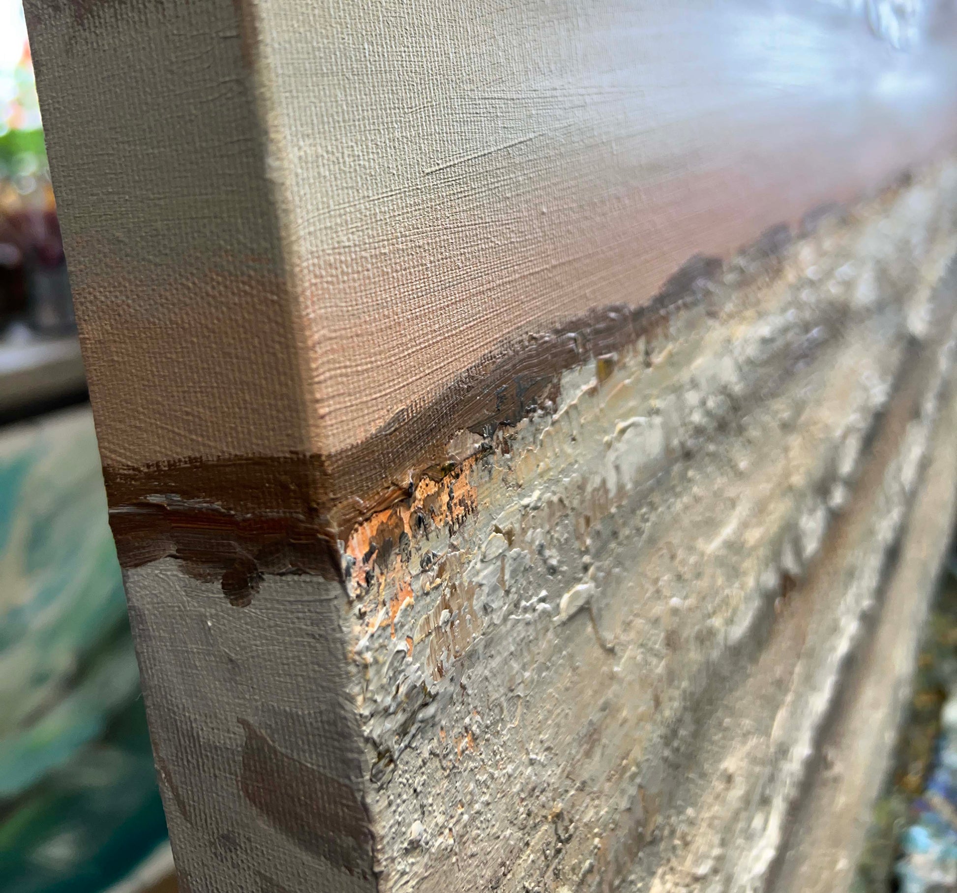 The painting extends gracefully around the edges of the 4.5 cm deep canvas, offering a modern, frameless presentation that brings elegance and atmosphere to any space.