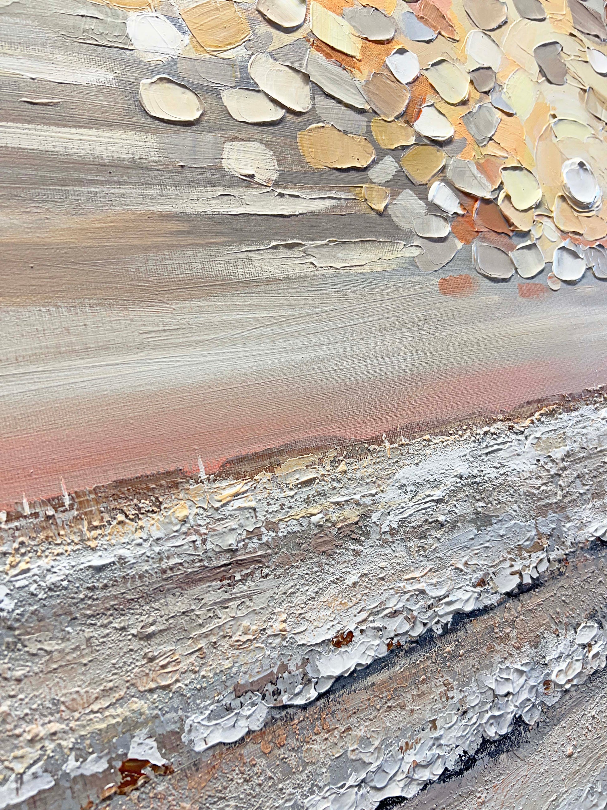 Thick, expressive palette knife strokes add depth and movement, capturing the tranquil energy of dawn breaking over the sea.