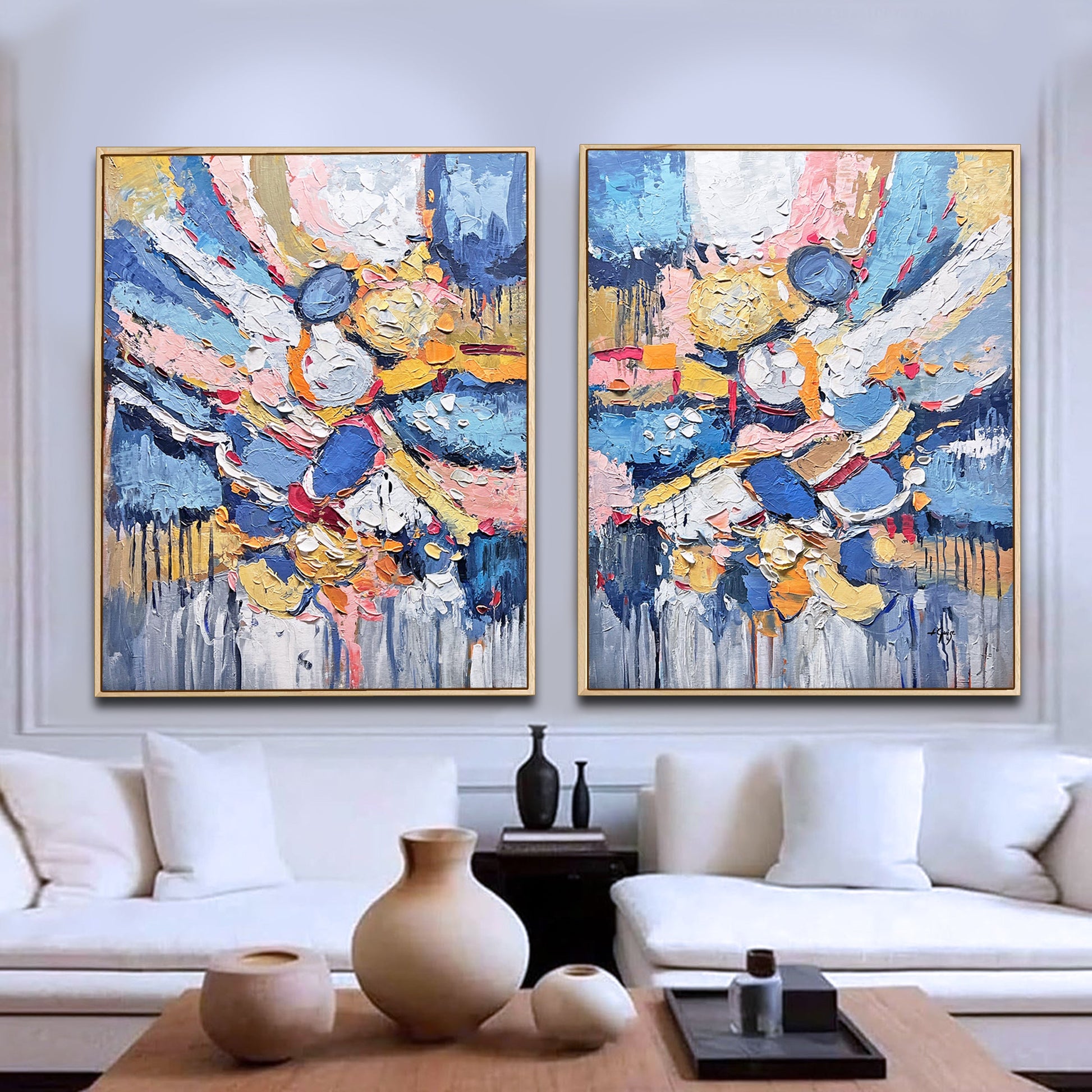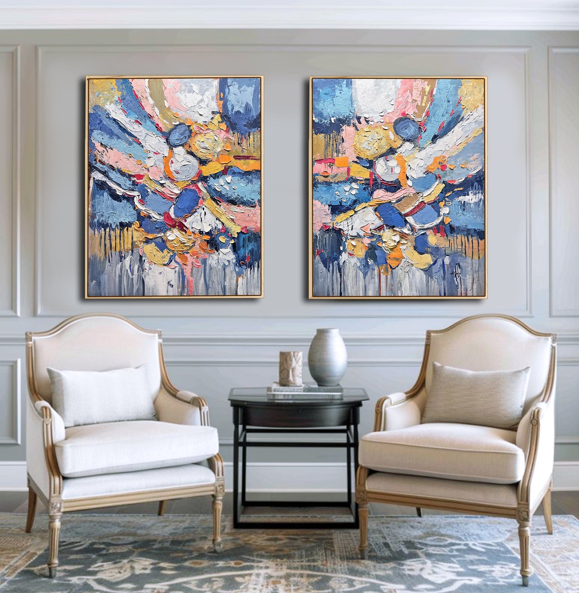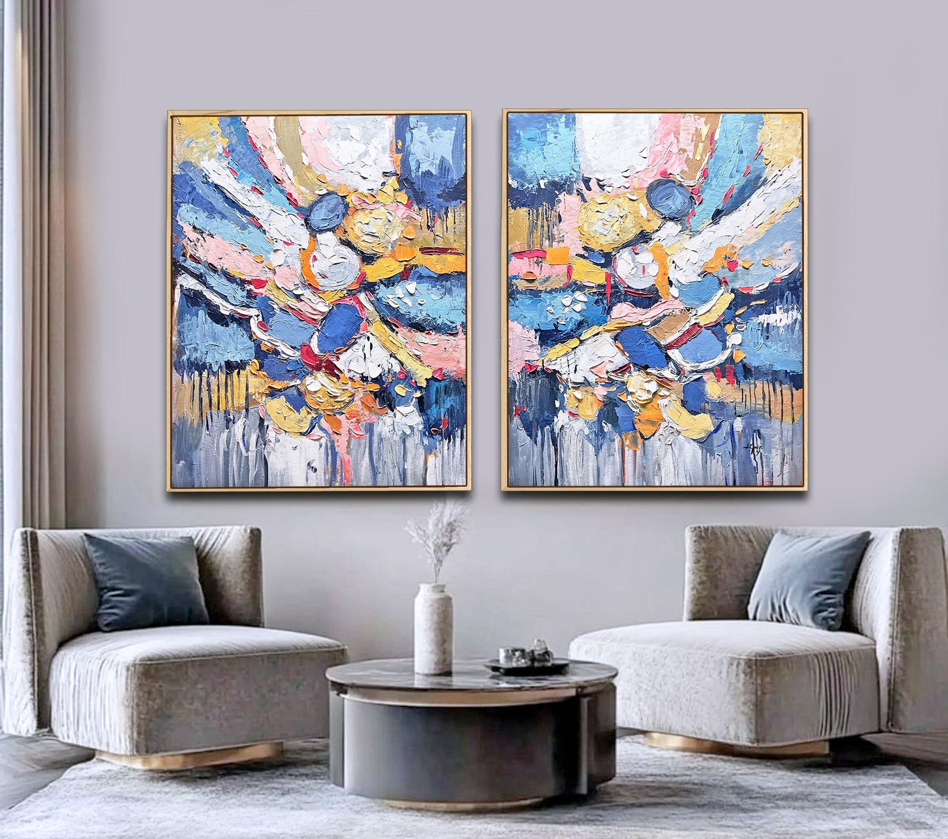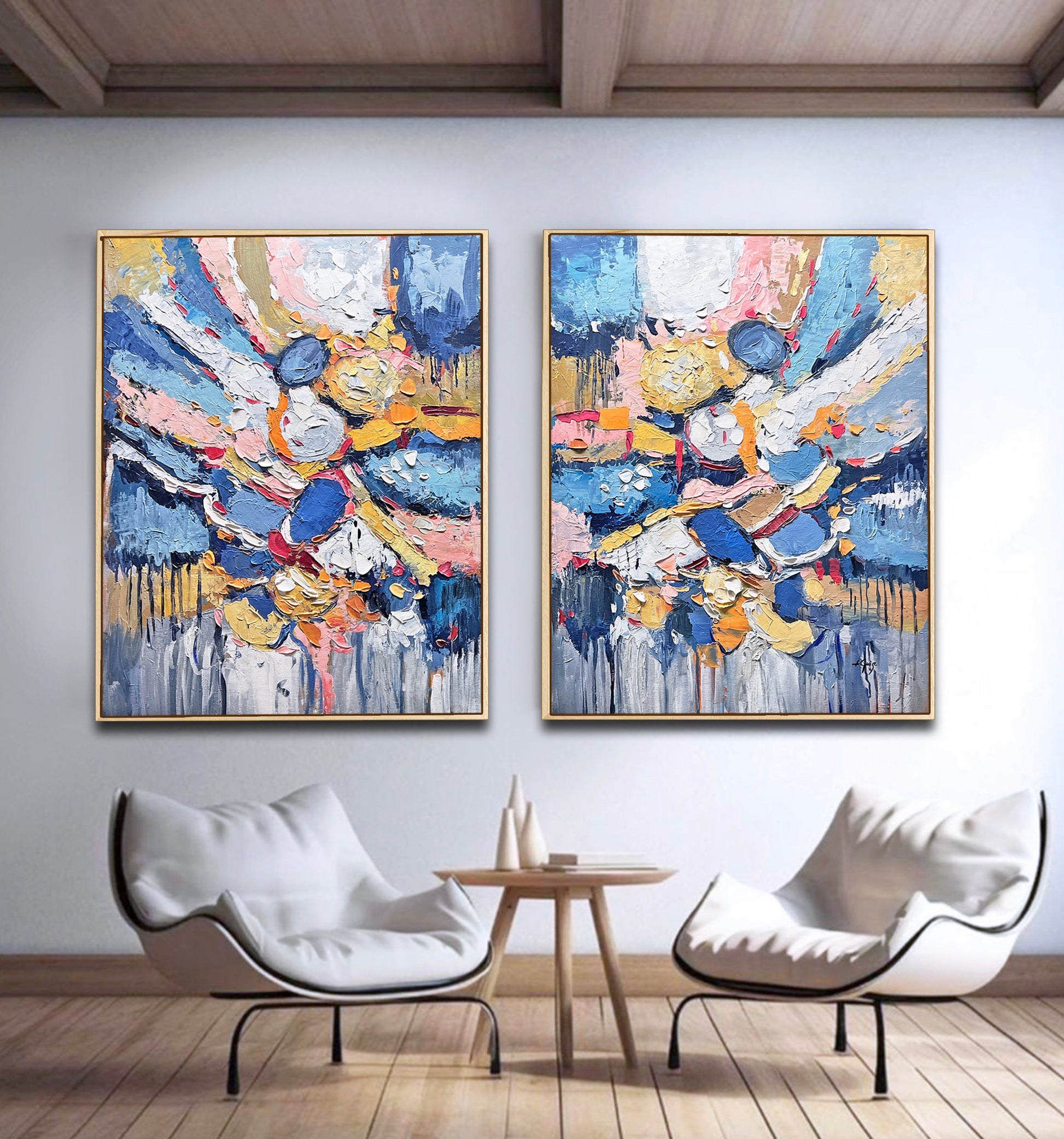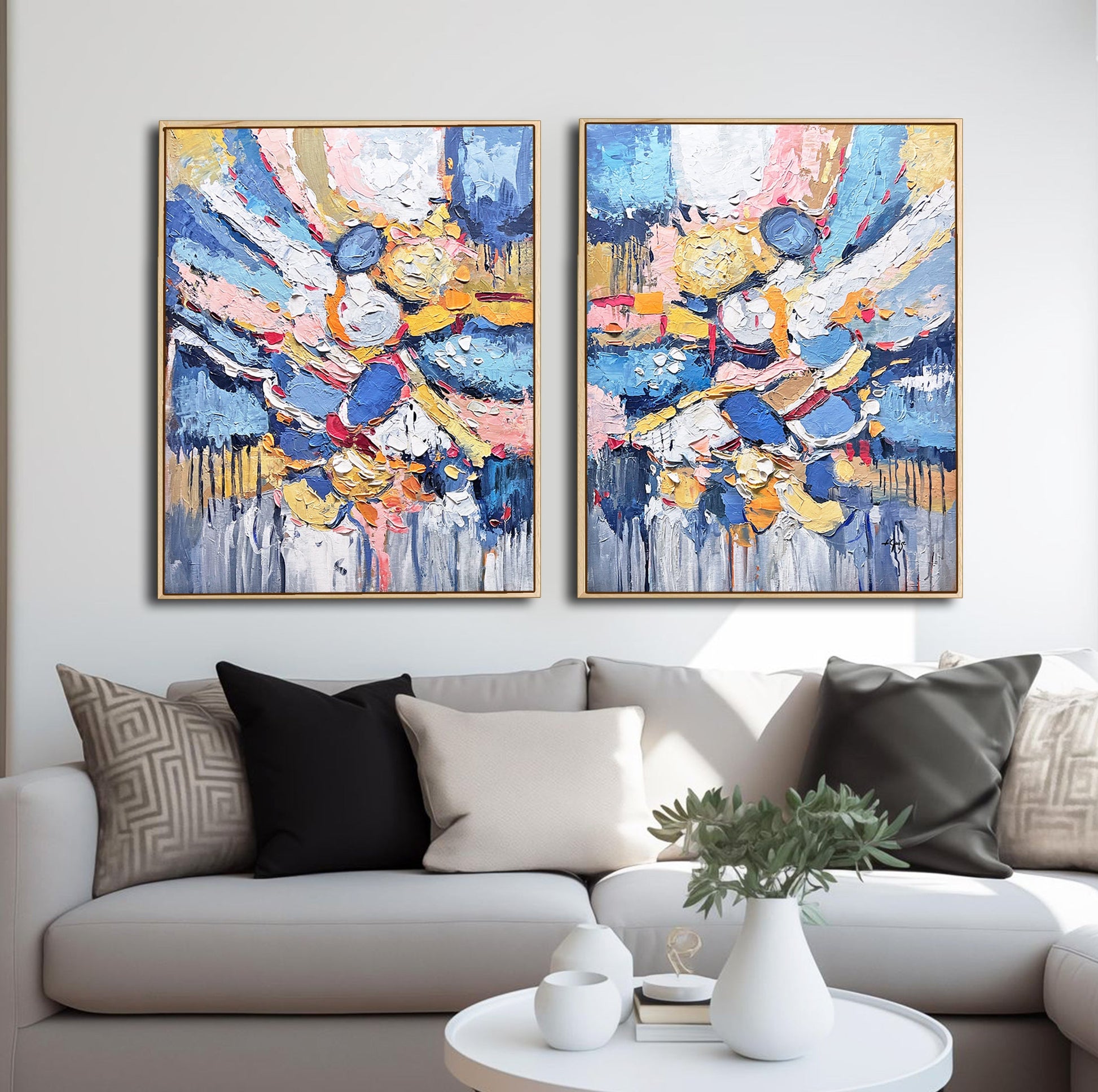 Soft sky blues and deep indigo tones create an open, peaceful backdrop, while layered notes of gold, cream, warm amber, gentle teal, and blush accents move across both paintings like light filtering through air. Rich palette-knife texture builds a sculptural surface that feels alive expressive, tactile, and full of motion, as if the light is passing from one canvas to the other.