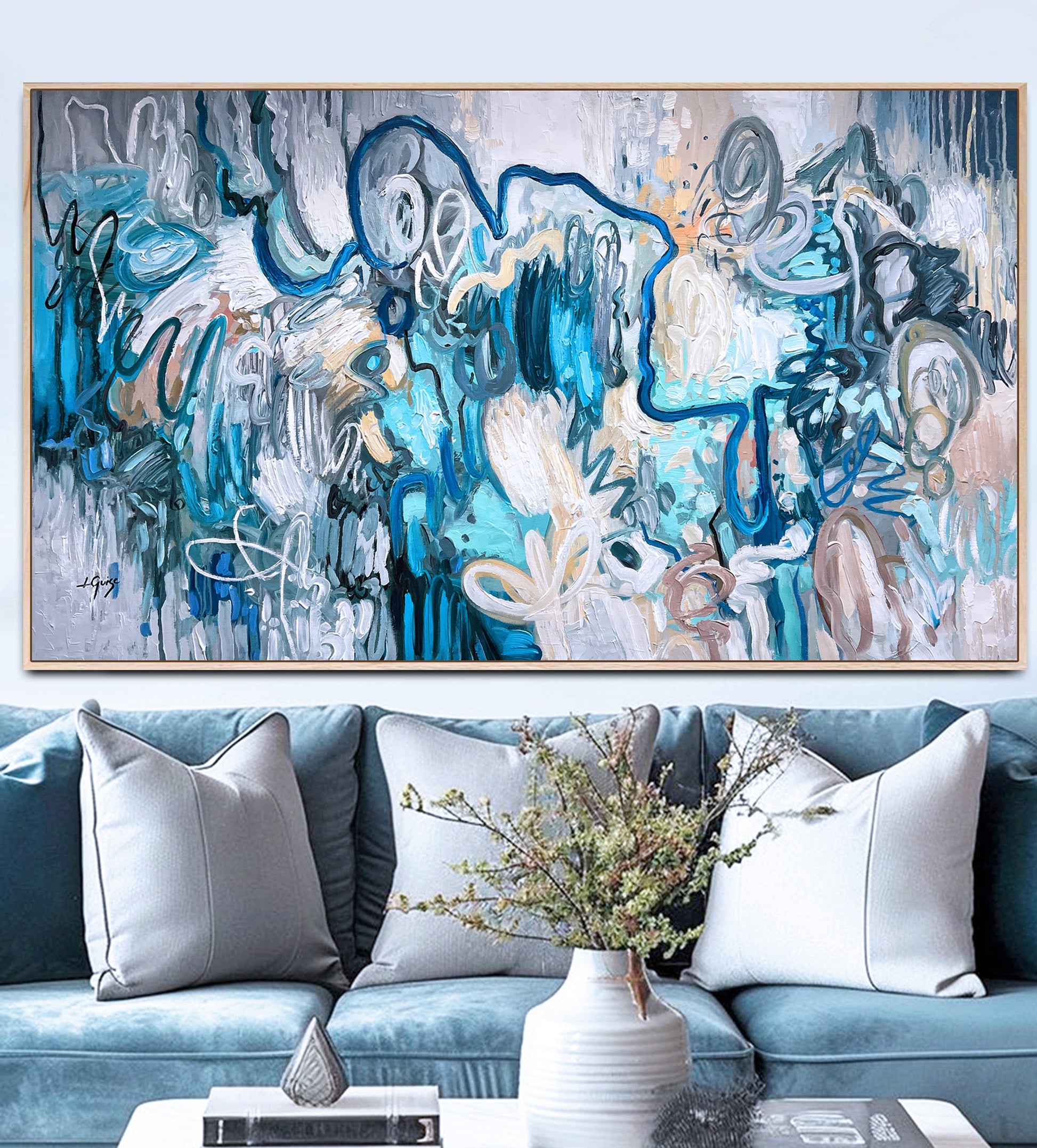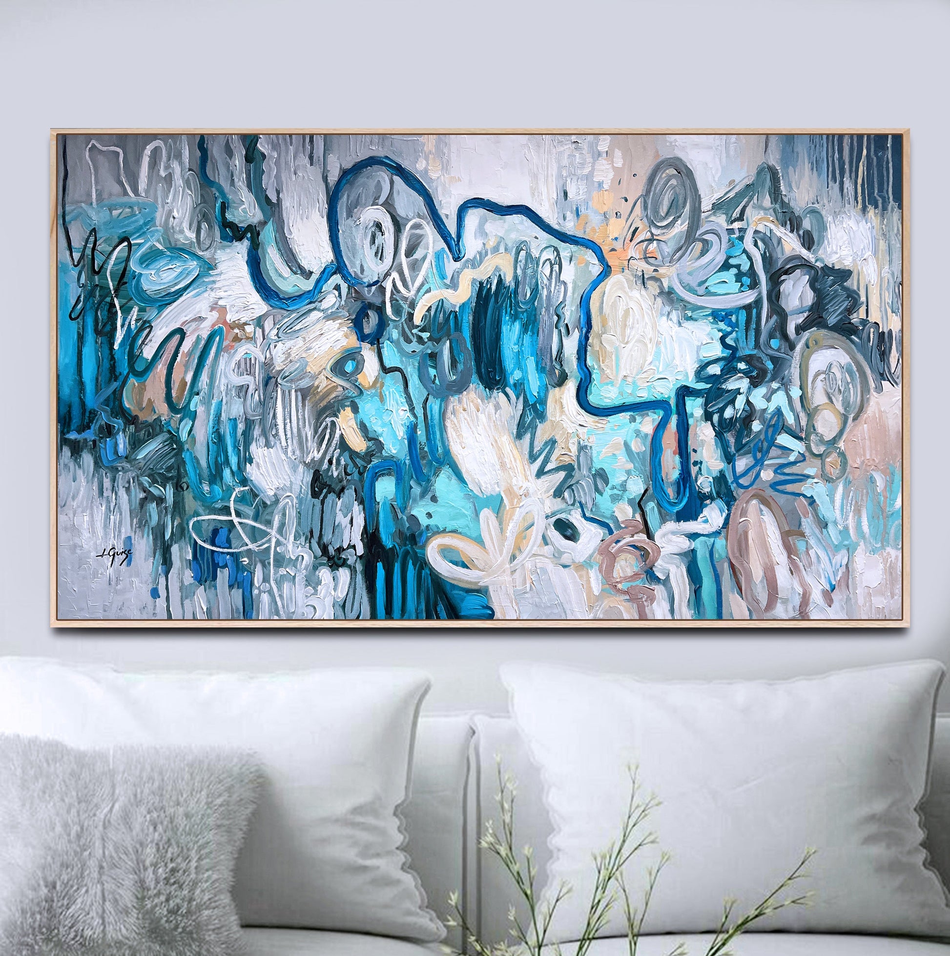 I recommend a white frame to highlight its cool, fluid tones and enhance the painting’s serene, contemporary character.