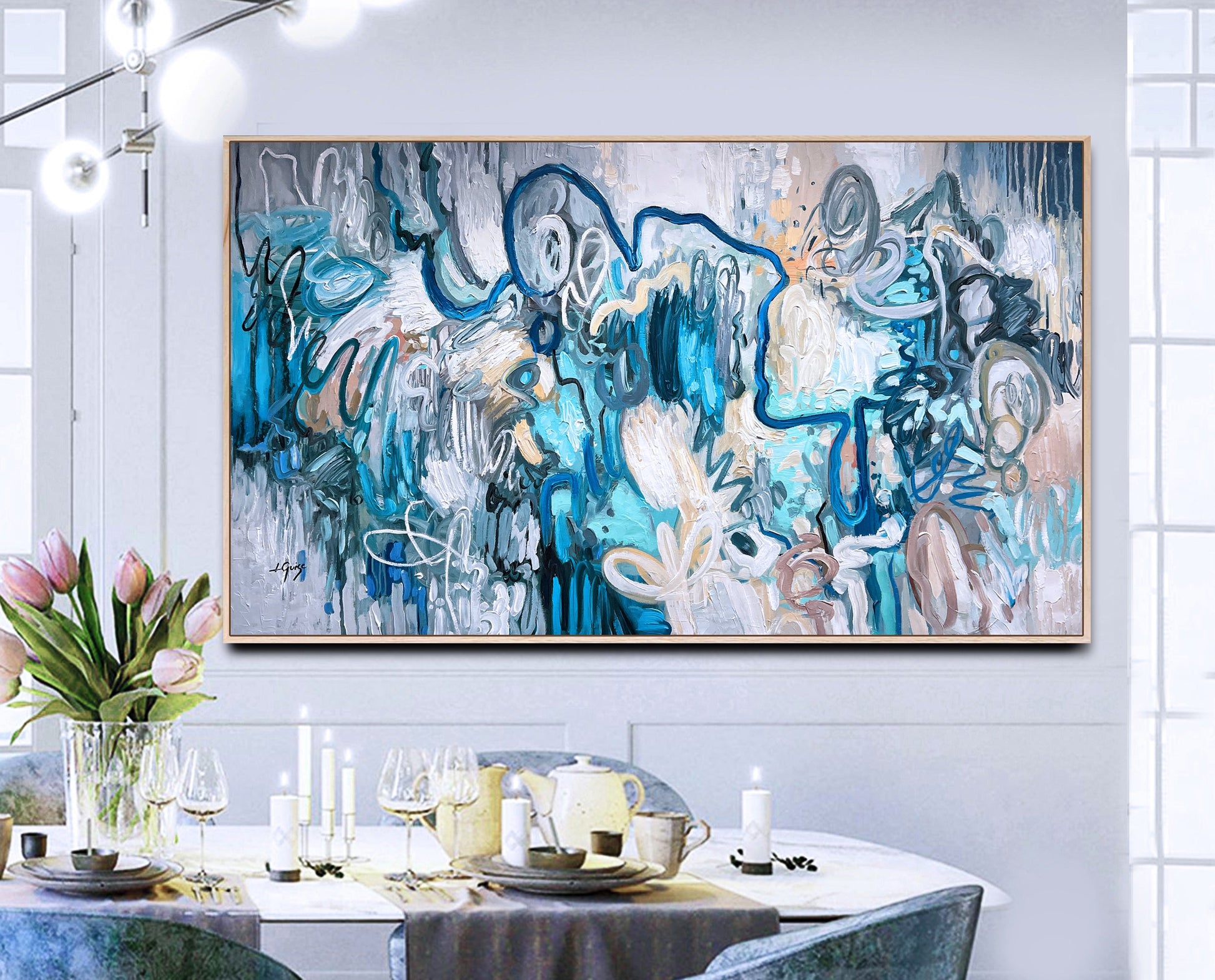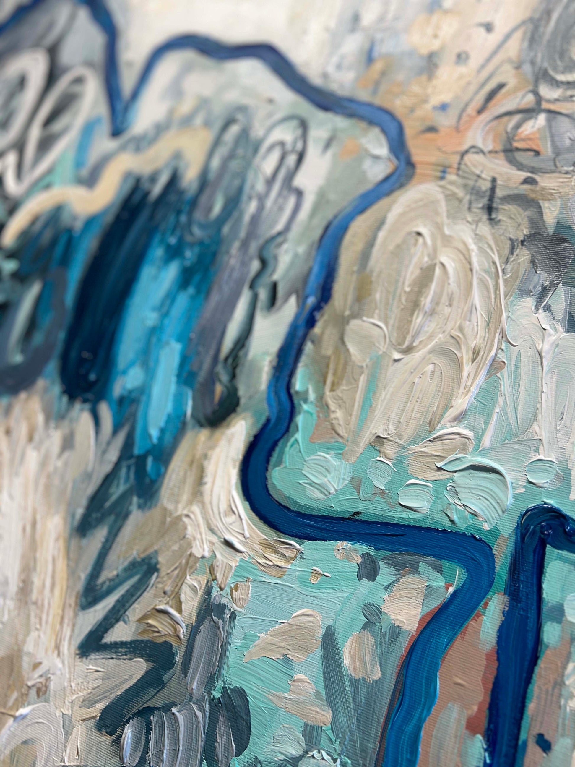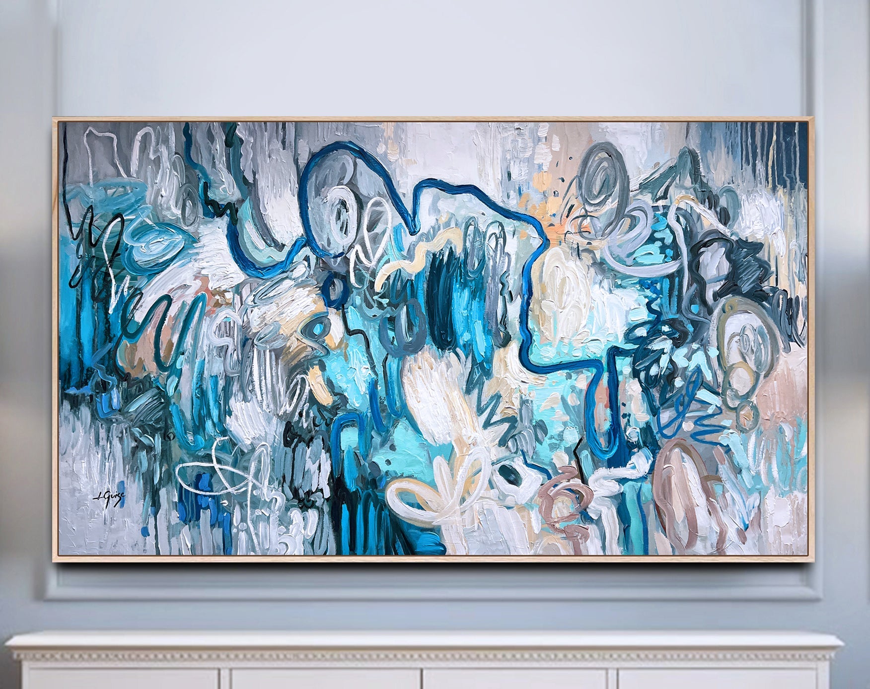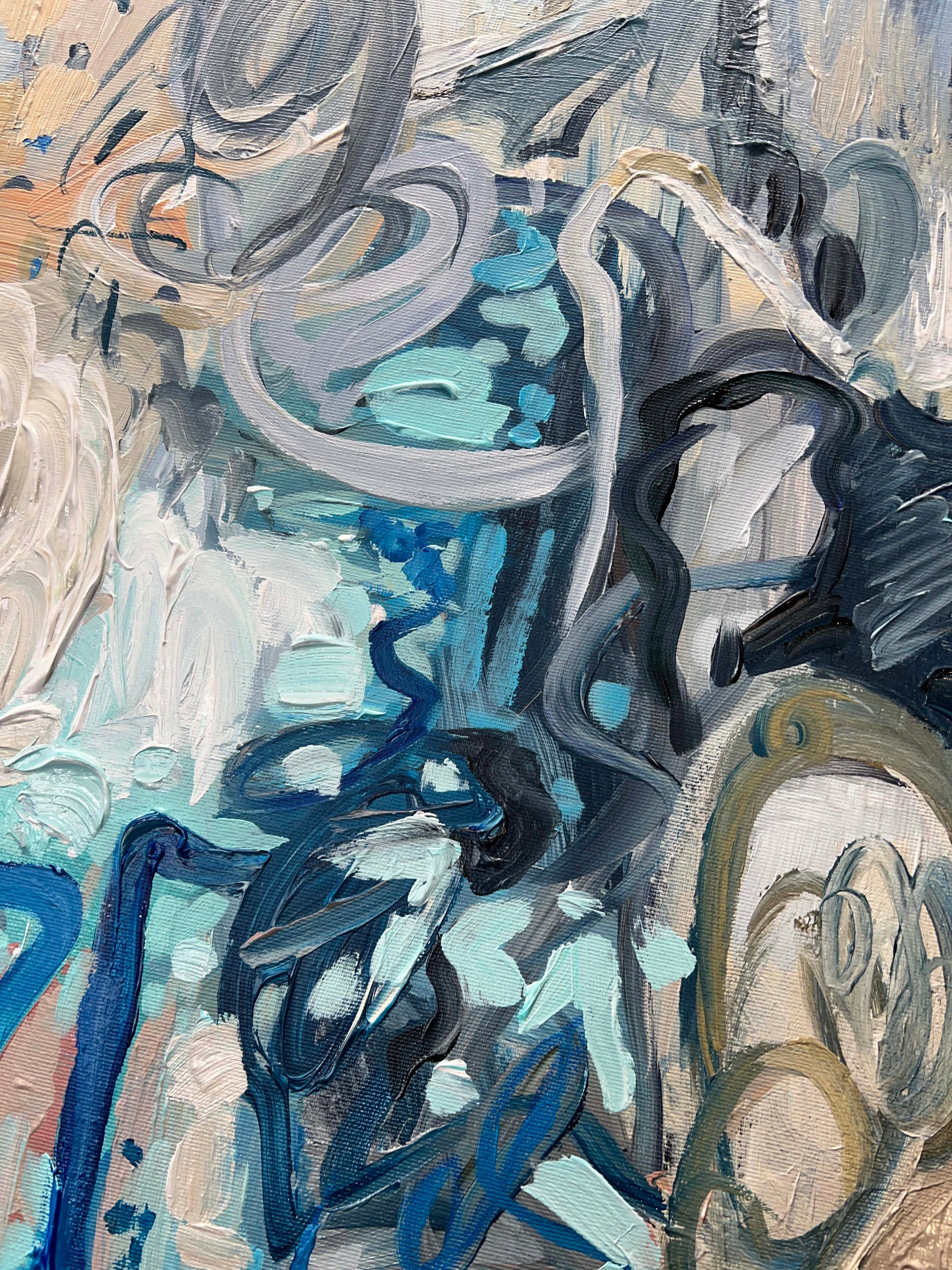 Painted in harmonious shades of blue, teal, and soft neutrals, the composition evokes the feeling of being carried within a gentle current: fluid, immersive, and full of motion.