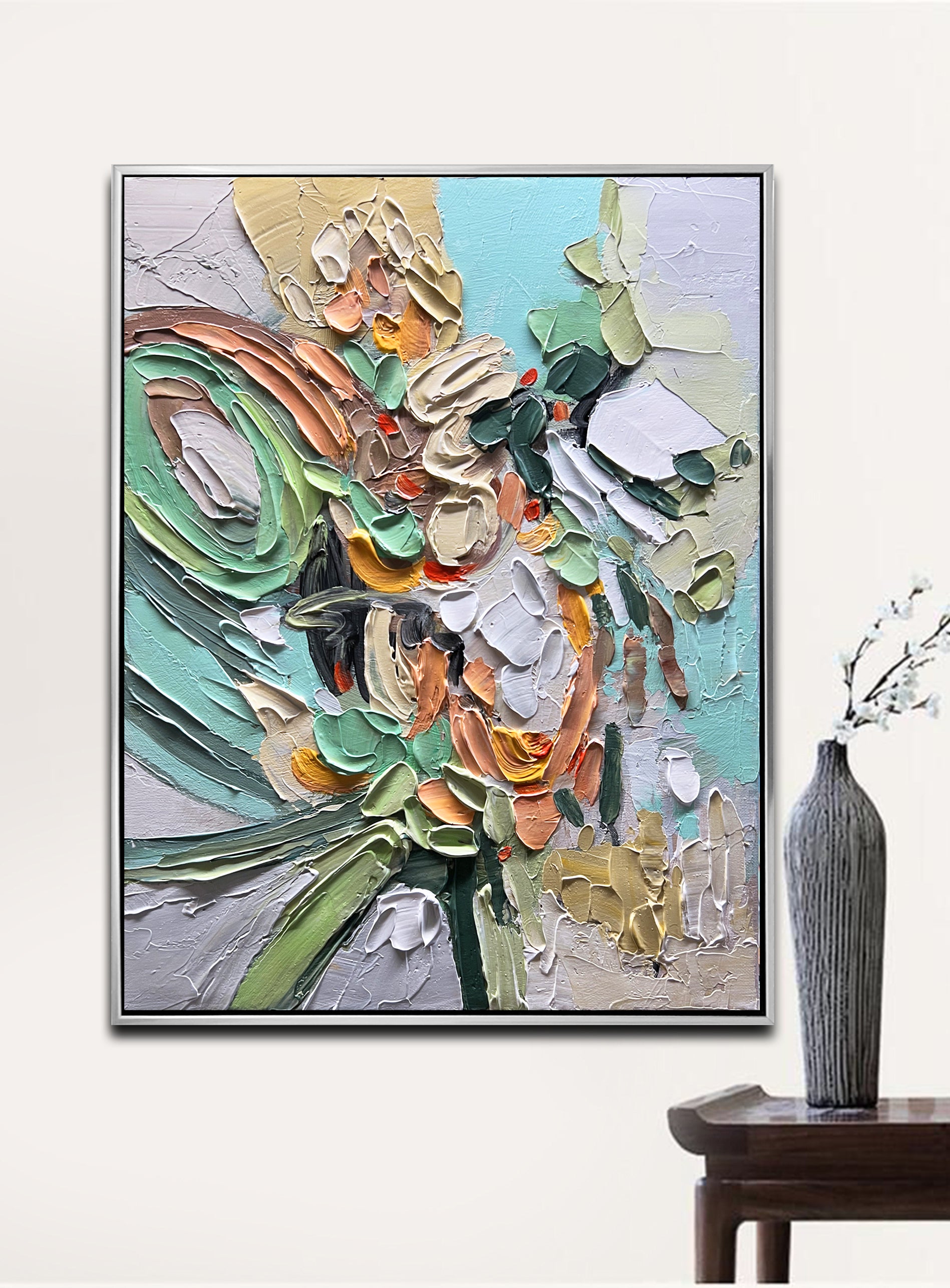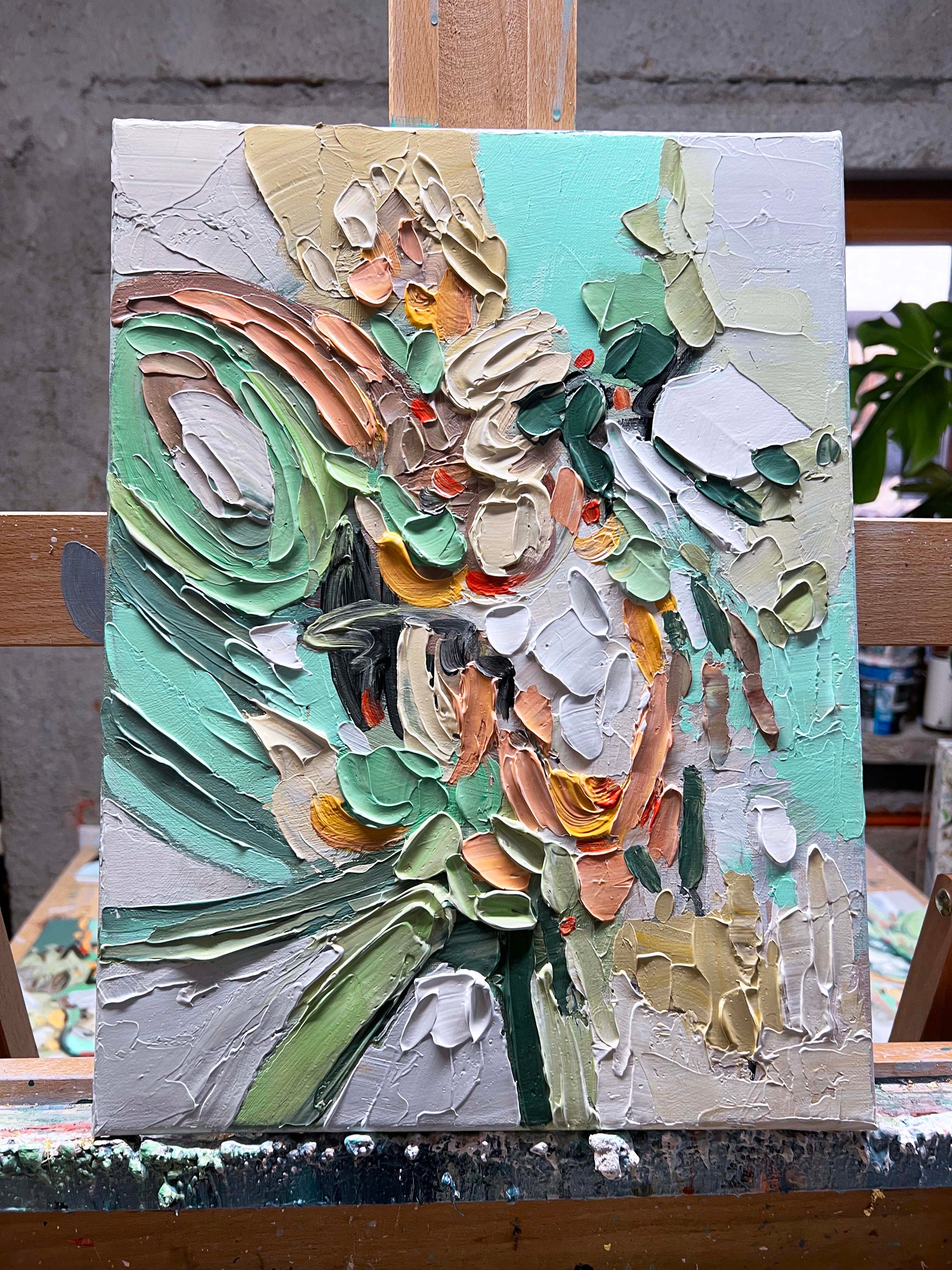 The painting feels like a cool breeze drifting through tender new leaves, swirling with hints of mint, peach, and cream that open across the canvas like delicate petals.