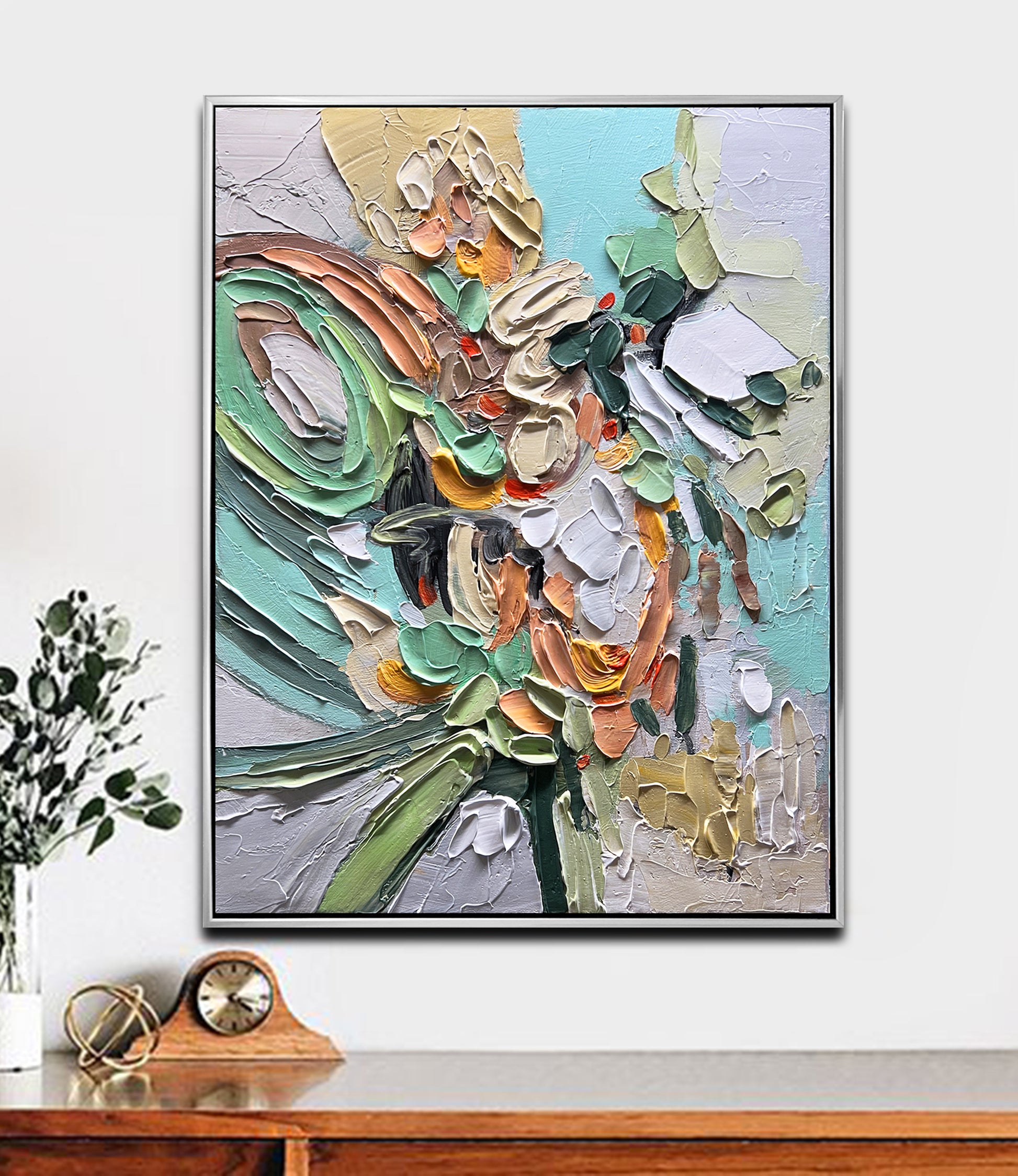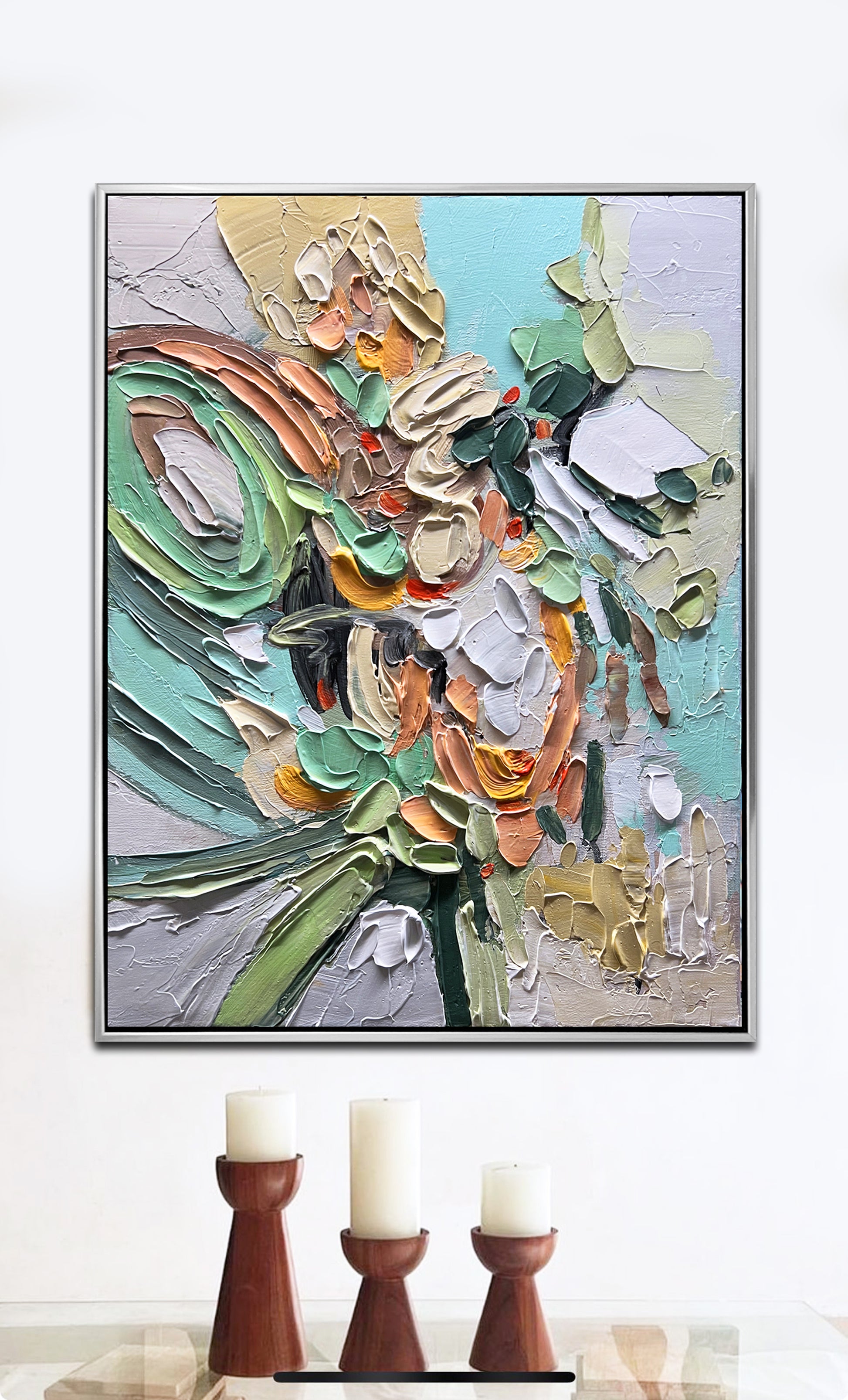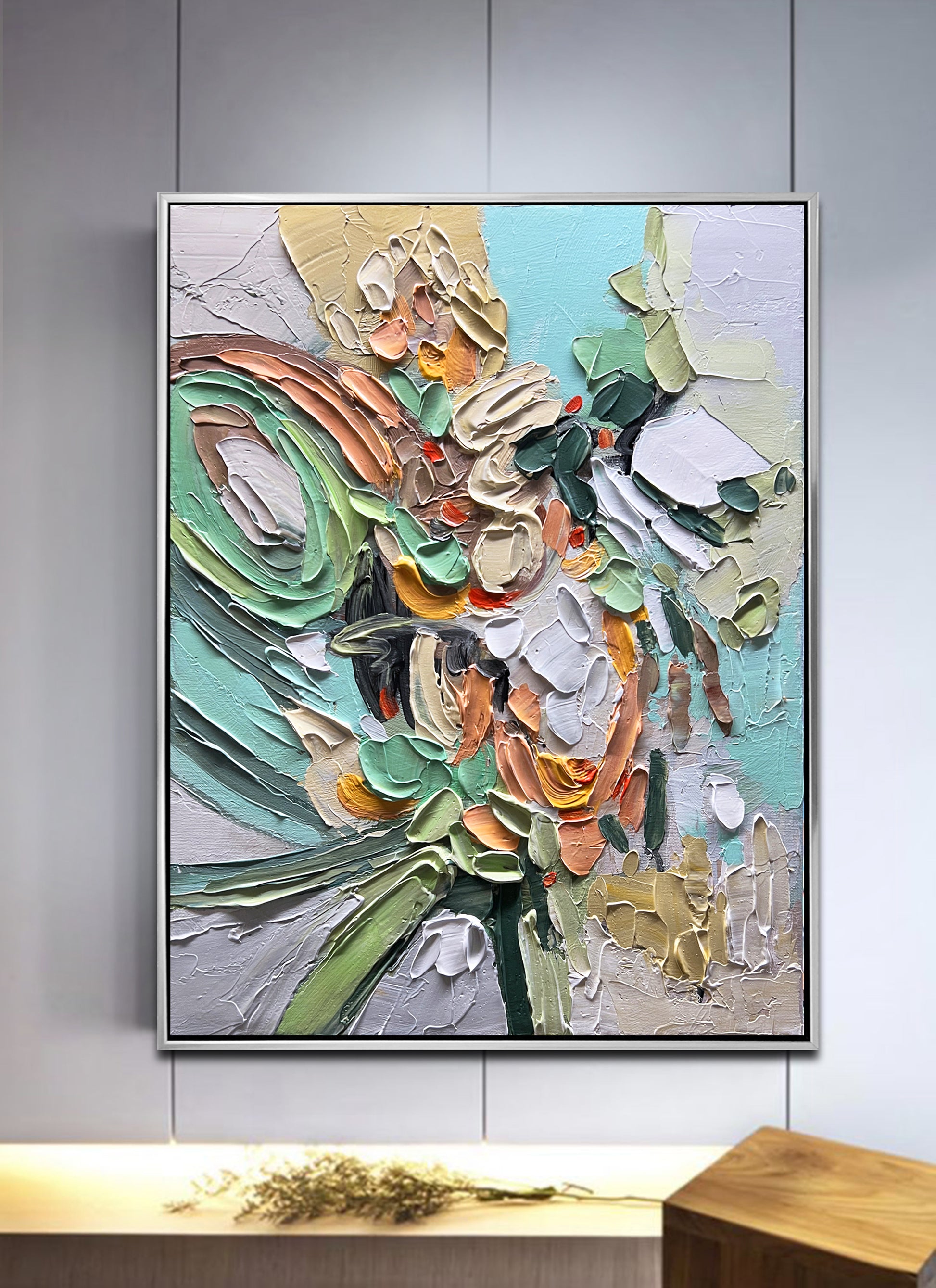 The artwork is beautifully framed in a silver frame, adding a refined, contemporary glow that complements the painting’s airy palette.