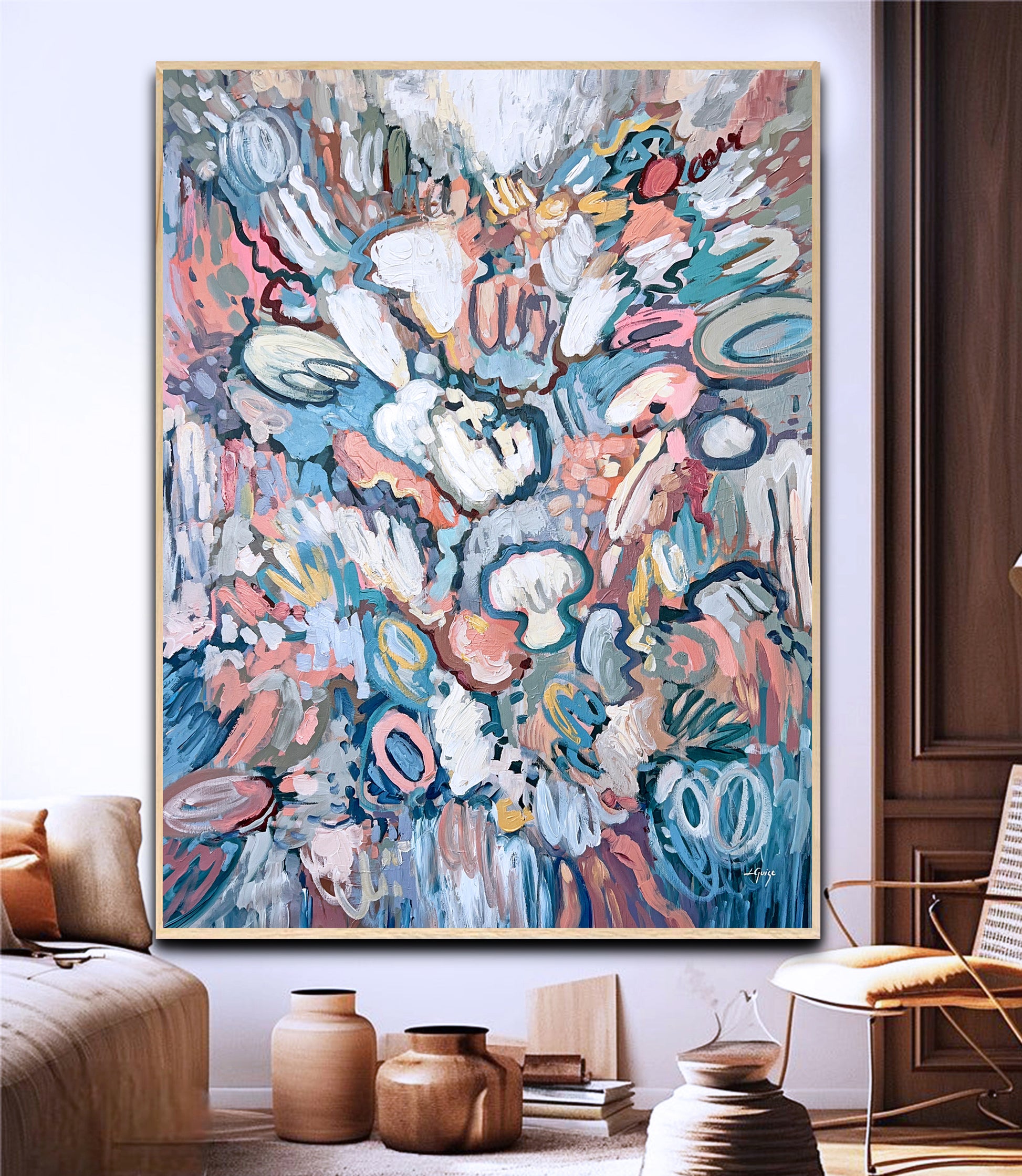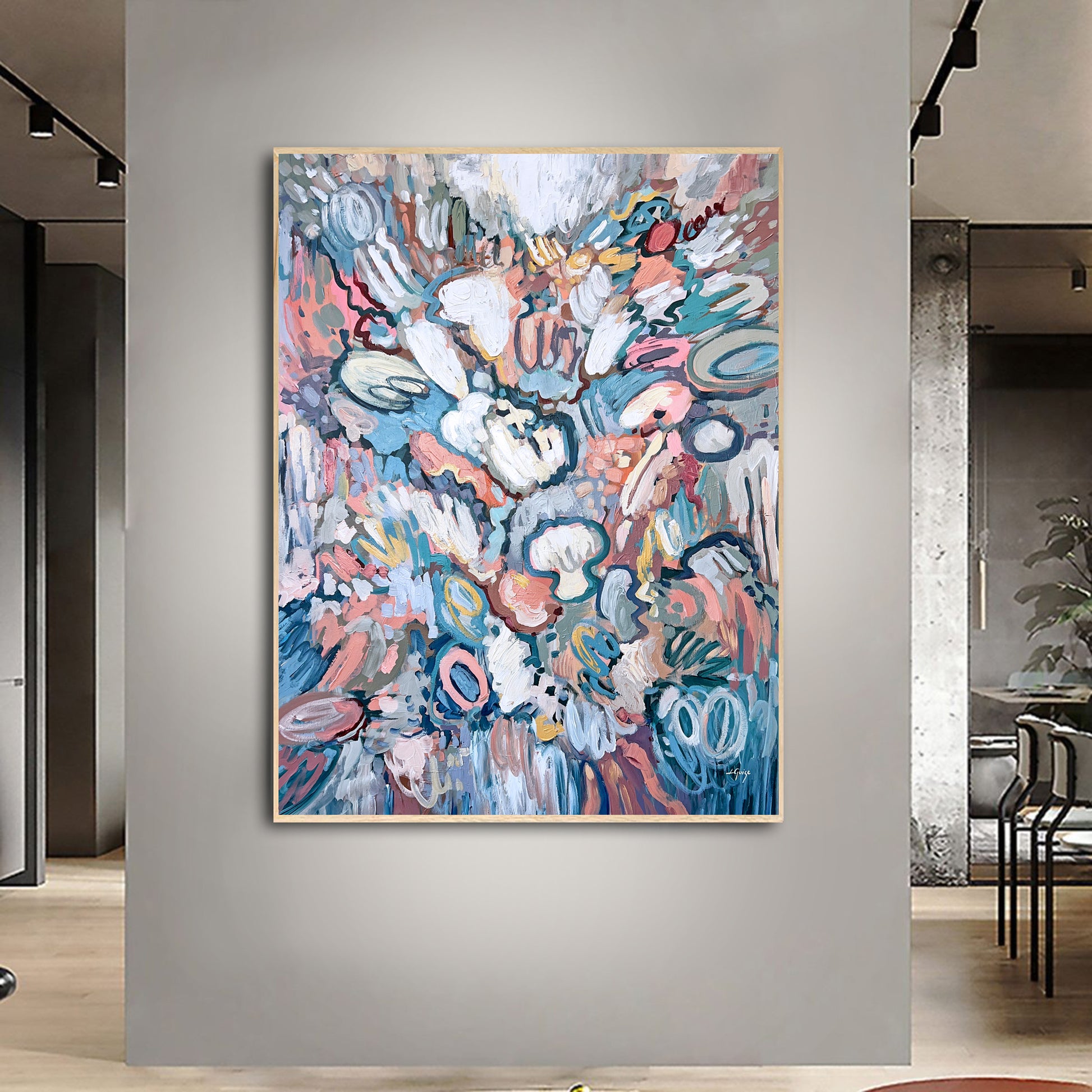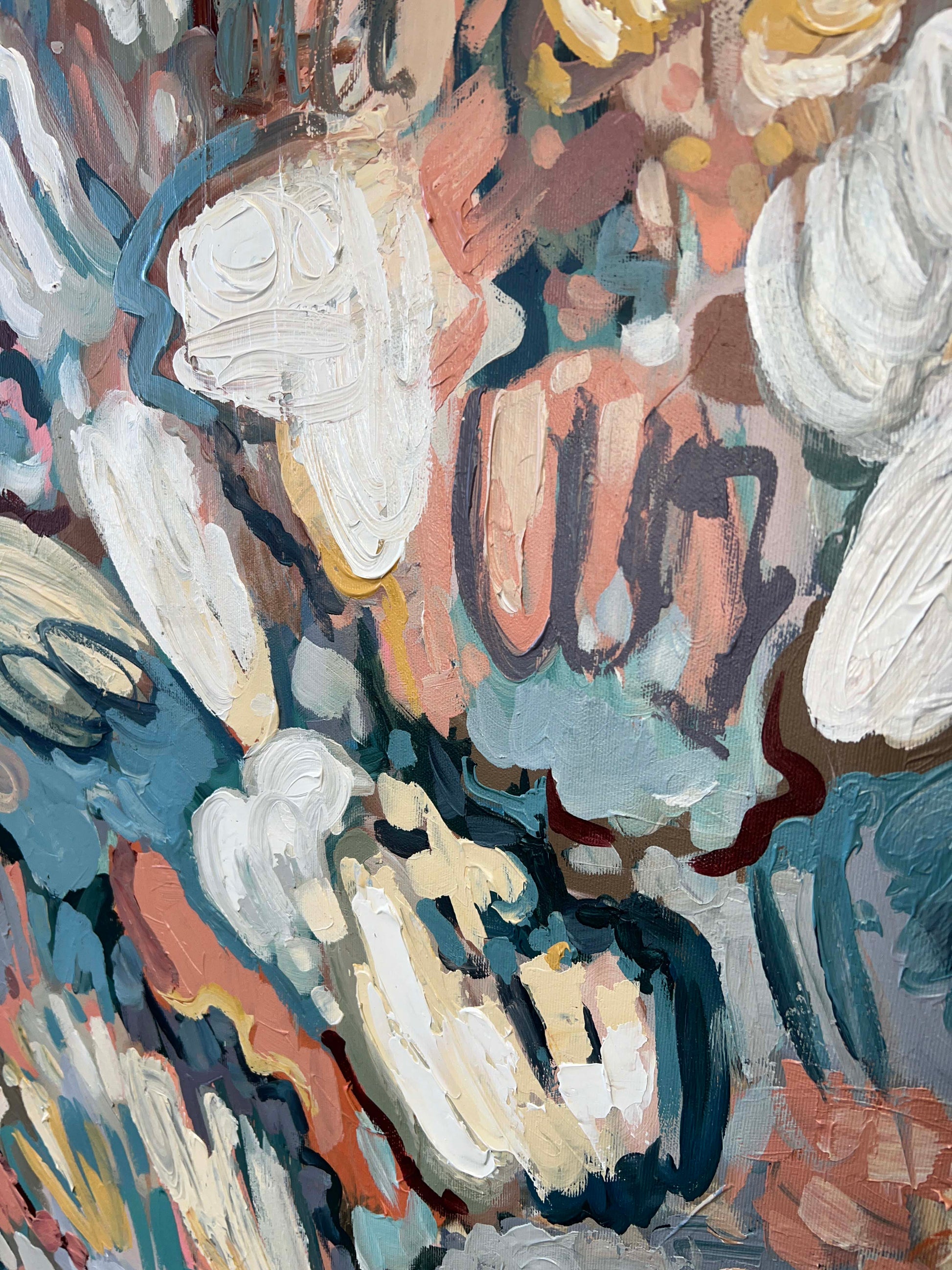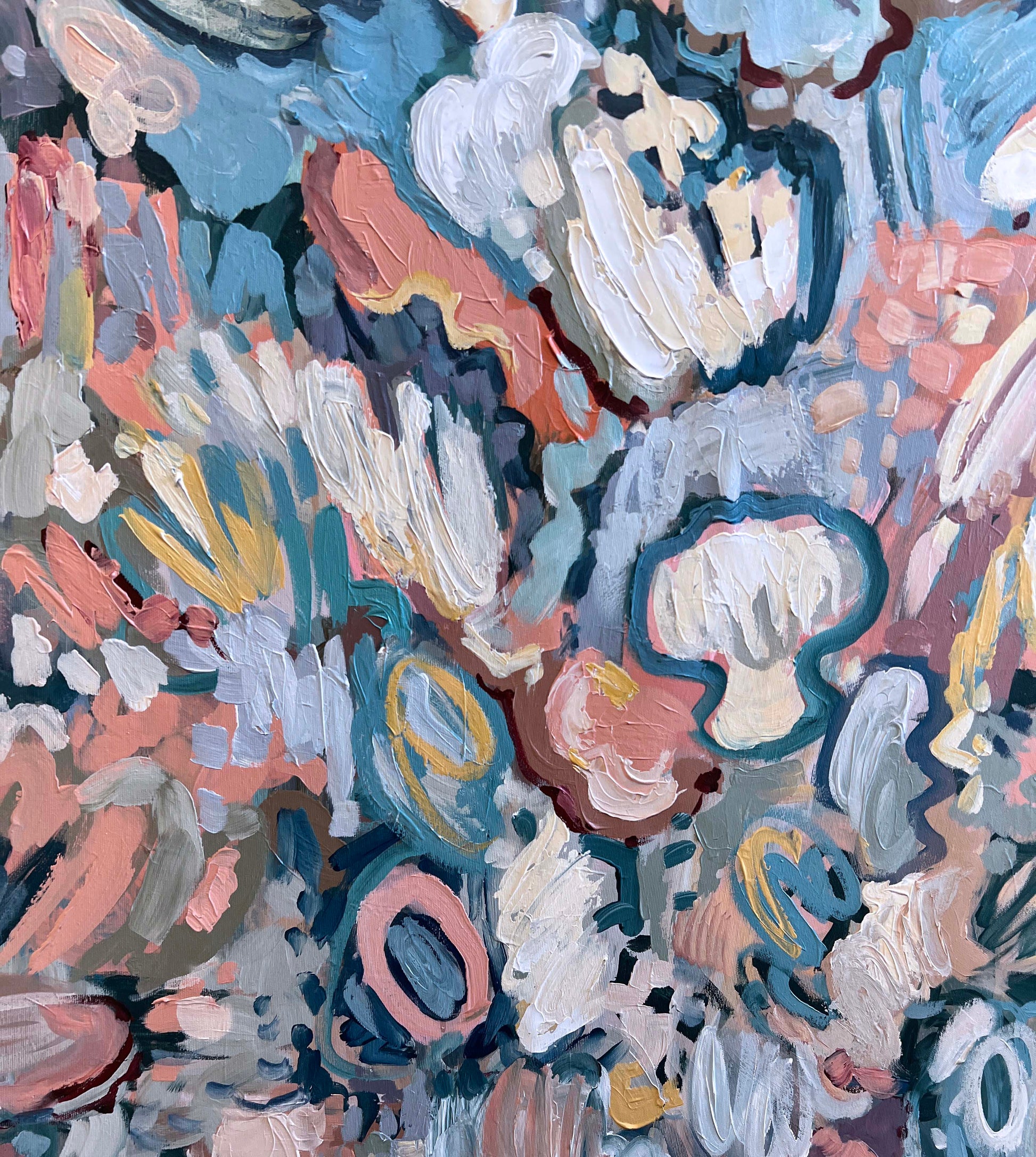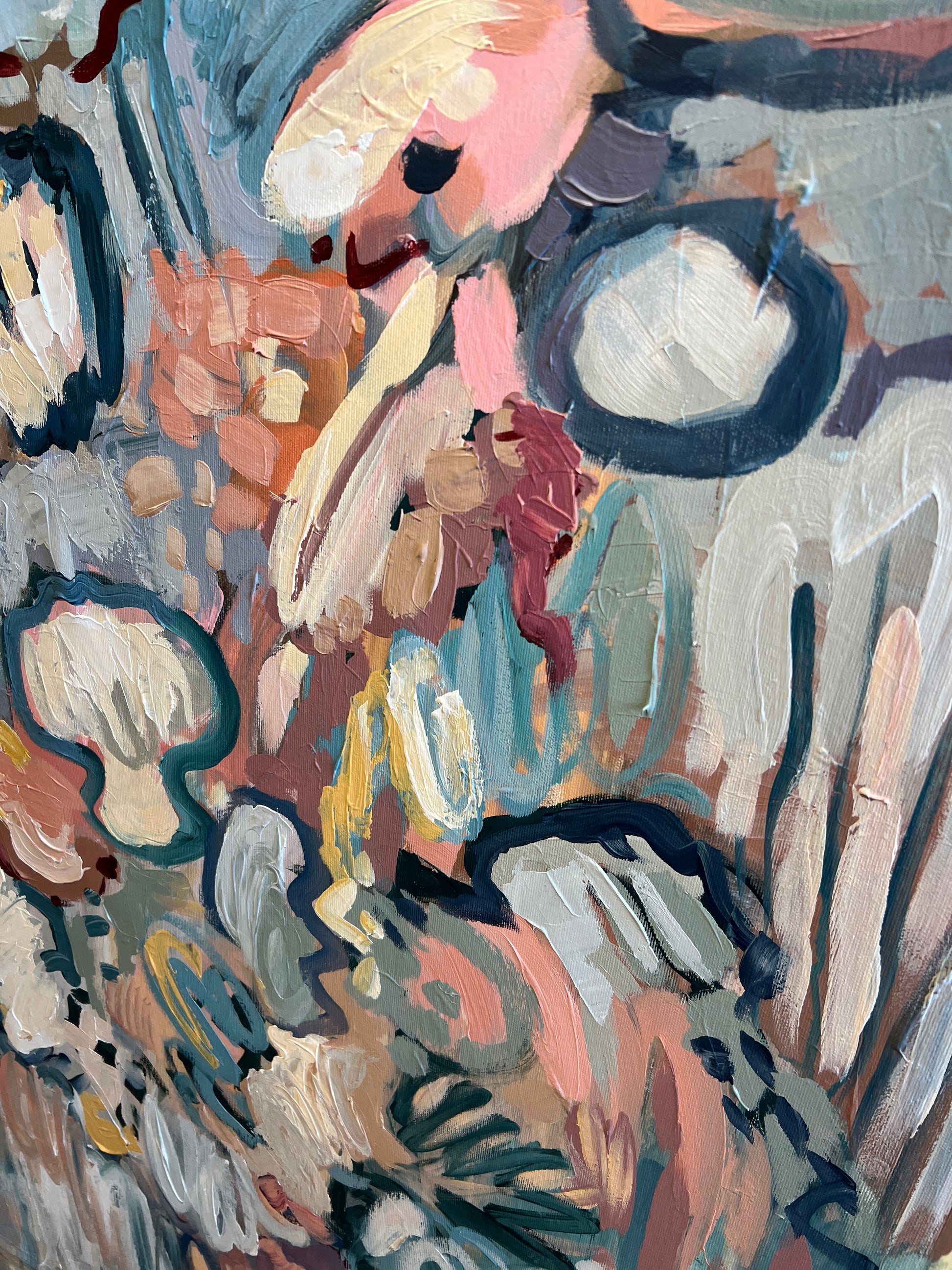 Up close, the textured brushwork and layered paint reveal depth, spontaneity, and a sense of freedom, as if the colors are drifting and unfolding across the canvas.