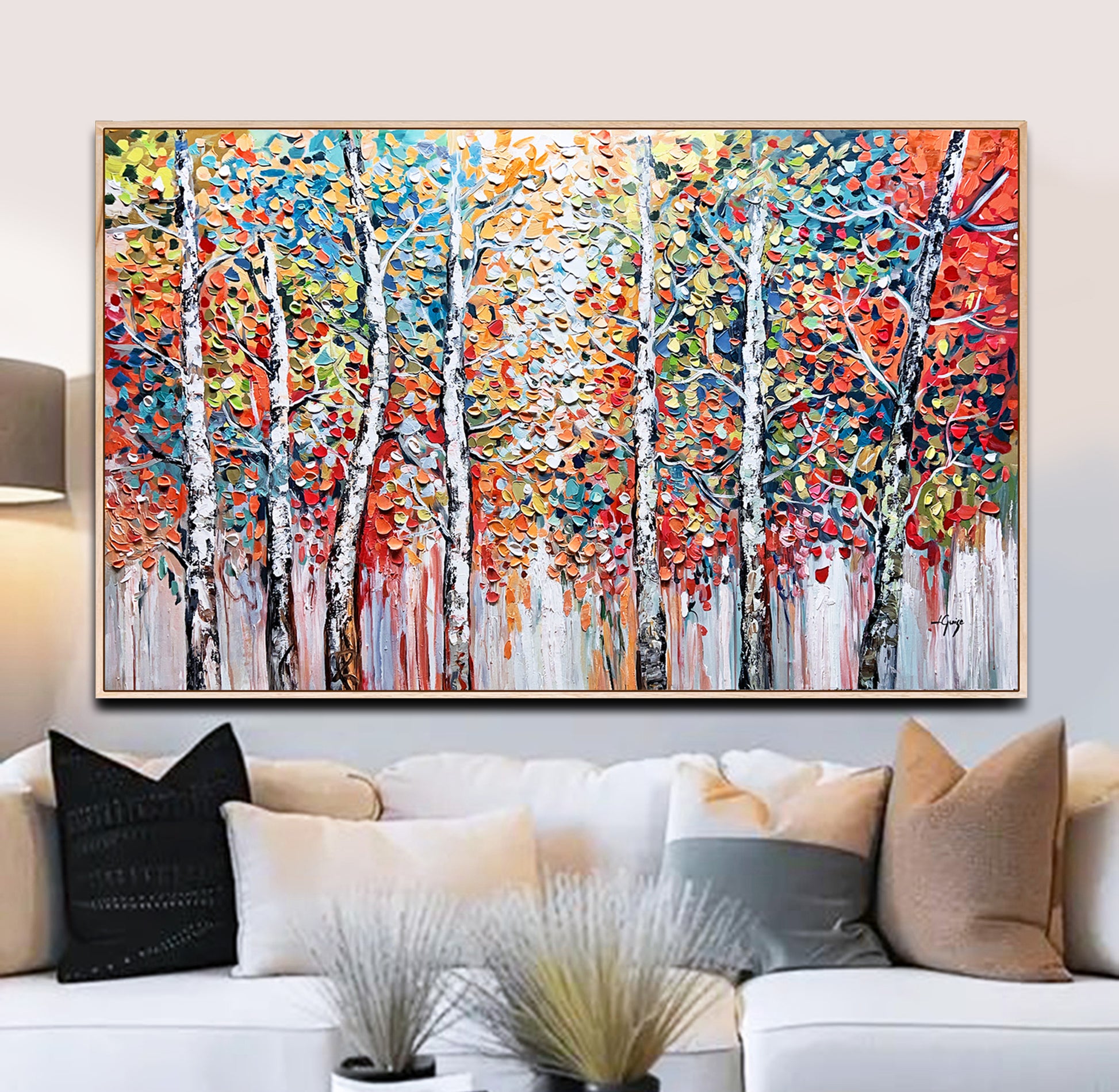 Thick palette-knife strokes create vibrant layers of red, orange, yellow, green, and blue leaves dancing around tall white aspen trees.