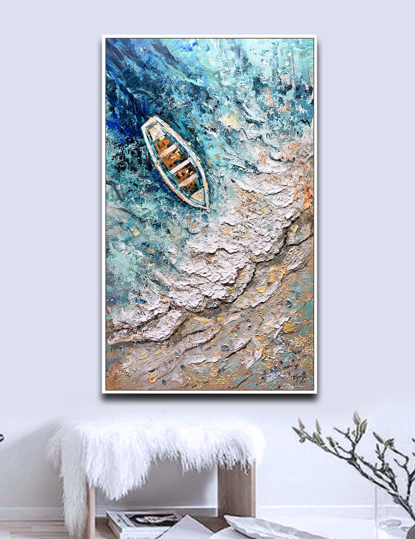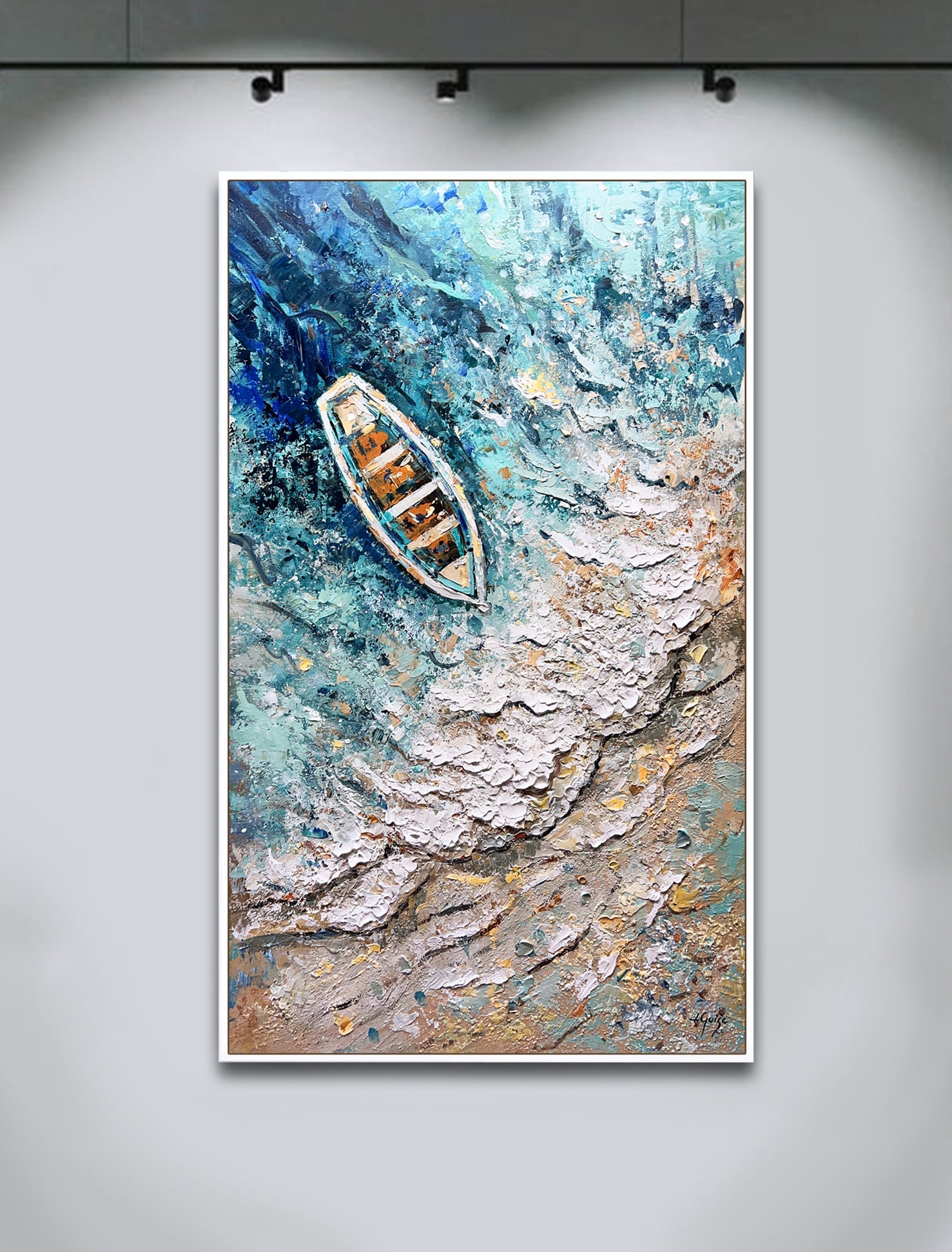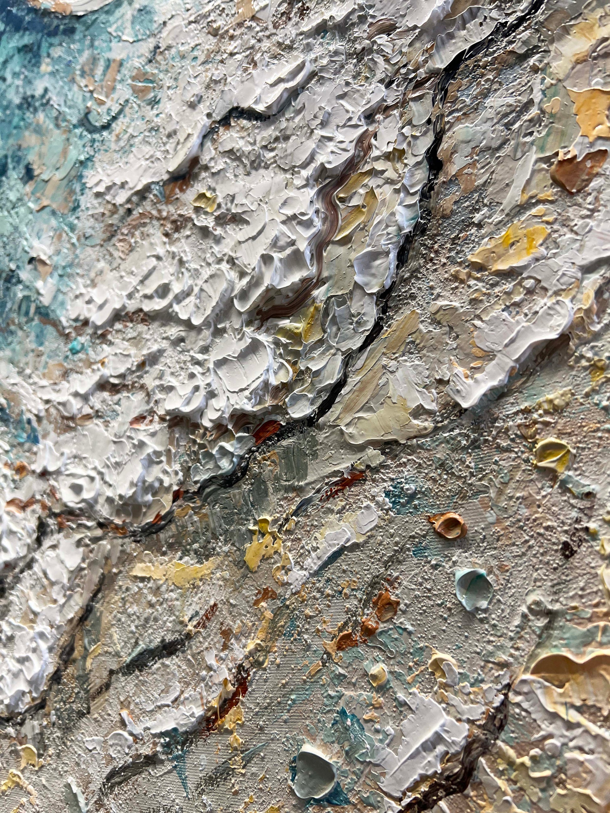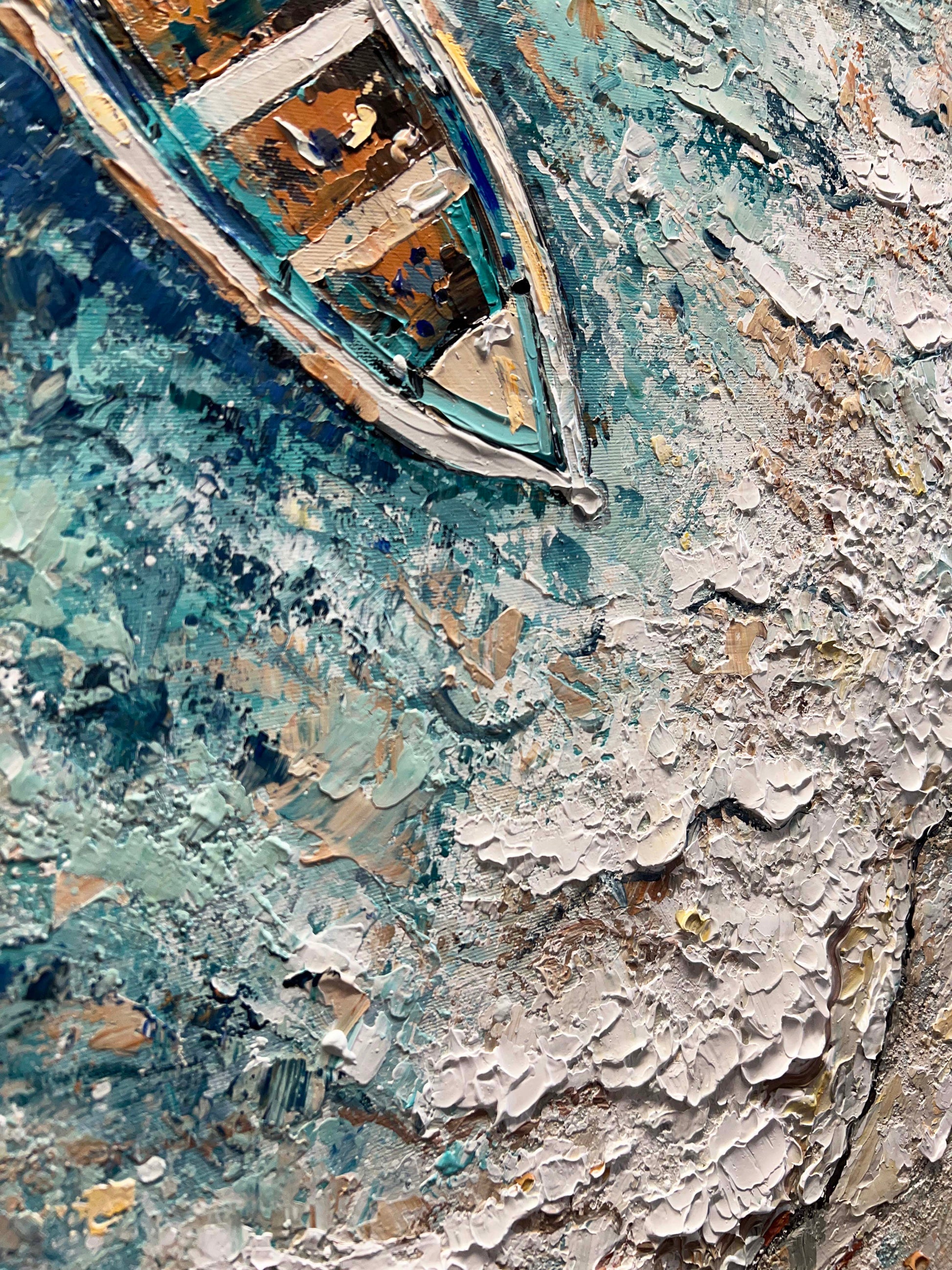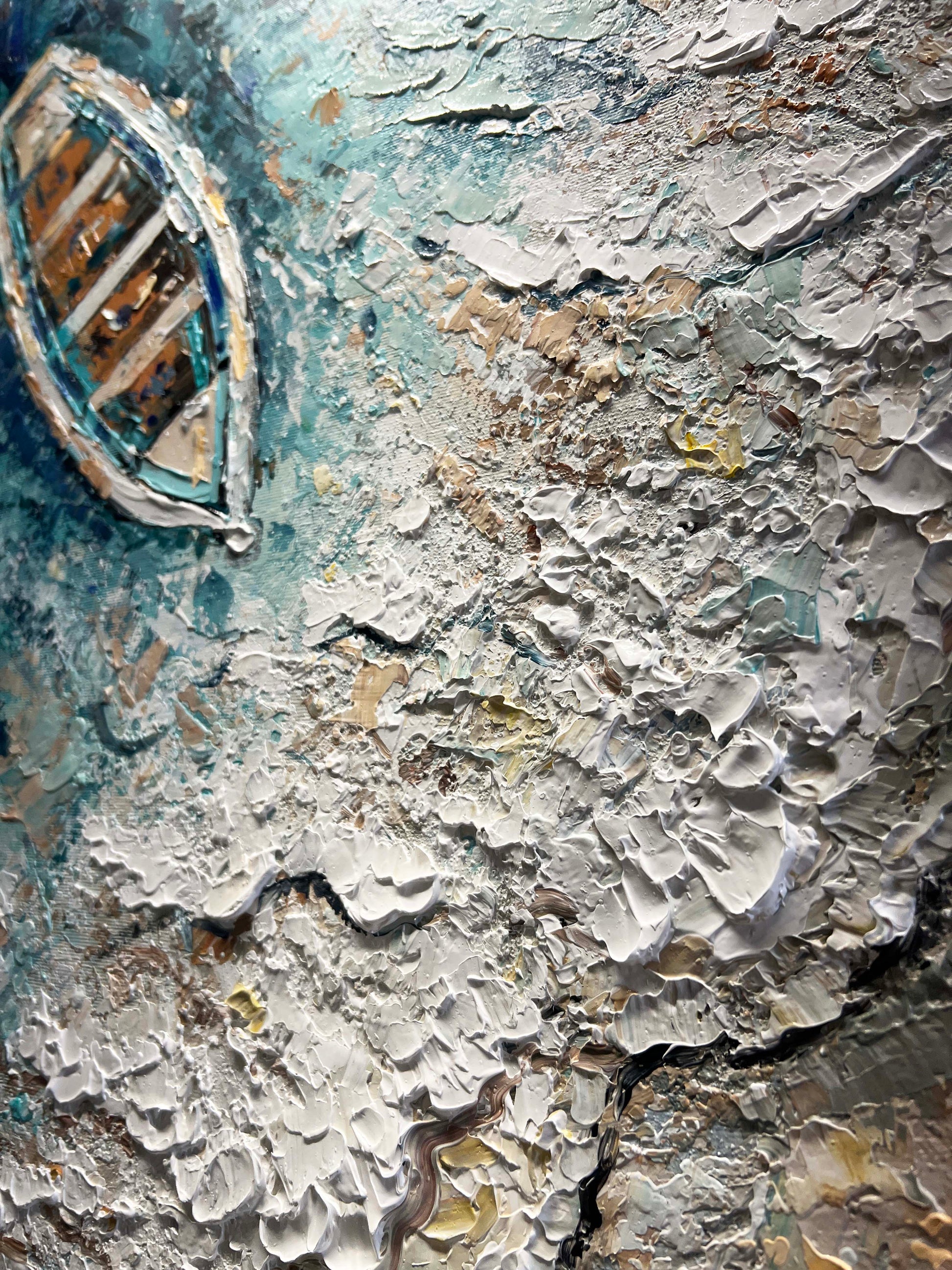 The textured technique brings the scene to life, not only visually but also through touch, allowing the viewer to feel the depth of the waves and the soft grain of the sandy shore.