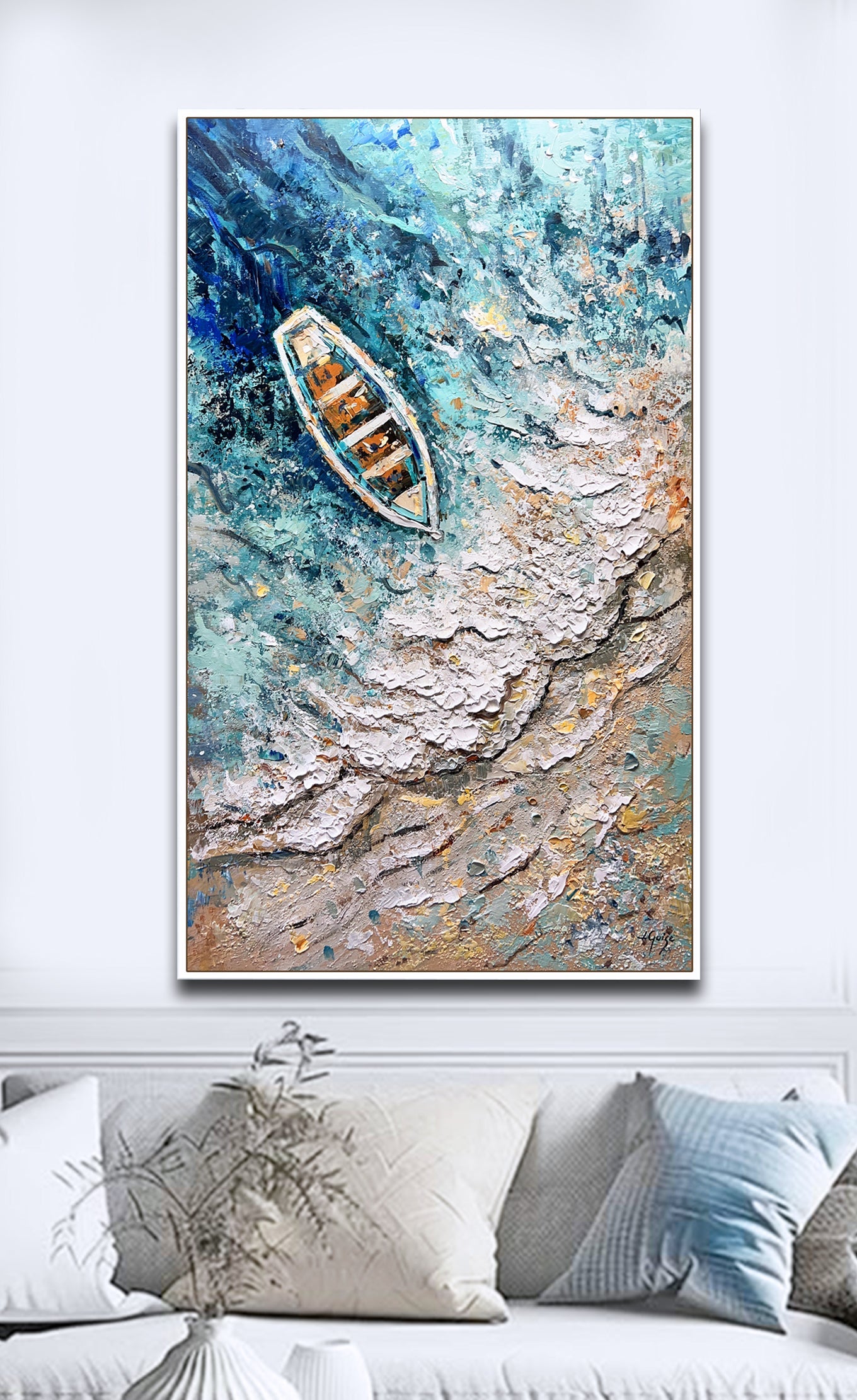 "Sailing Into Light" is a serene and evocative seascape, painted in calming shades of teal, white, and warm sand tones.