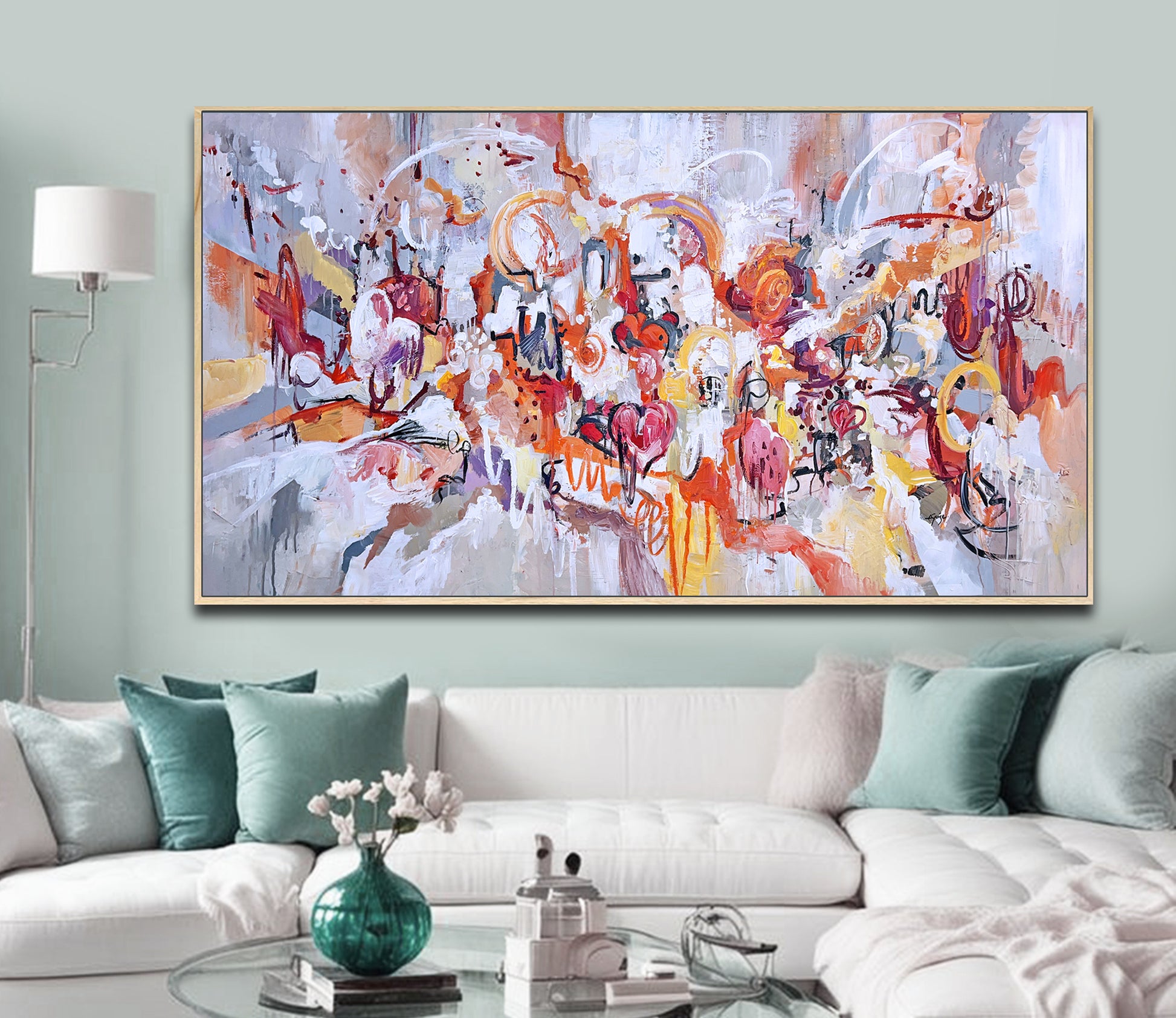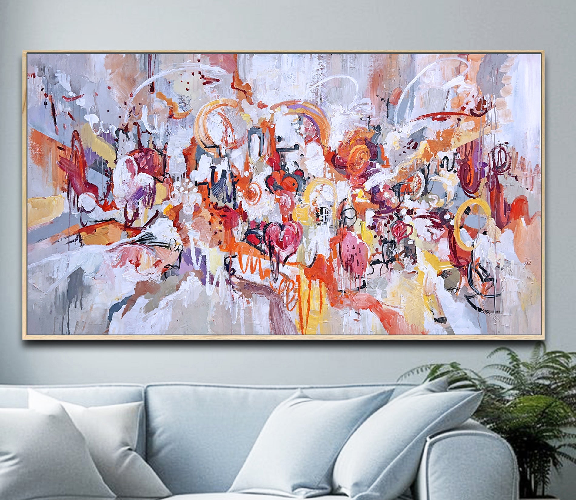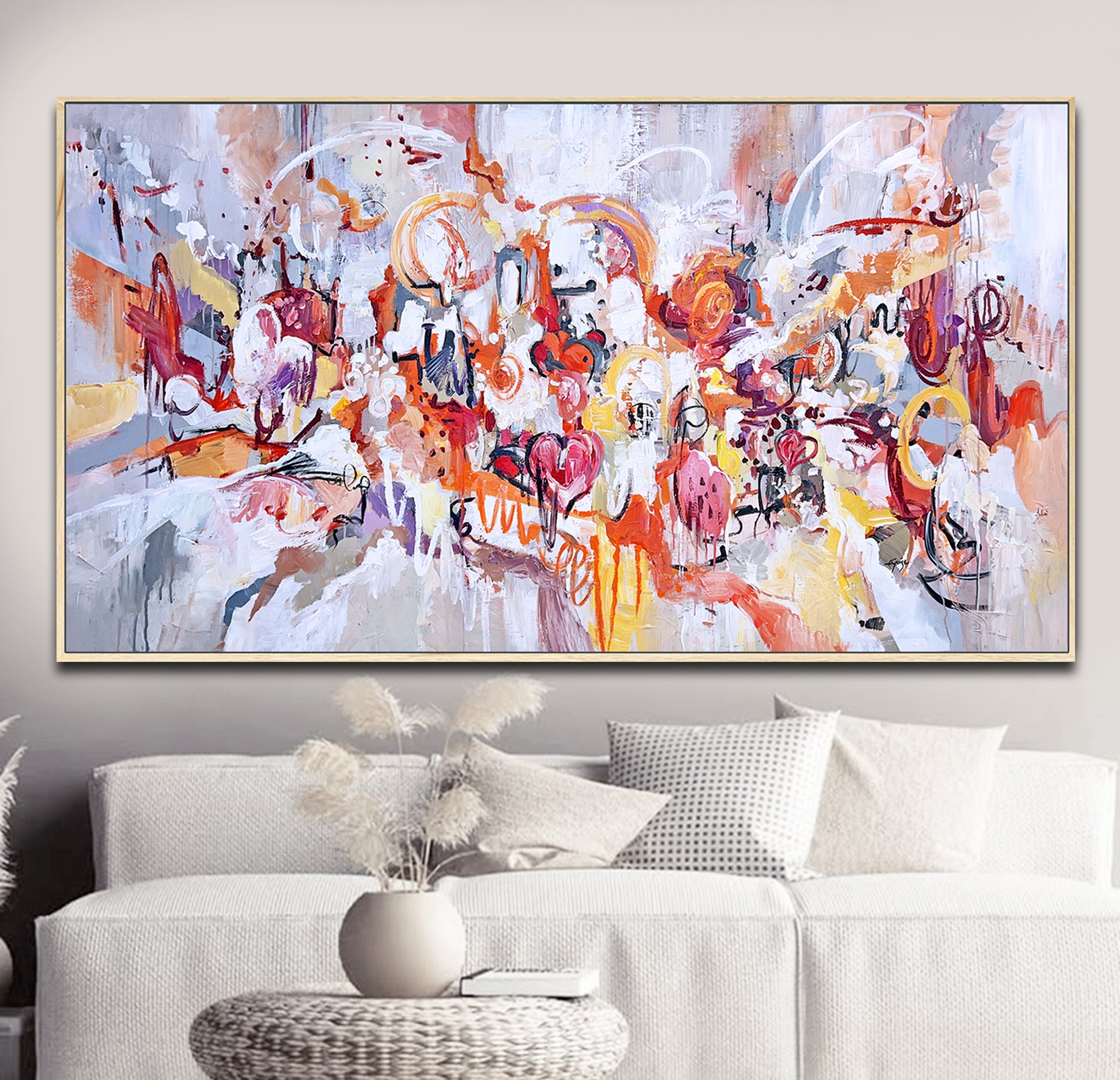 "Scarlet Flow" is a striking large abstract painting, bursting with vibrant hues of scarlet, crimson, orange, and yellow, creating a dynamic, fiery movement across the canvas. These warm tones flow and swirl with energy, while cool gray tones soften and ground the composition, providing a harmonious balance. The bold contrasts between the red palette and calming grays evoke both intensity and tranquility.