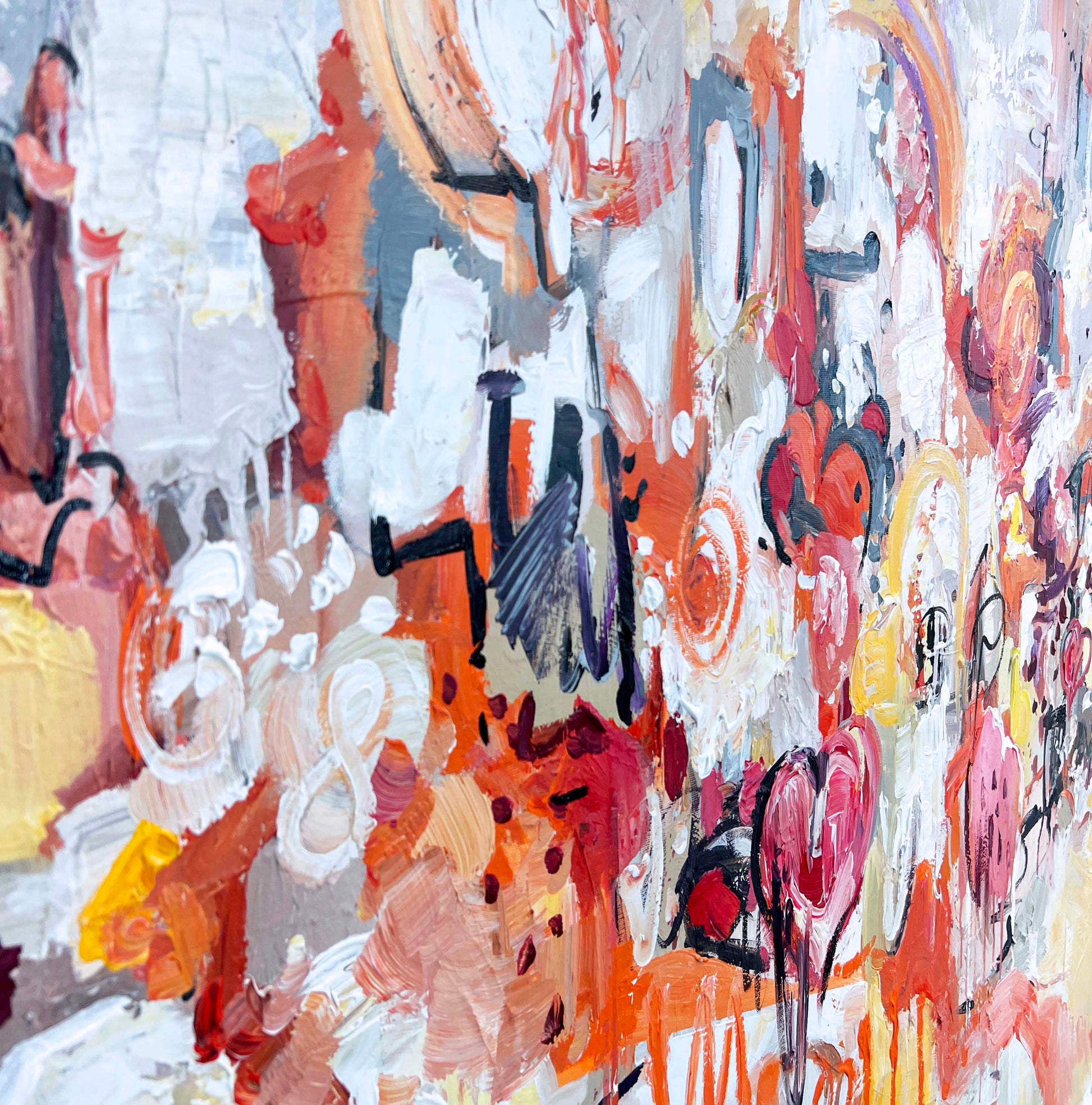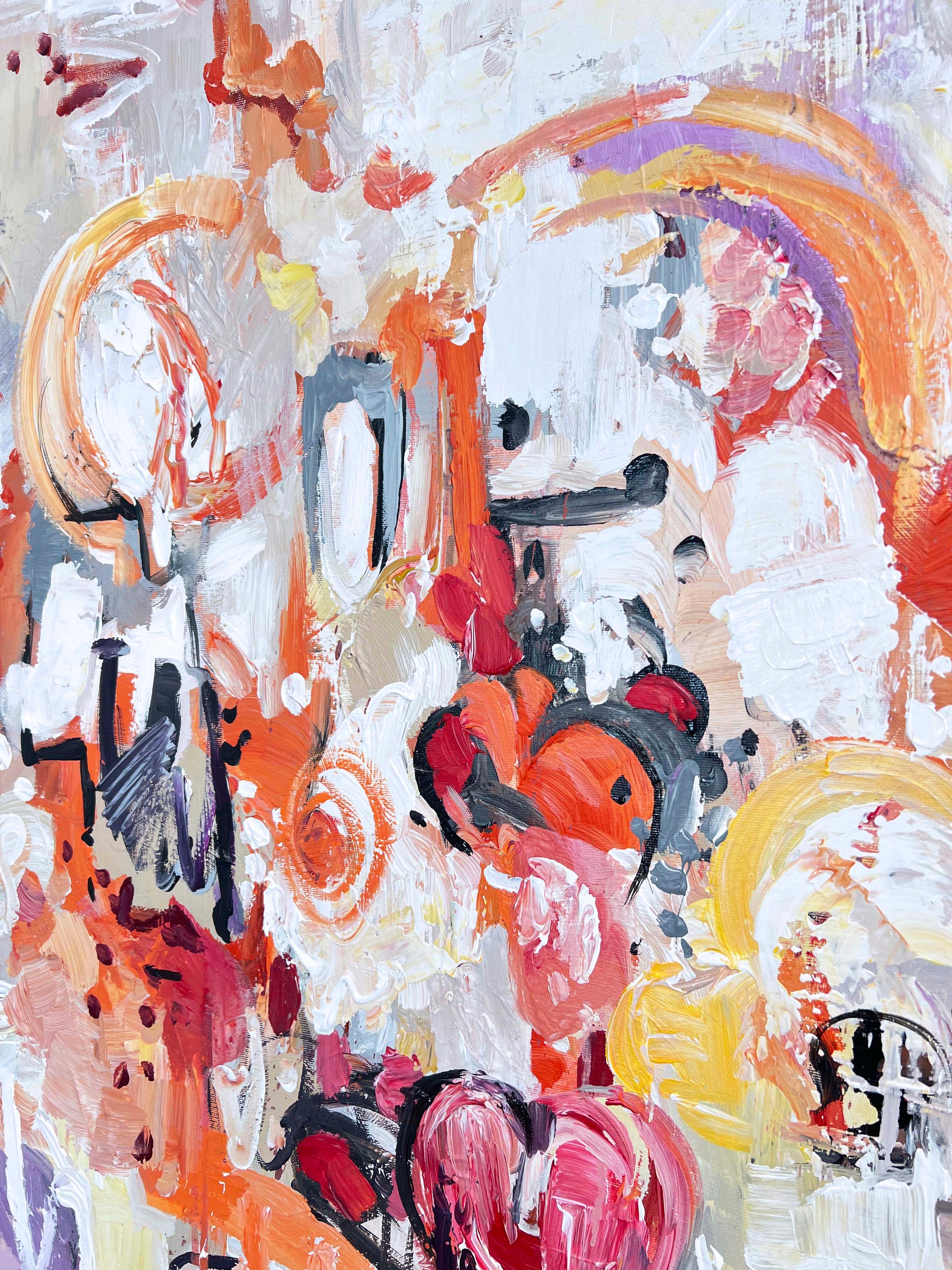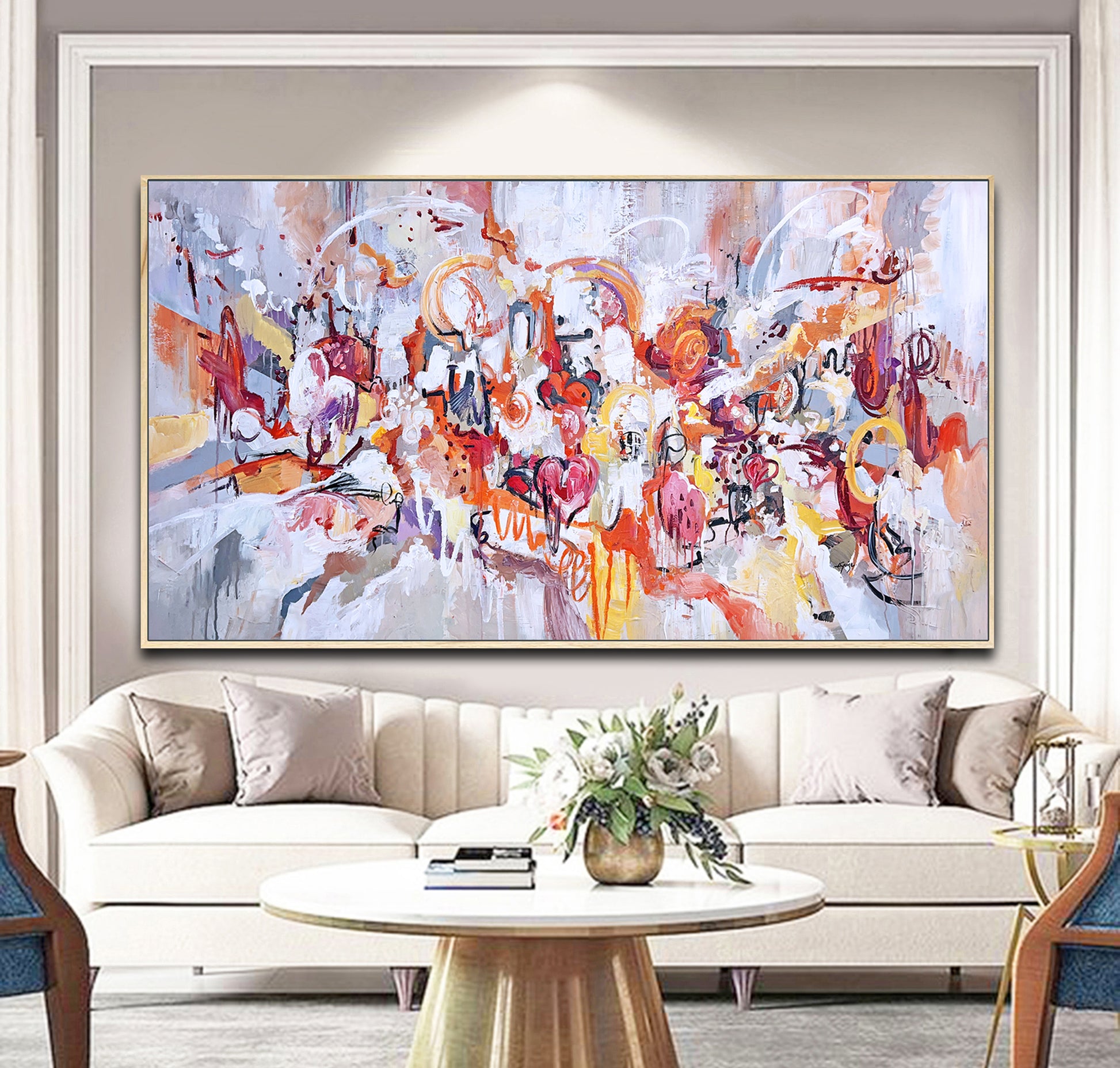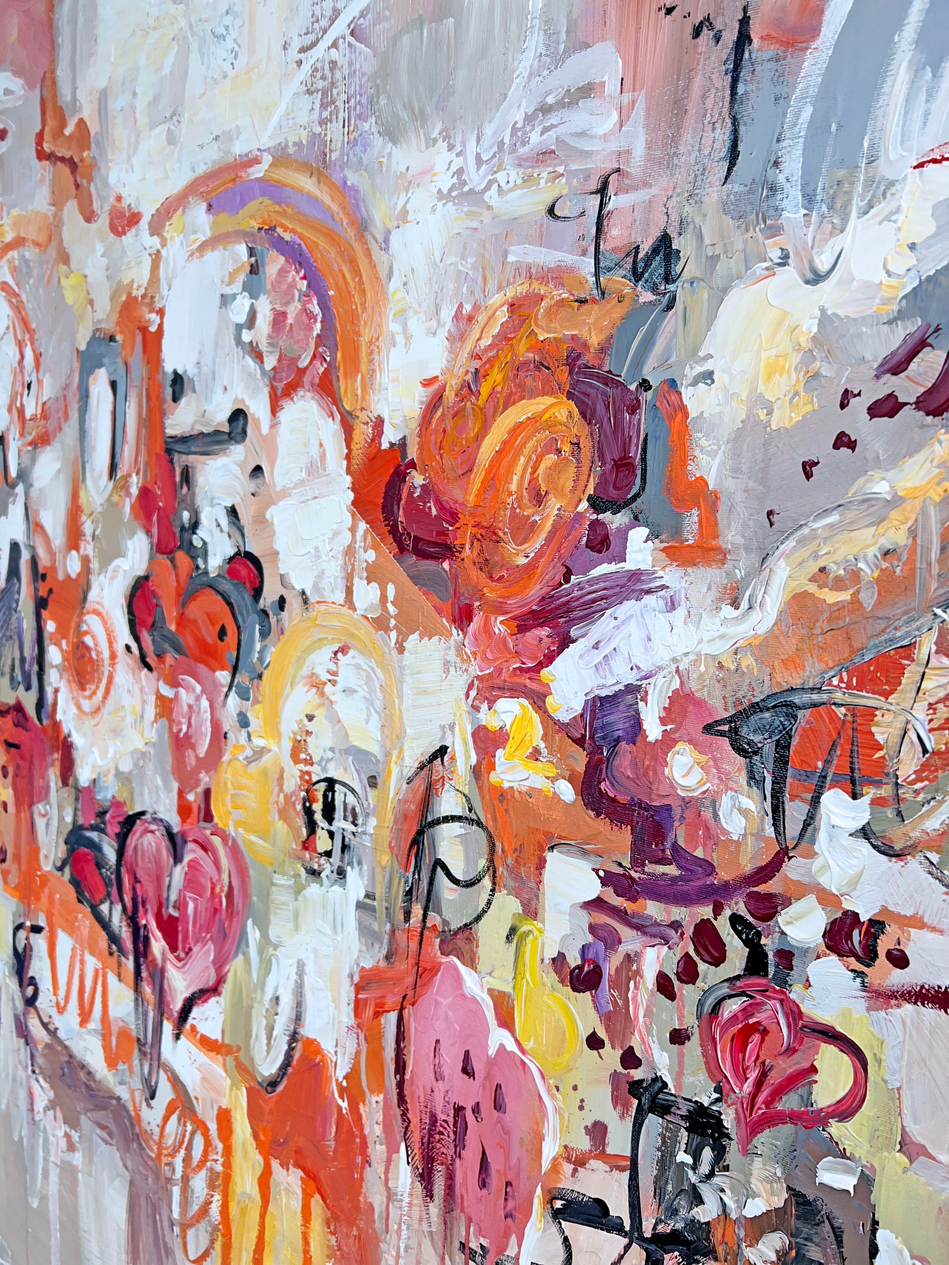 "Scarlet Flow" is a striking large abstract painting, bursting with vibrant hues of scarlet, crimson, orange, and yellow, creating a dynamic, fiery movement across the canvas. These warm tones flow and swirl with energy, while cool gray tones soften and ground the composition, providing a harmonious balance. The bold contrasts between the red palette and calming grays evoke both intensity and tranquility.