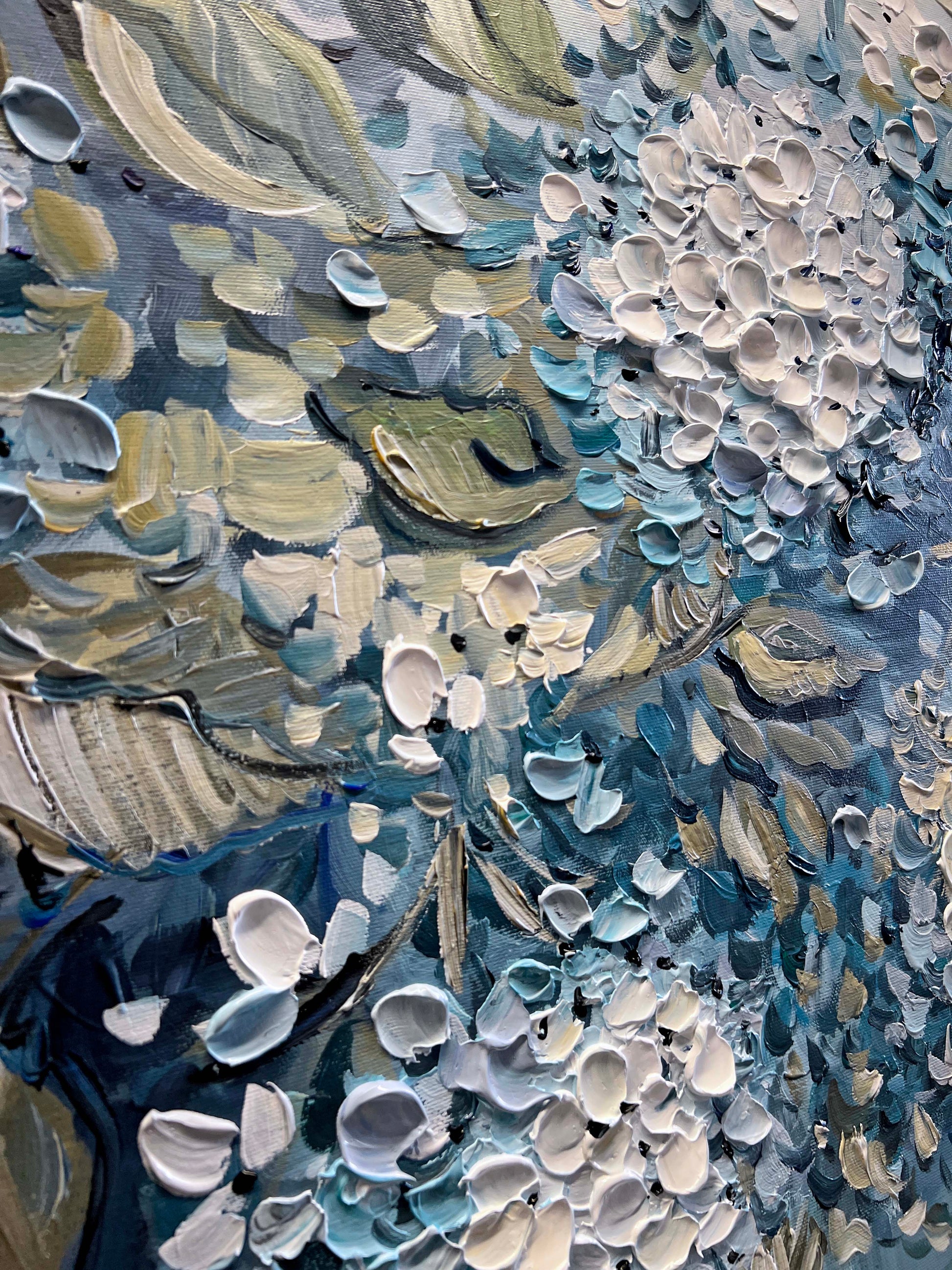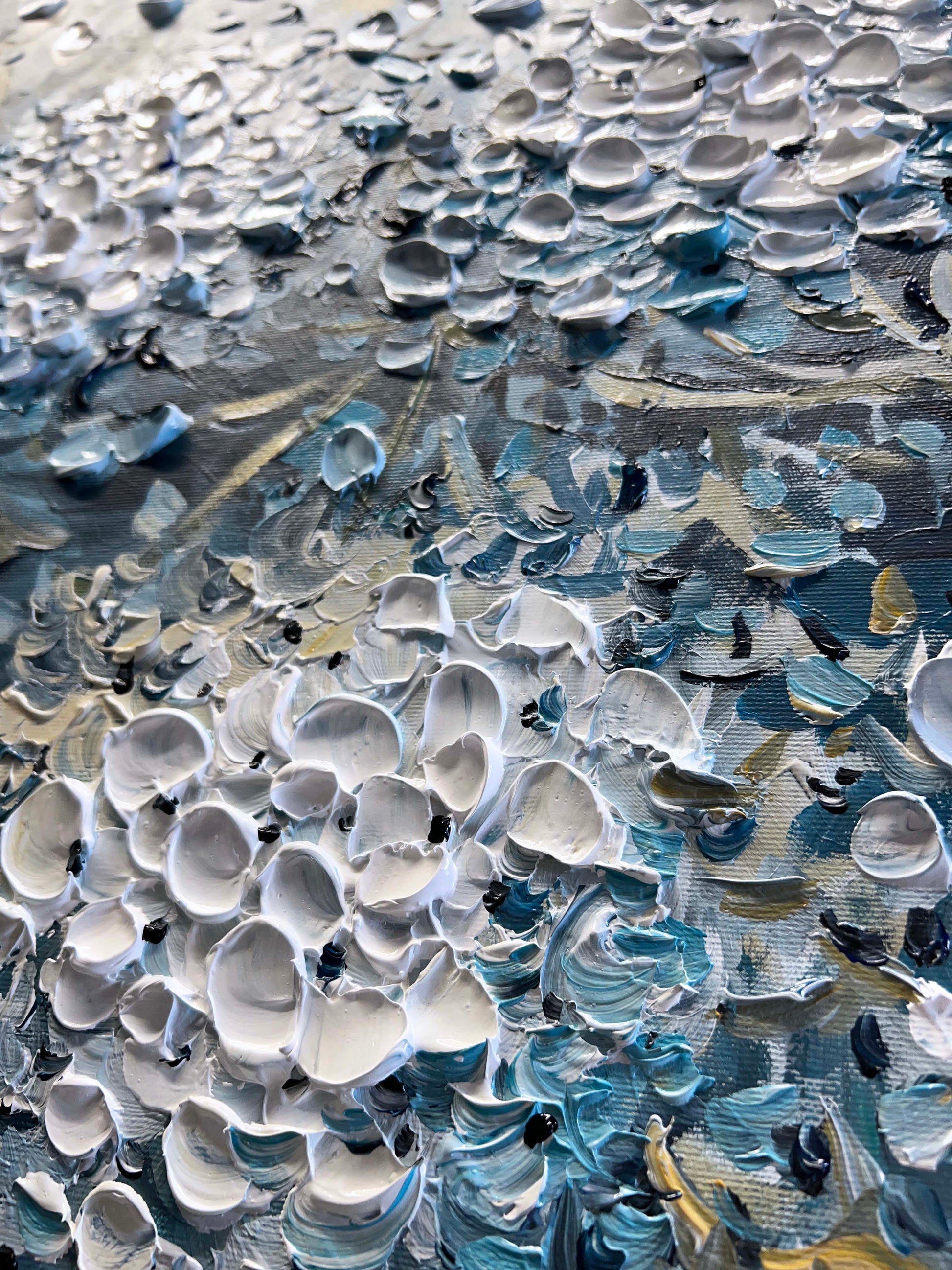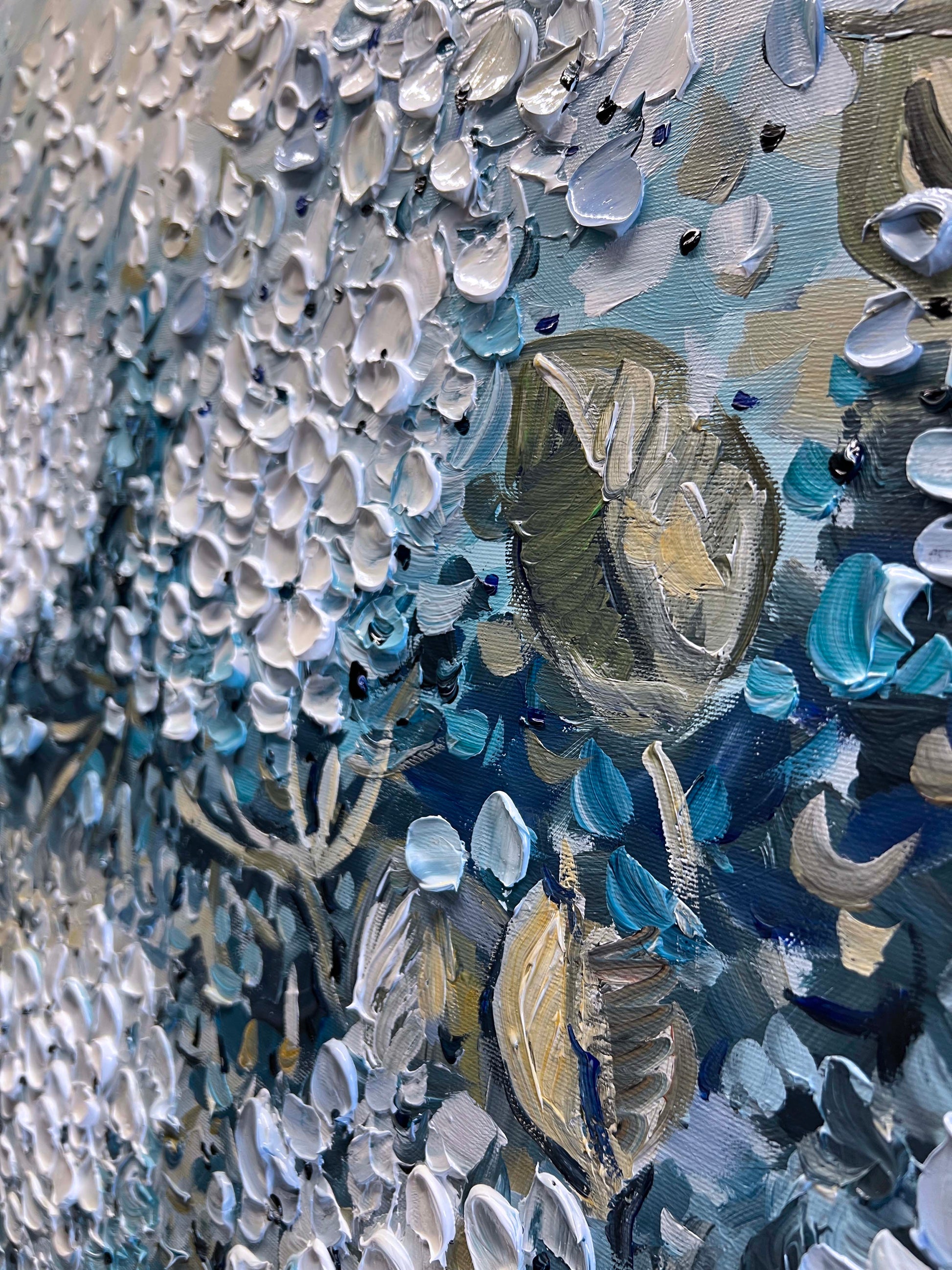 Each petal was painted with a textured palette knife technique, creating a rich tactile surface and a subtle three-dimensional effect that invites the viewer to step closer.