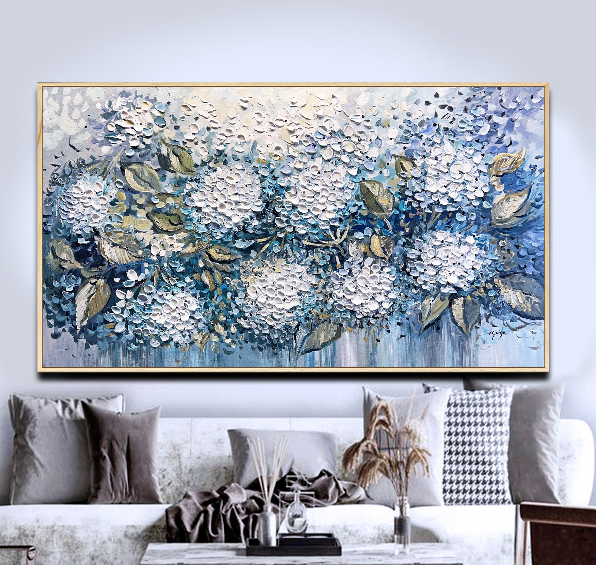 To enhance the organic softness and tranquil beauty of Shades of Hydrangea, a natural wood frame is a perfect choice. It adds warmth and elegance while harmonizing with the layered textures of the composition.