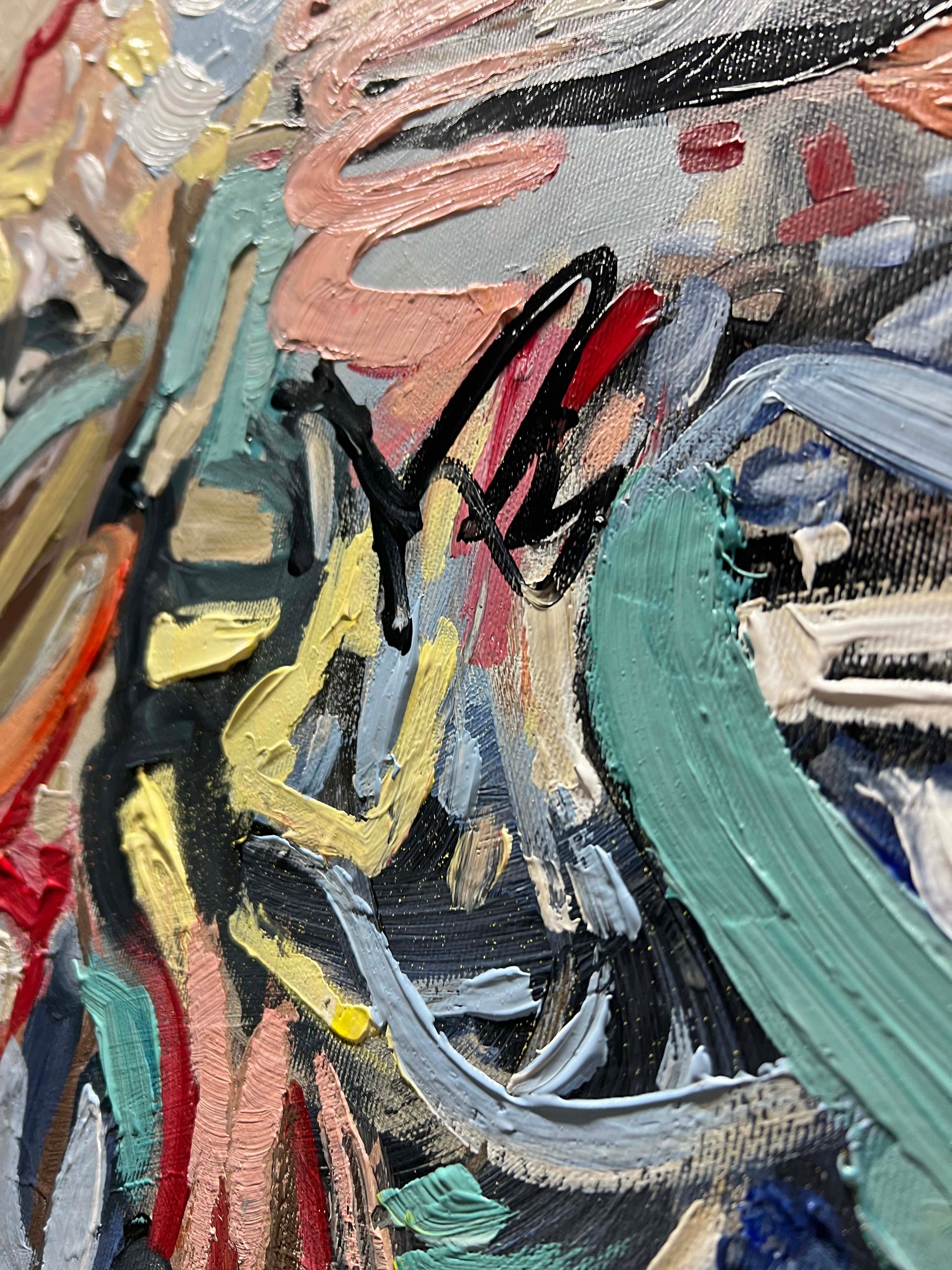 The layered palette gives the artwork depth and dimension, with thick, confident strokes that showcase a masterful command of texture.