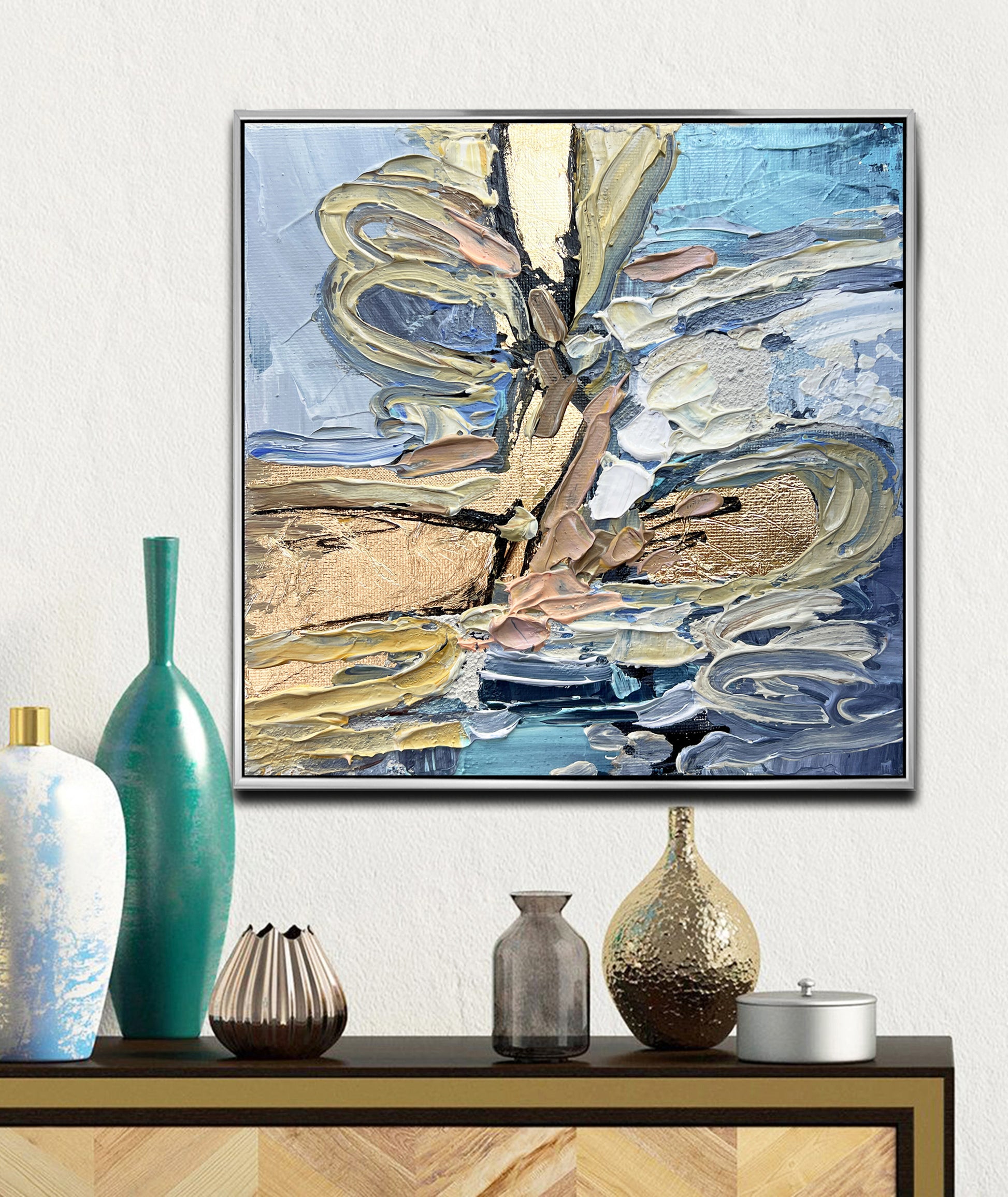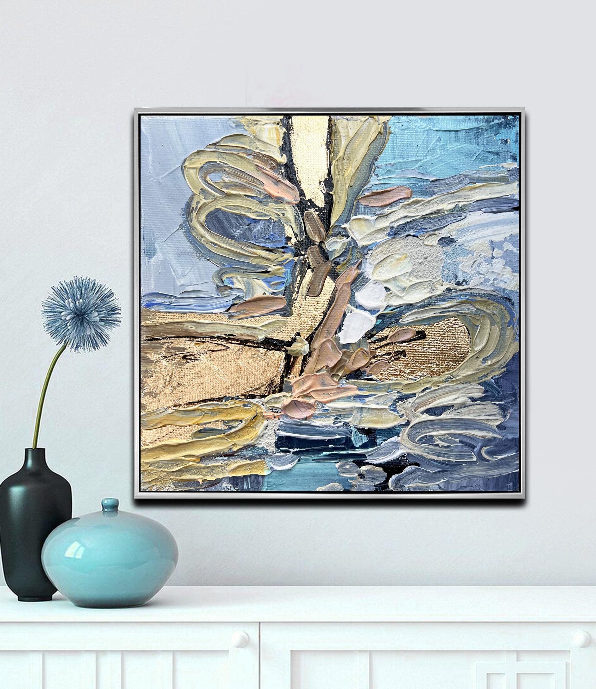 Presented in a refined silver frame, Silver Tide is a finished, ready-to-hang artwork designed to bring calm movement and understated elegance to contemporary interiors.
