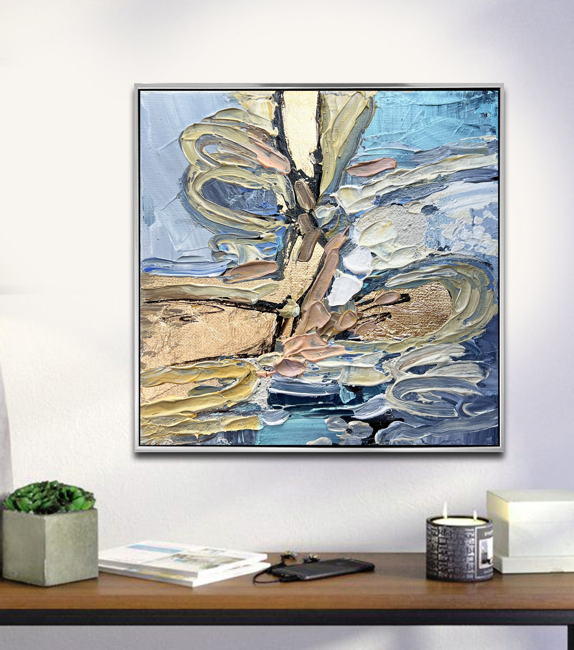 Silver Tide flows with a quiet sense of movement and luminosity, where cool blues and soft sandy hues are carried by gentle waves of silver and muted gold.