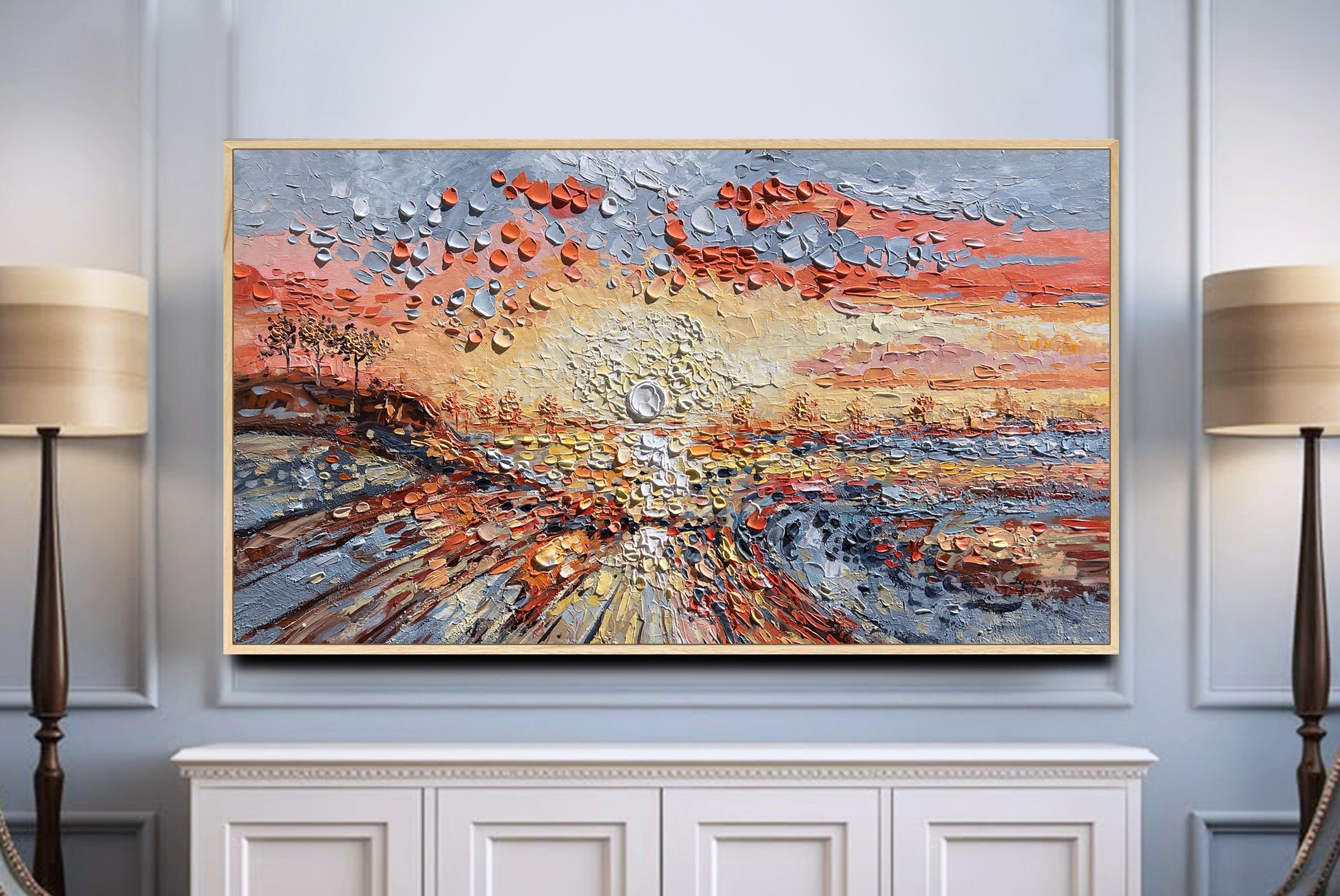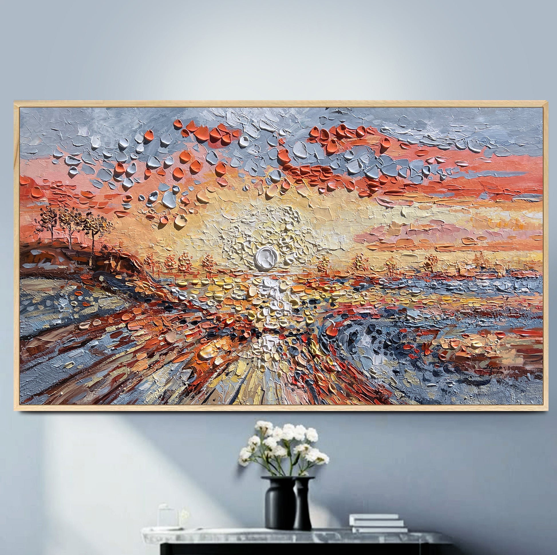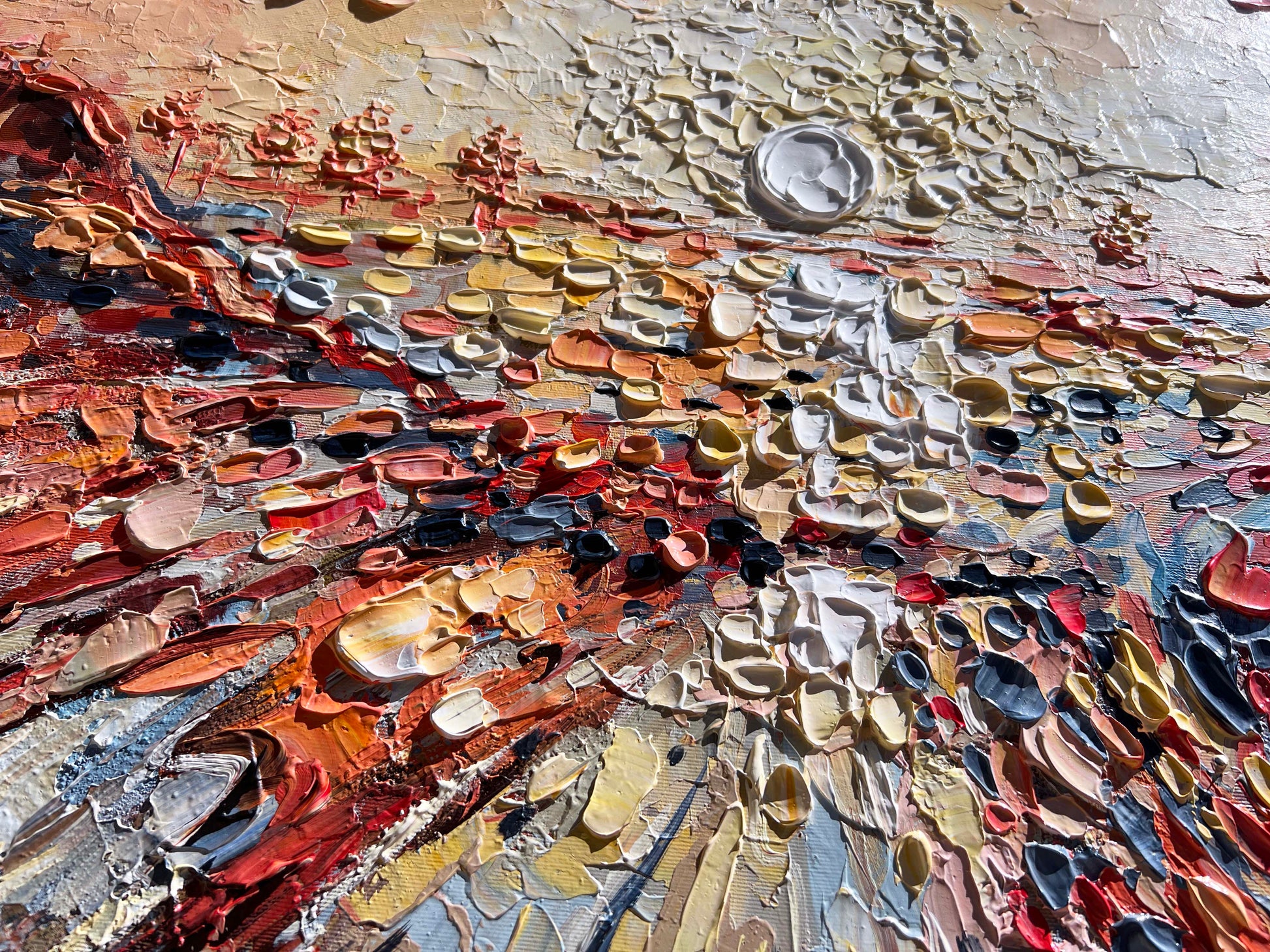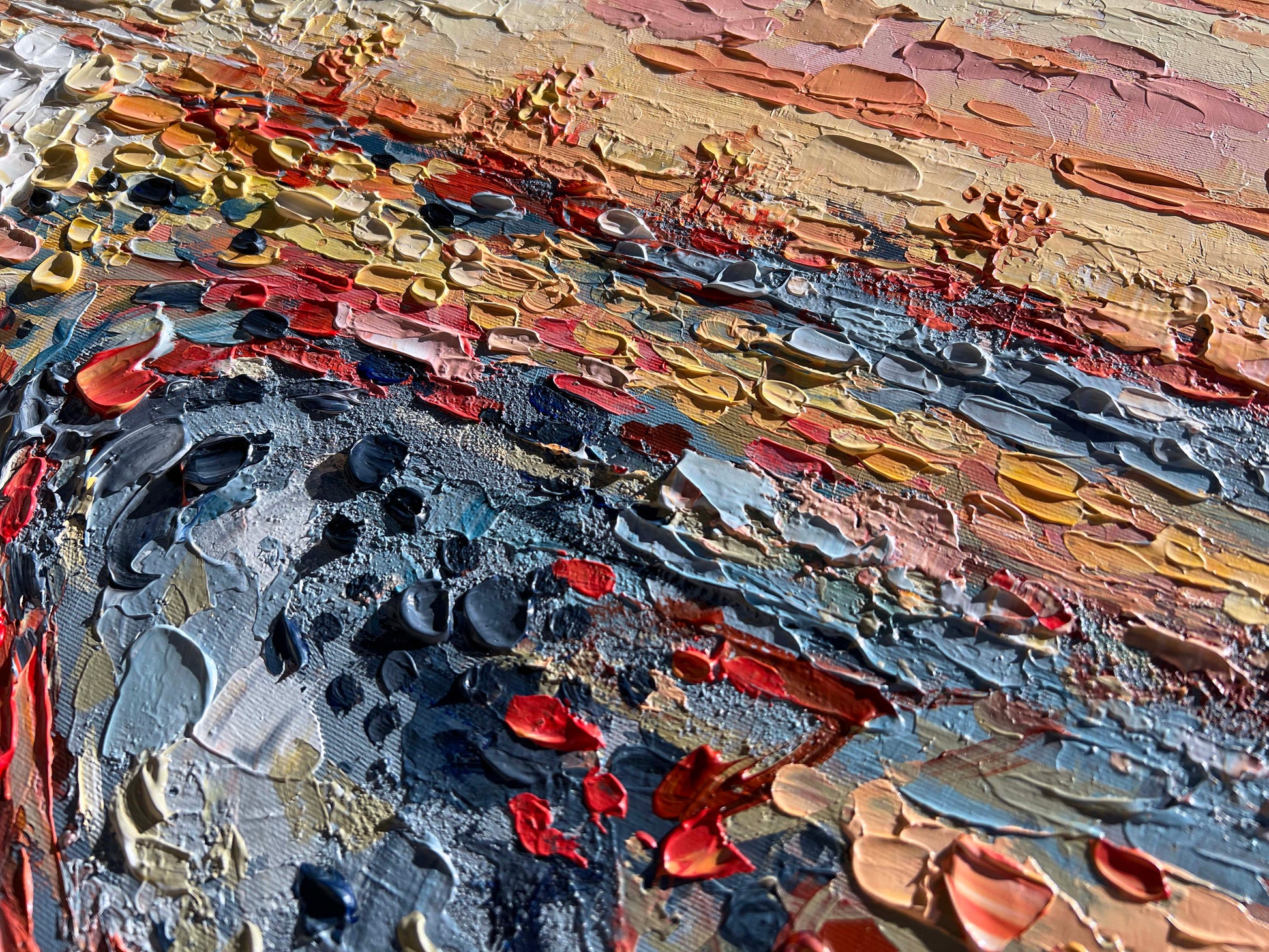 This textured painting captures the breathtaking moment when the sun rises to meet the earth, flooding the landscape with warmth and light. Vibrant strokes of gray and red intertwine — a dance between cold and warm tones — creating a striking balance of contrast and harmony. The sculptural layers of paint give depth and movement, making the sunrise feel alive as it illuminates every corner of the scene.
