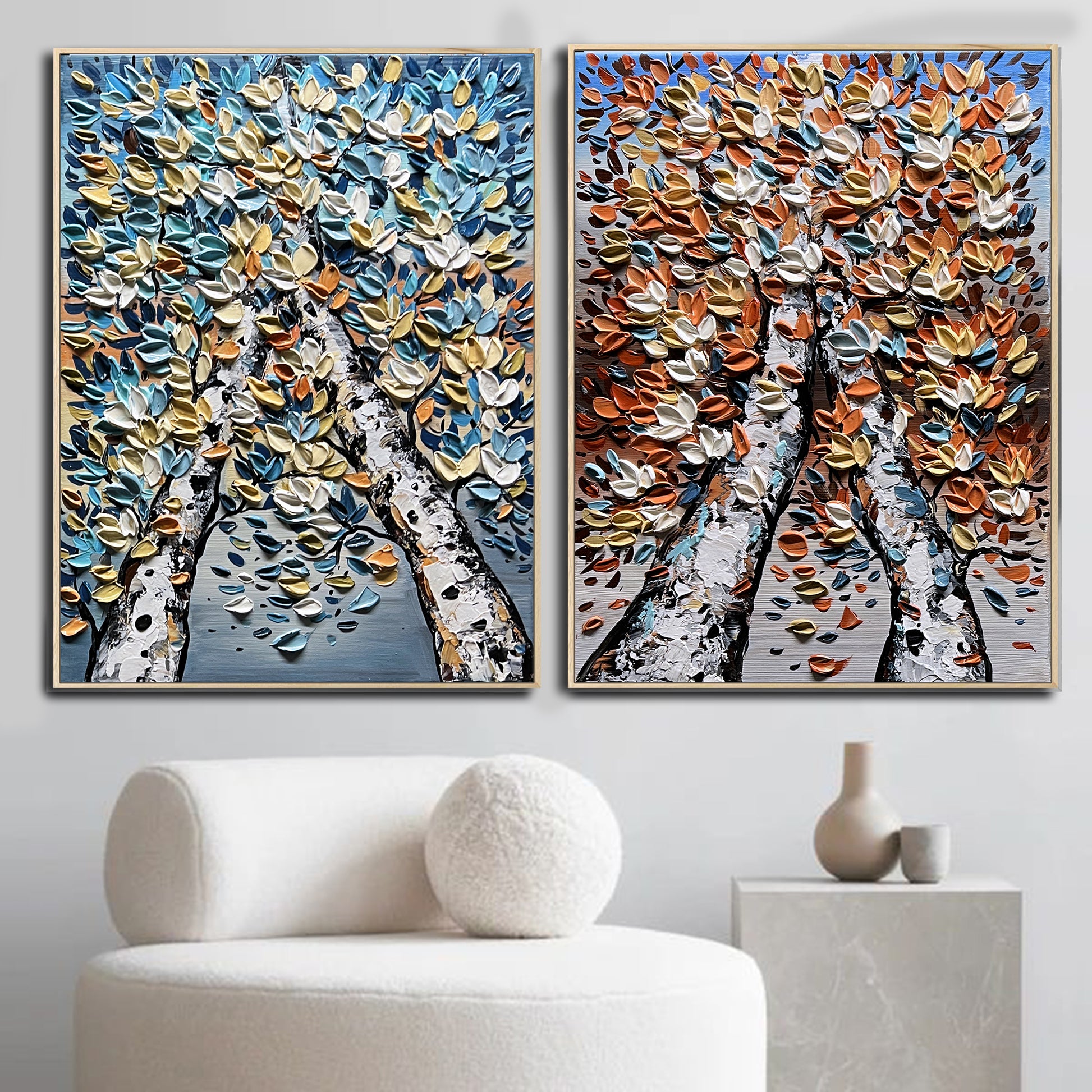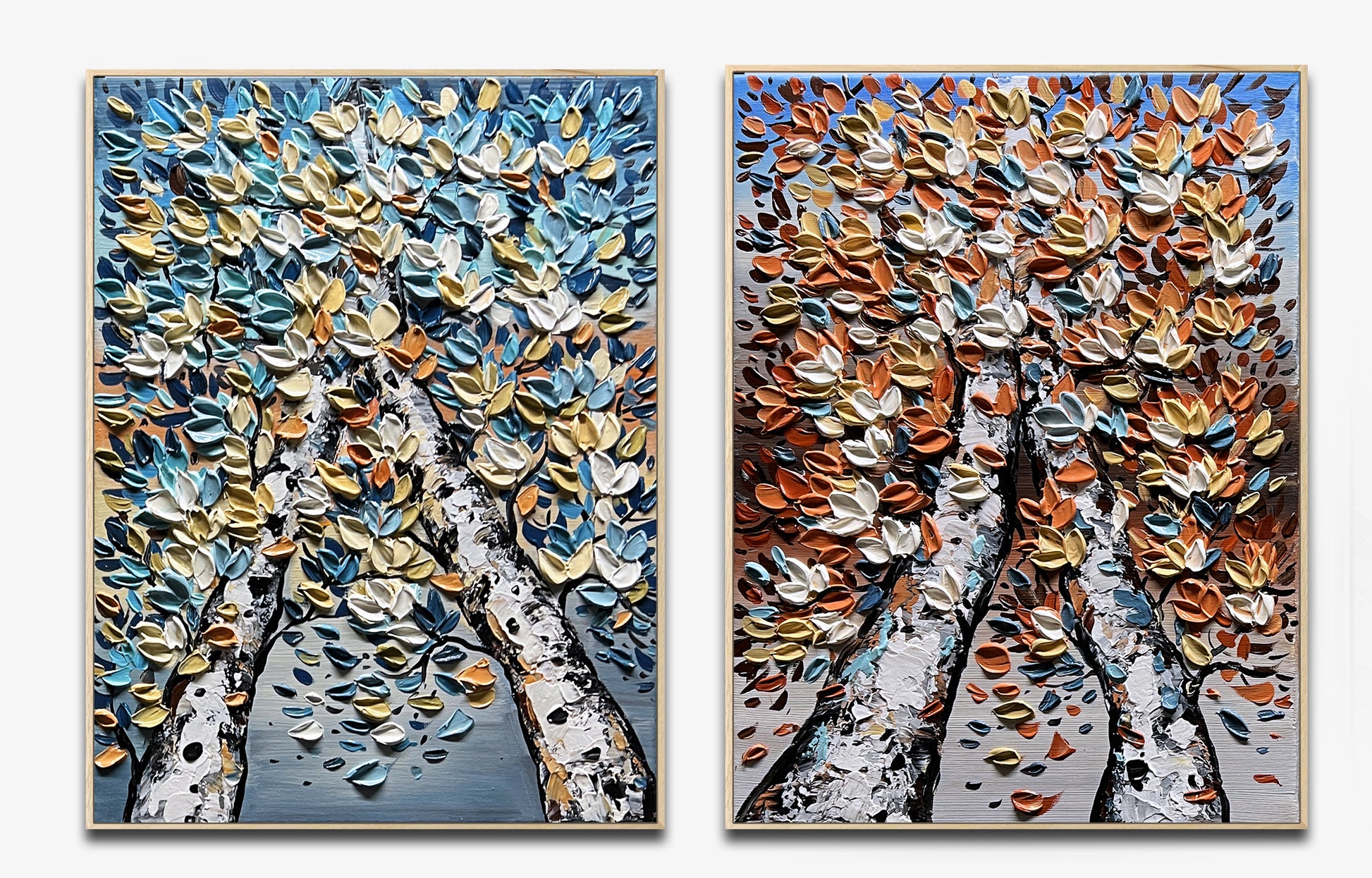 The palette-knife texture is rich and expressive, building a sculptural surface that feels alive with movement, as if the light itself is passing from one painting to the other.