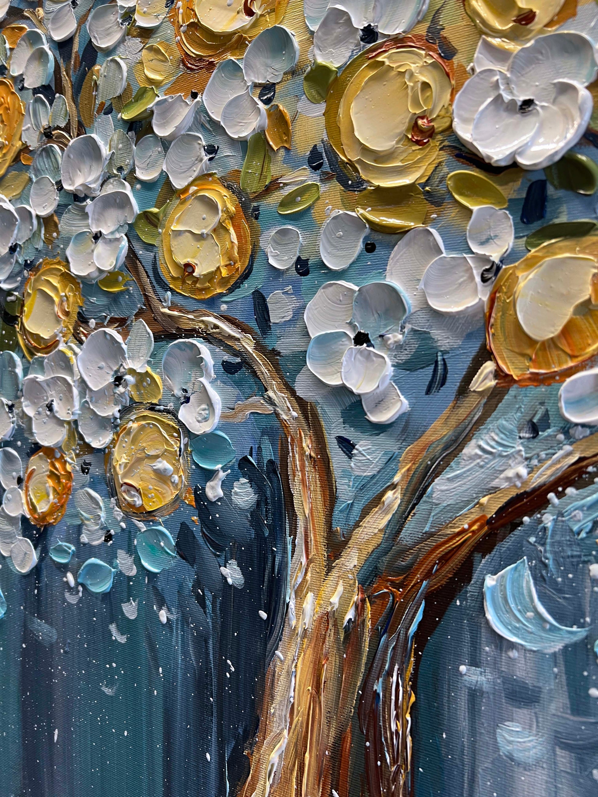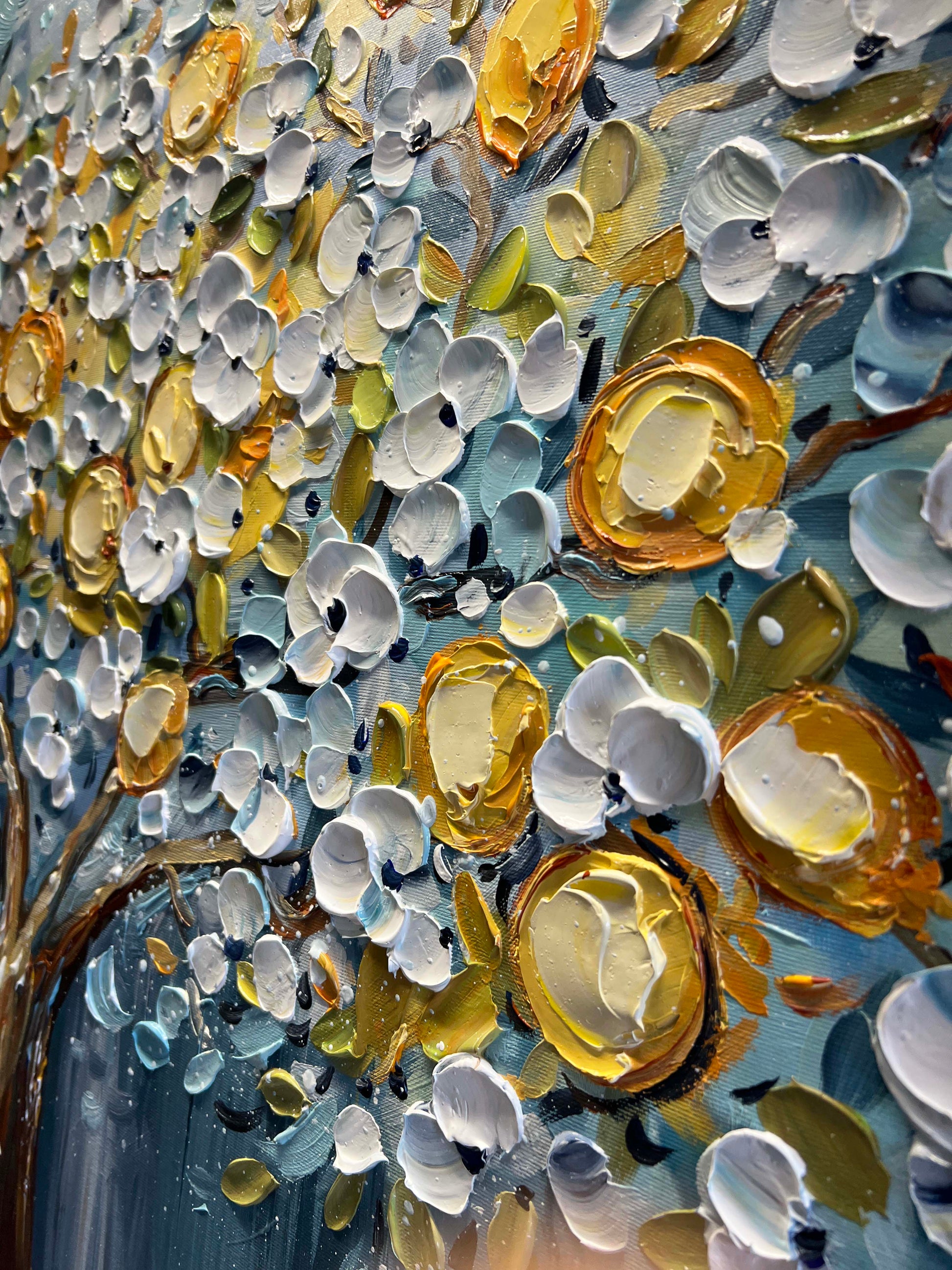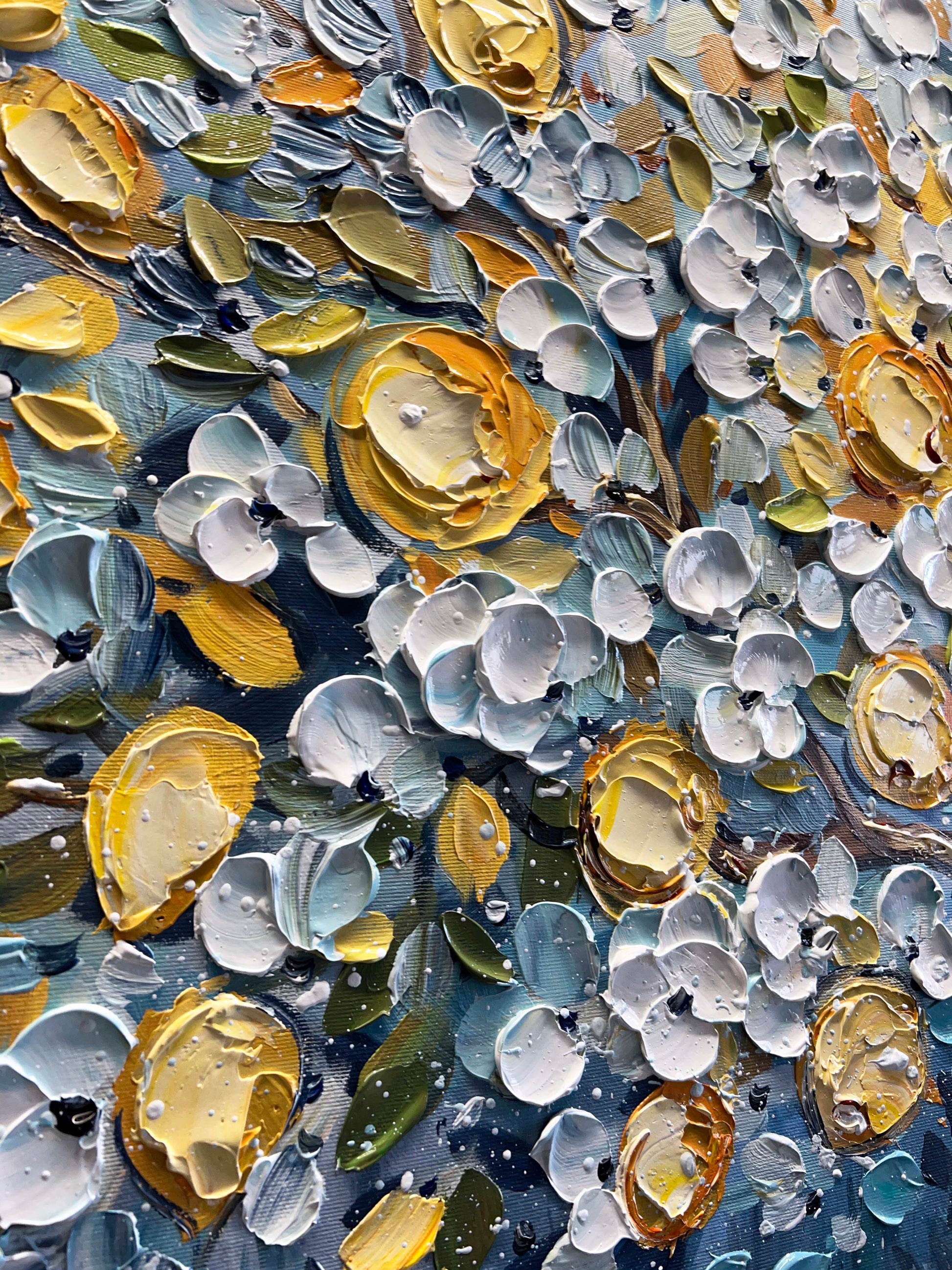 Thick, expressive brushstrokes bring to life a cascade of golden yellow lemons nestled among soft white blossoms and lush green leaves, all set against a dreamy blue toned background.