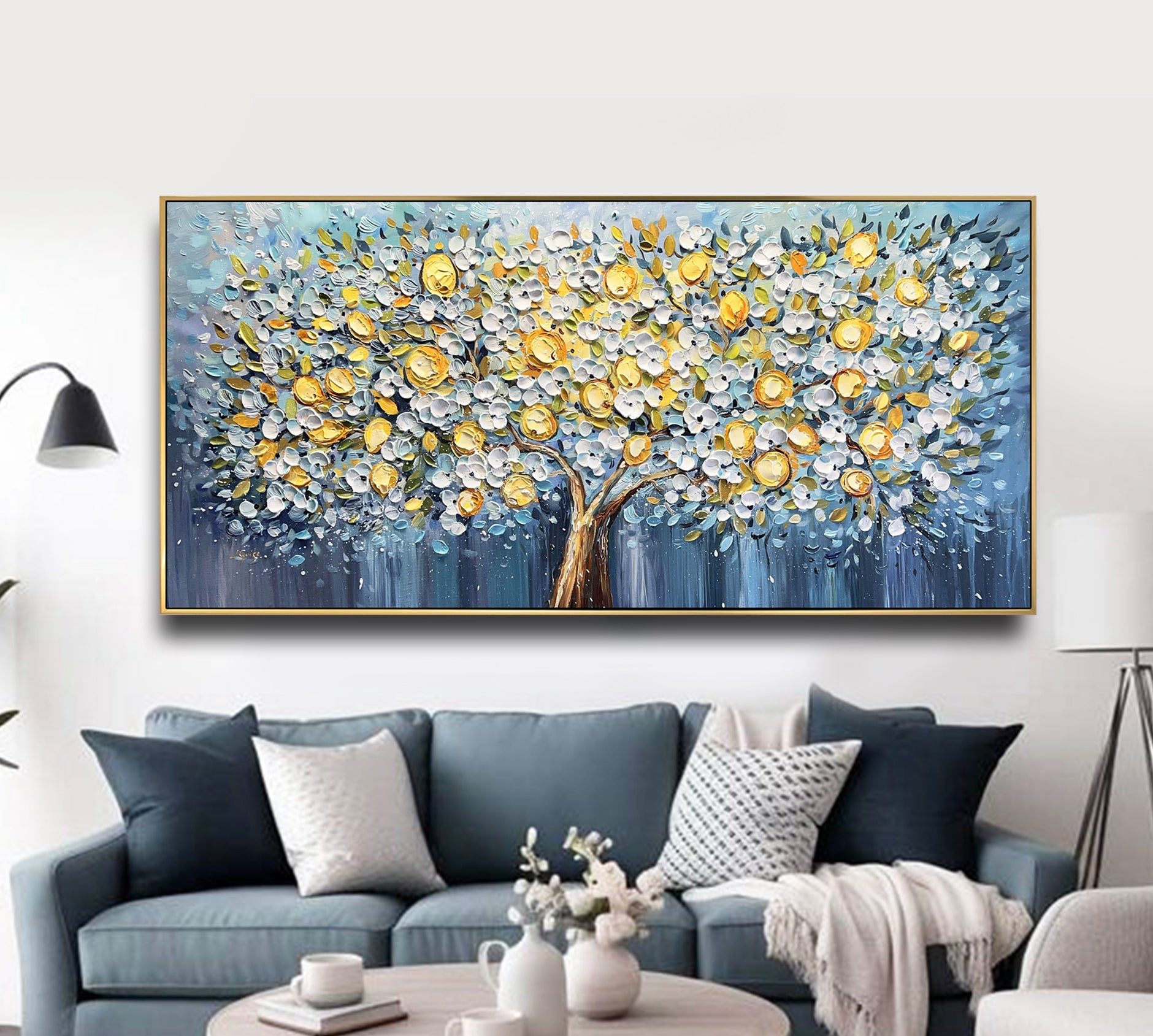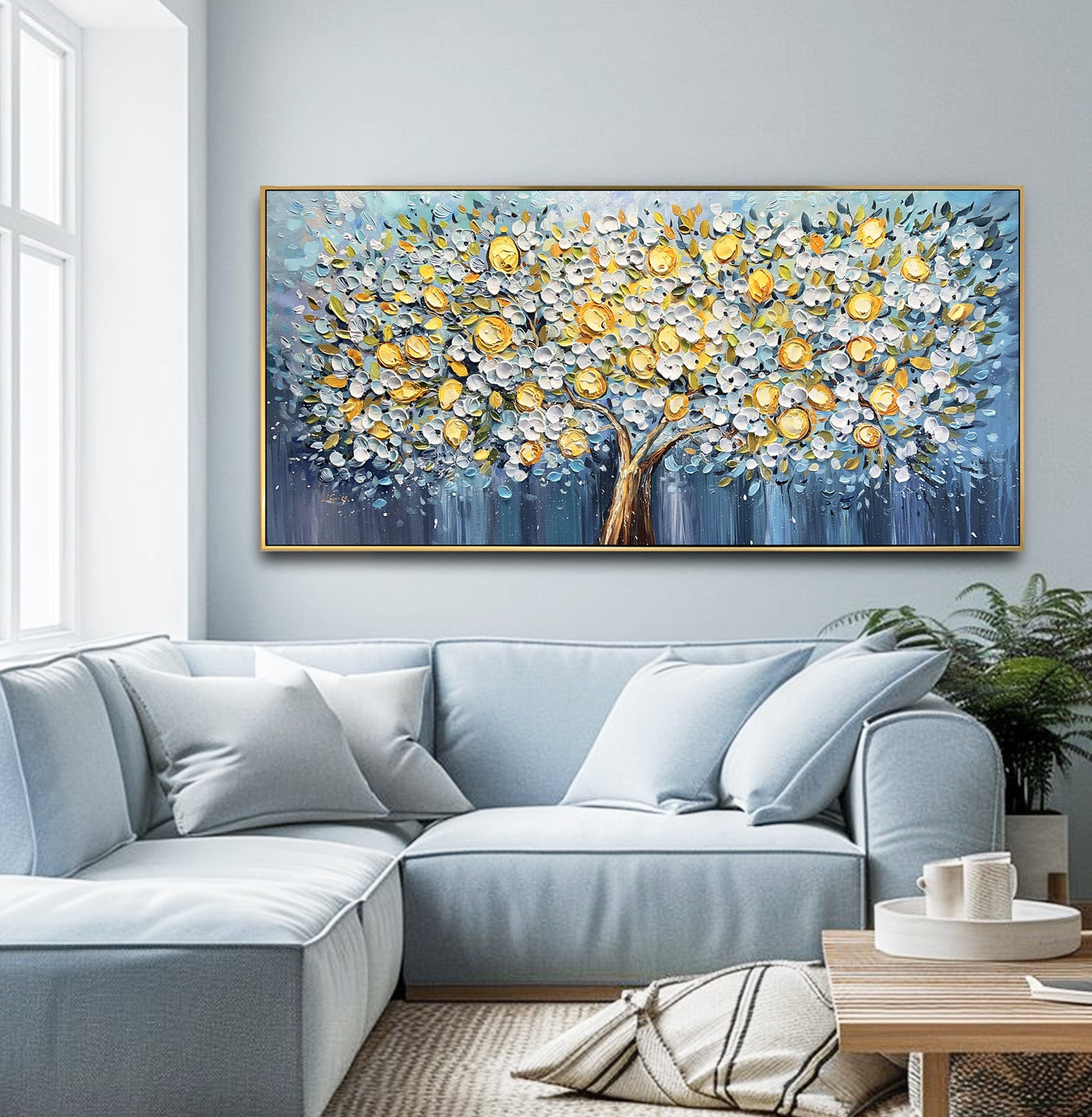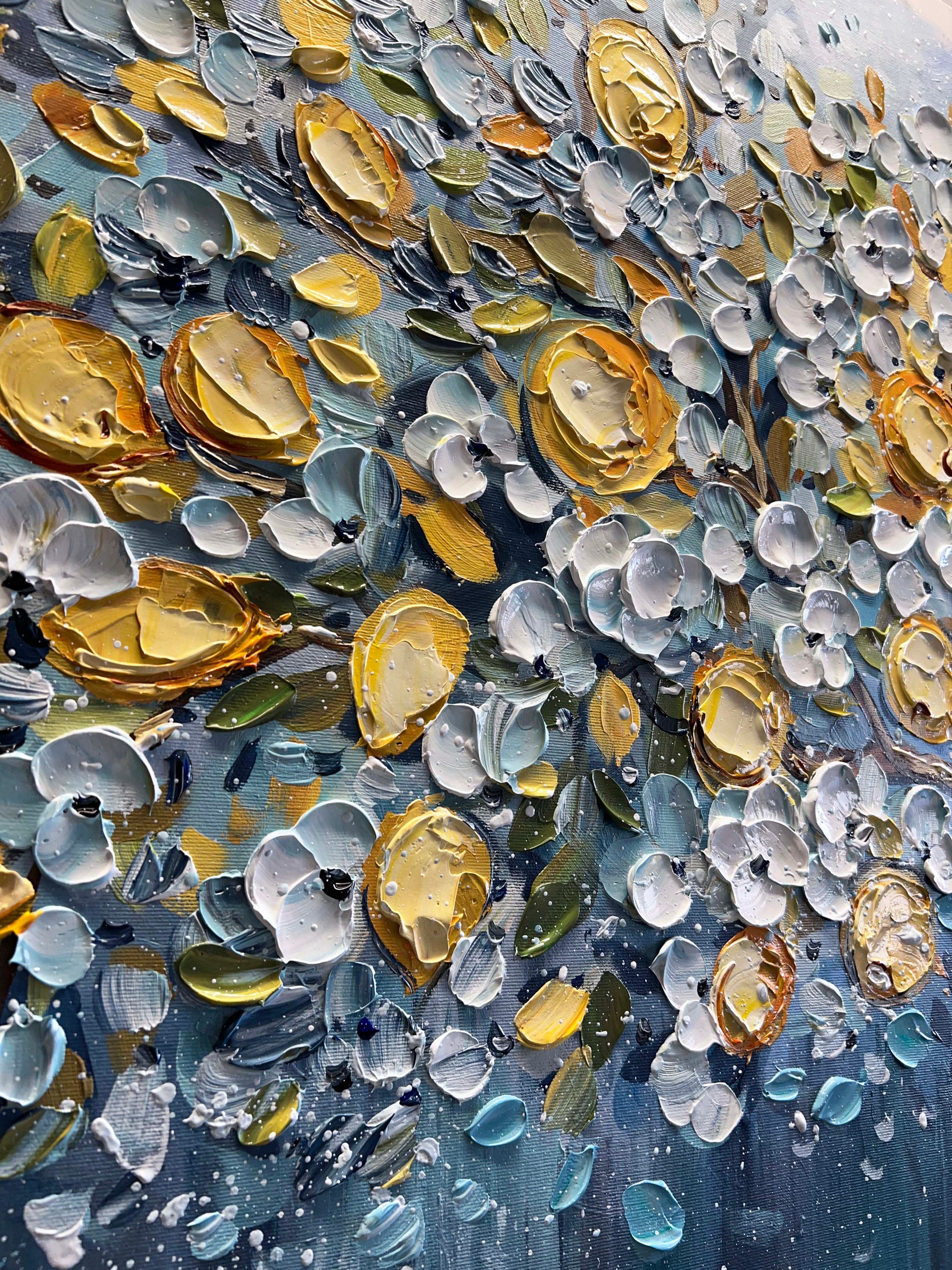 Thick, expressive brushstrokes bring to life a cascade of golden yellow lemons nestled among soft white blossoms and lush green leaves, all set against a dreamy blue toned background.
