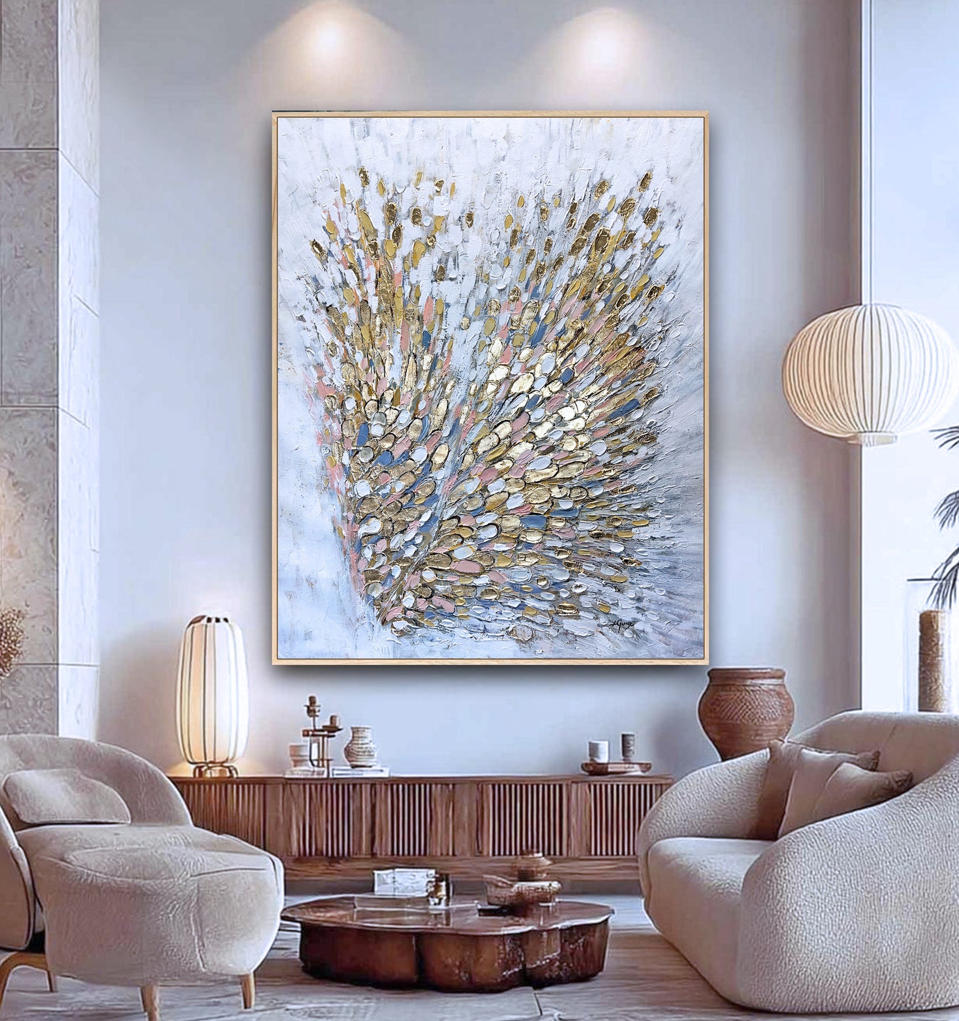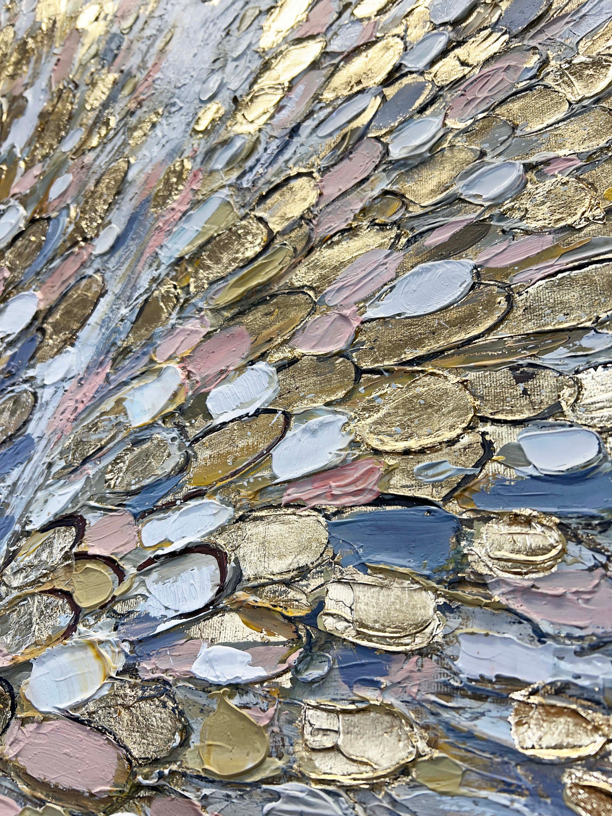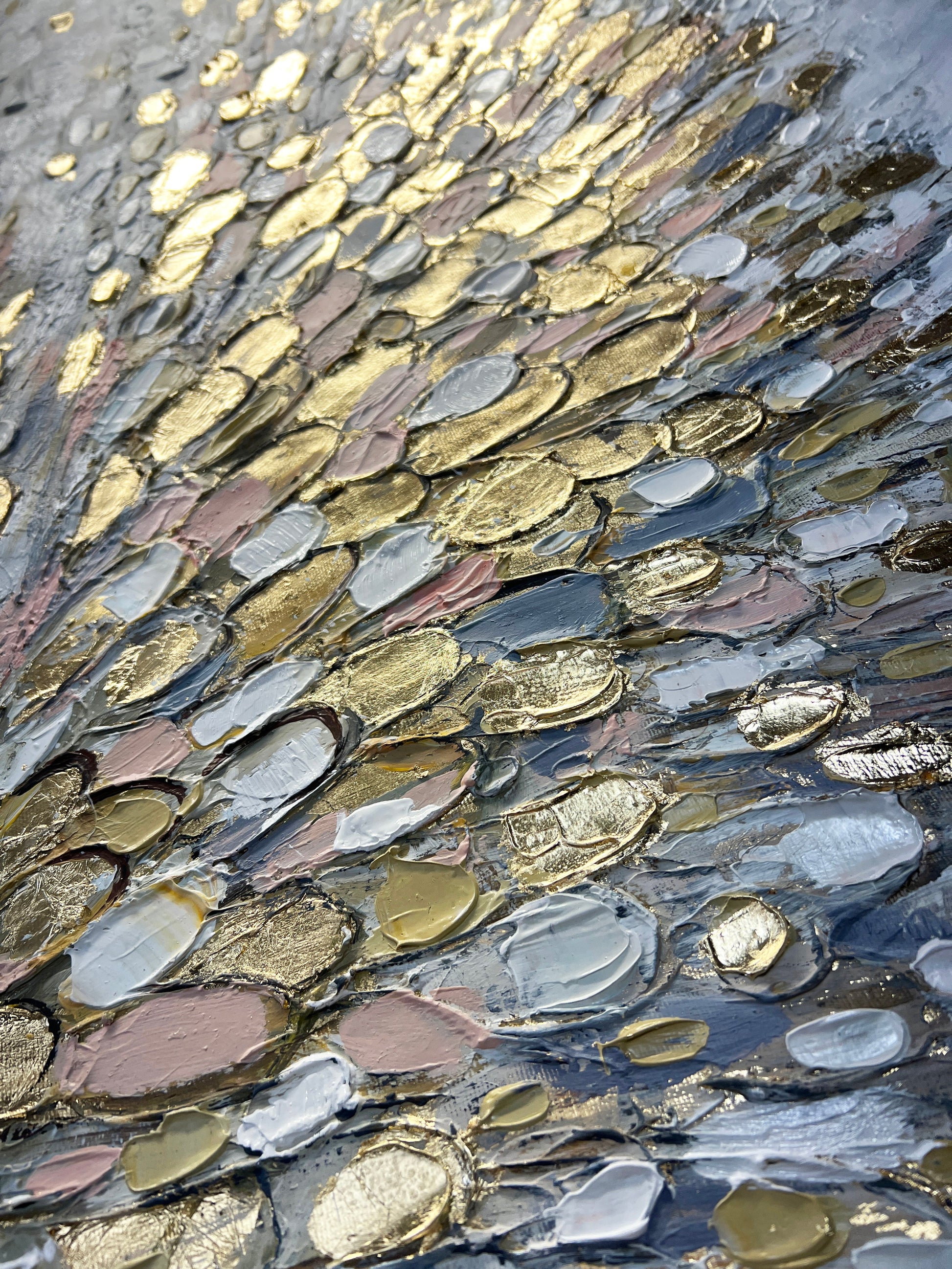 The wings are made with gold leaf. The neutral background enhances the luminous gold and pastel tones, allowing the composition to feel airy, balanced, and serene while still visually dynamic.