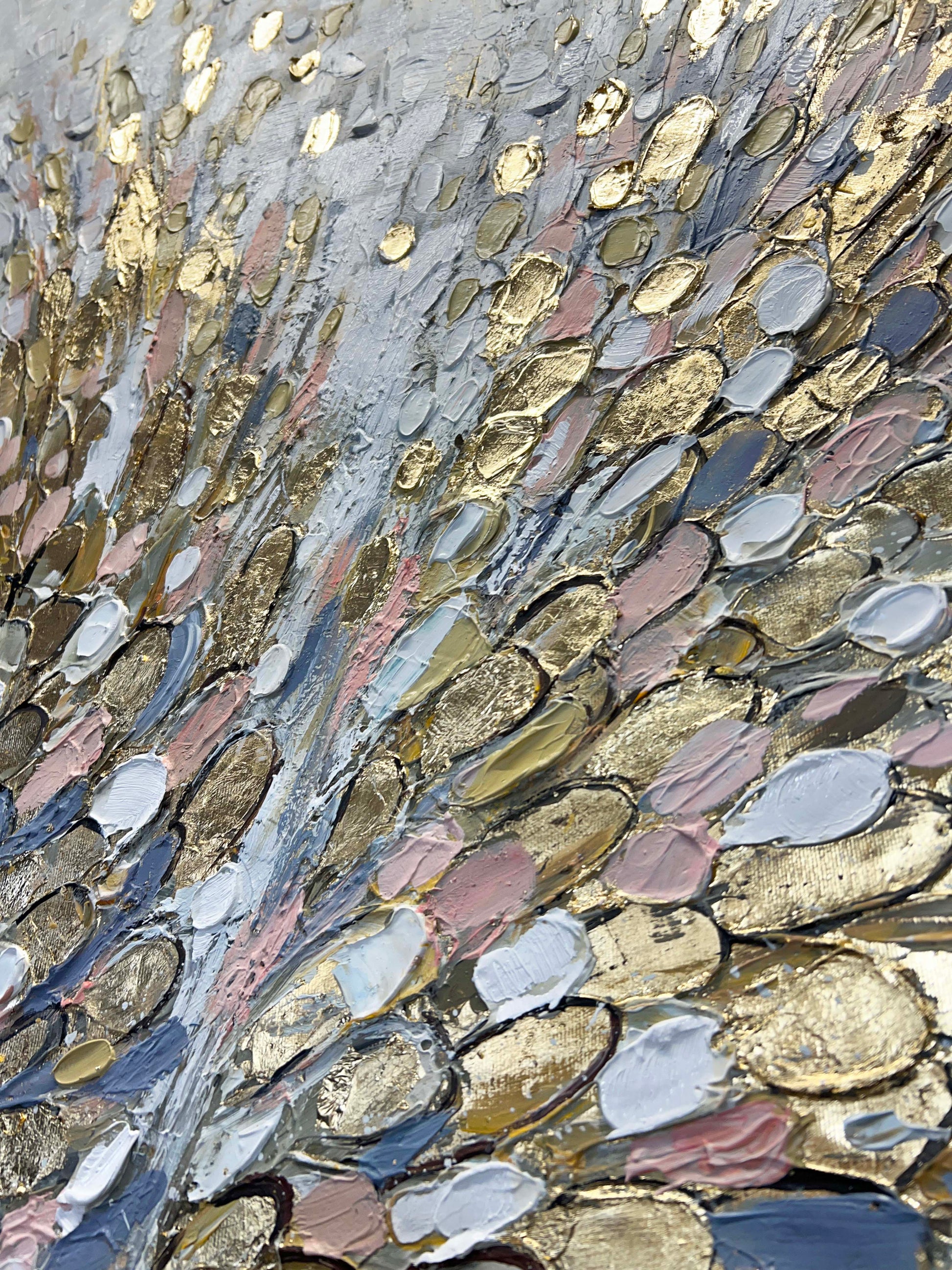 The painting is painted in a palette of soft whites, warm golds, muted blush pinks, gentle blues, and cool grays.