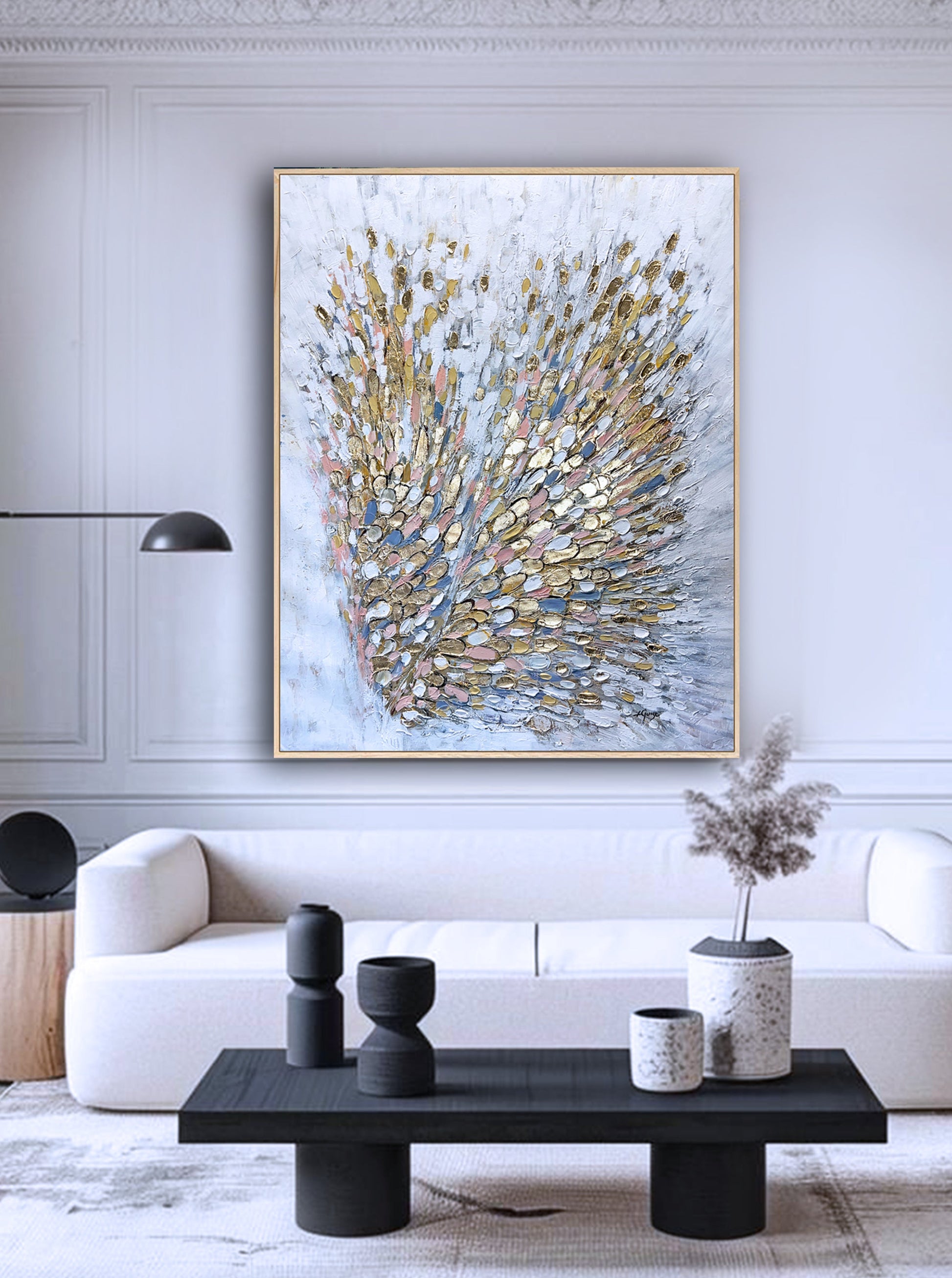 A natural wooden frame is, in my view, the ideal finish to complement the refined palette and highlight the painting’s elegant presence.