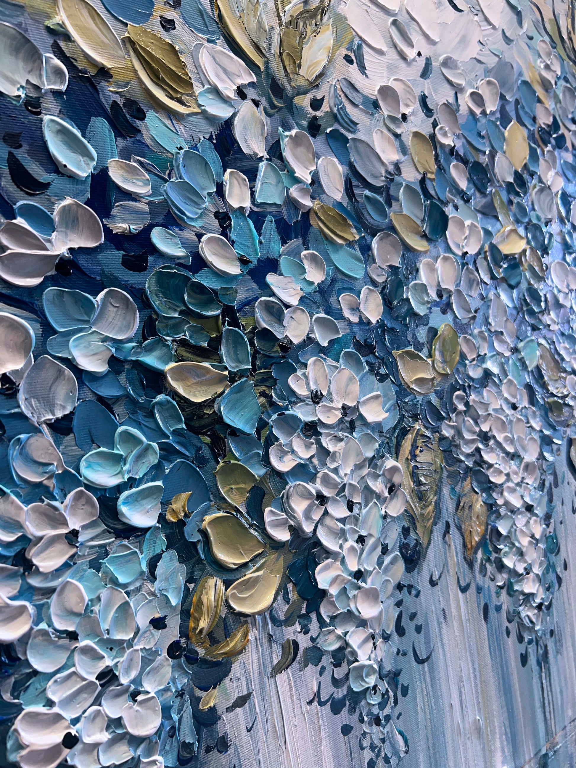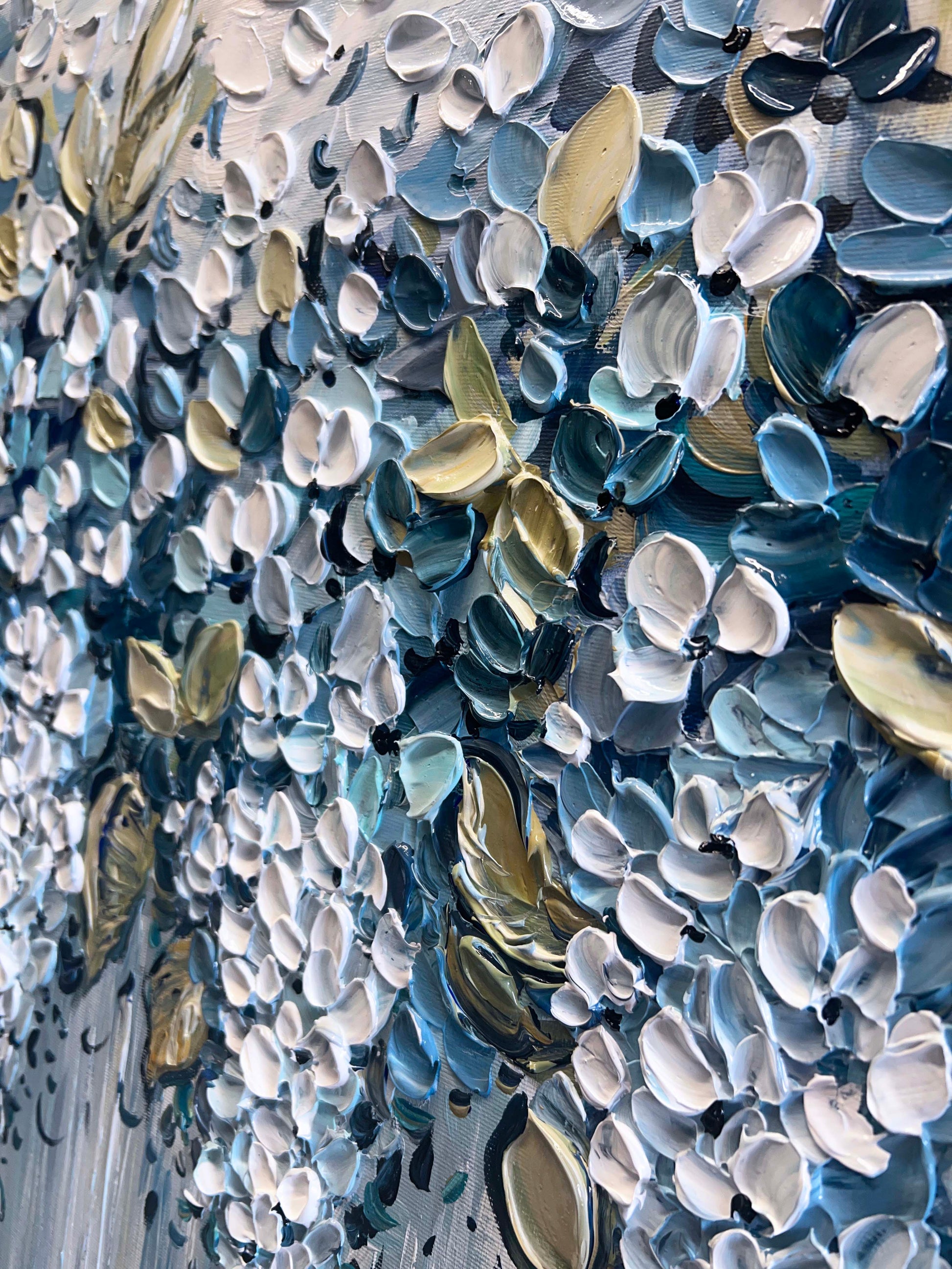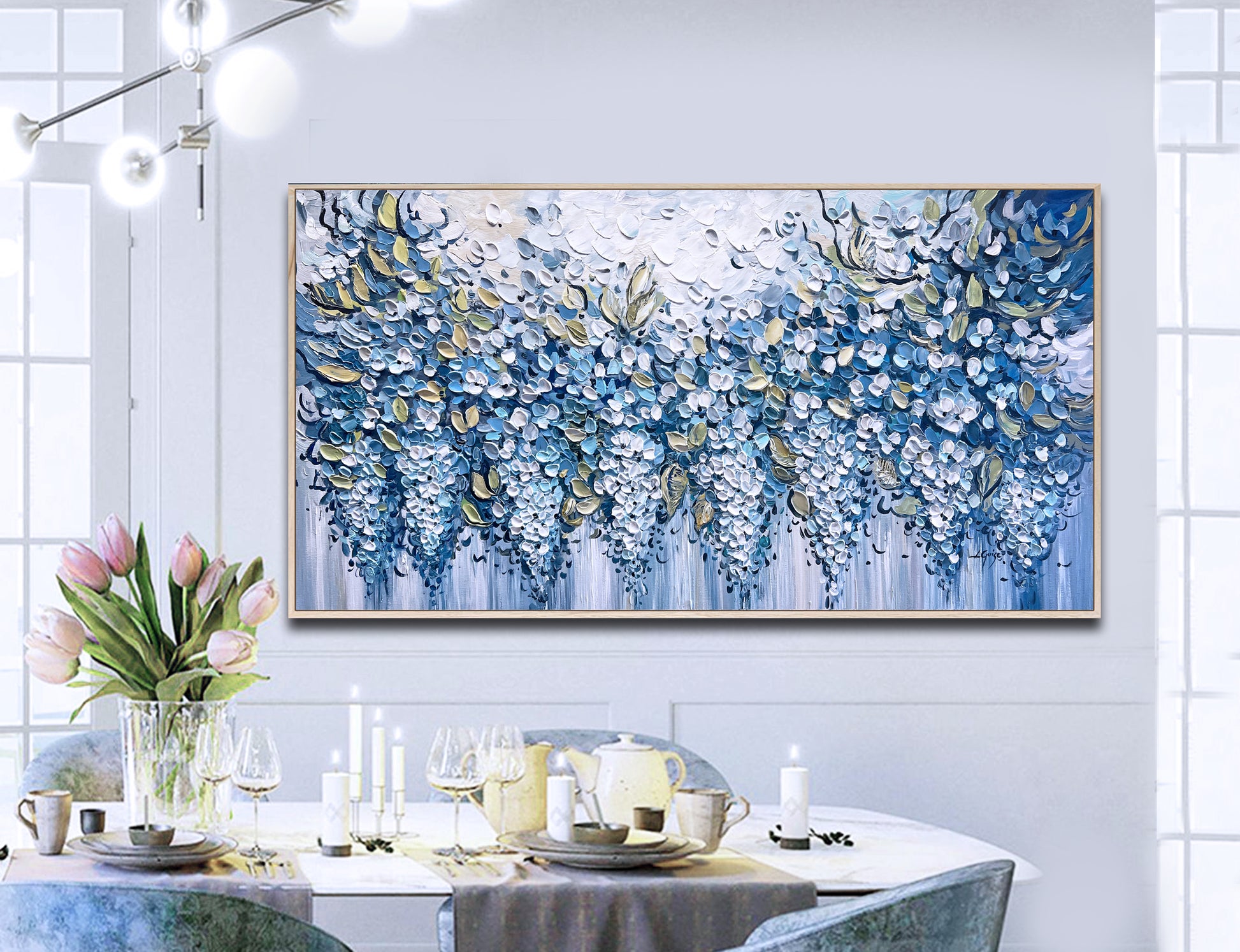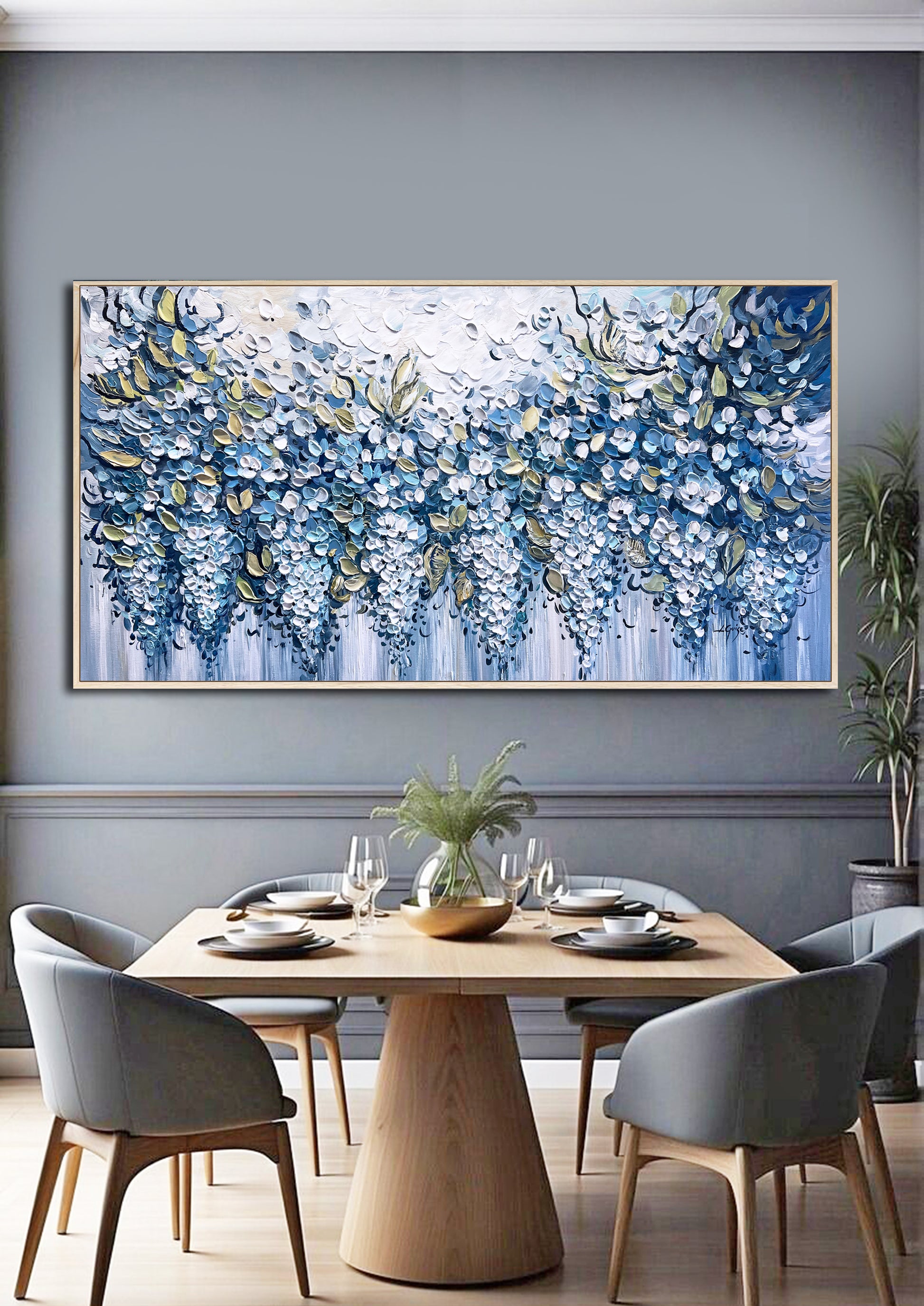 "Wisteria Cascade" is a statement artwork that captures the timeless elegance of cascading wisteria blossoms. Painted in textured layers of blue, white, and sage with delicate golden accents, it evokes both opulence and serenity — like a jeweled waterfall in bloom. The richness of its palette brings depth and sophistication, making it a perfect centerpiece for refined interiors.