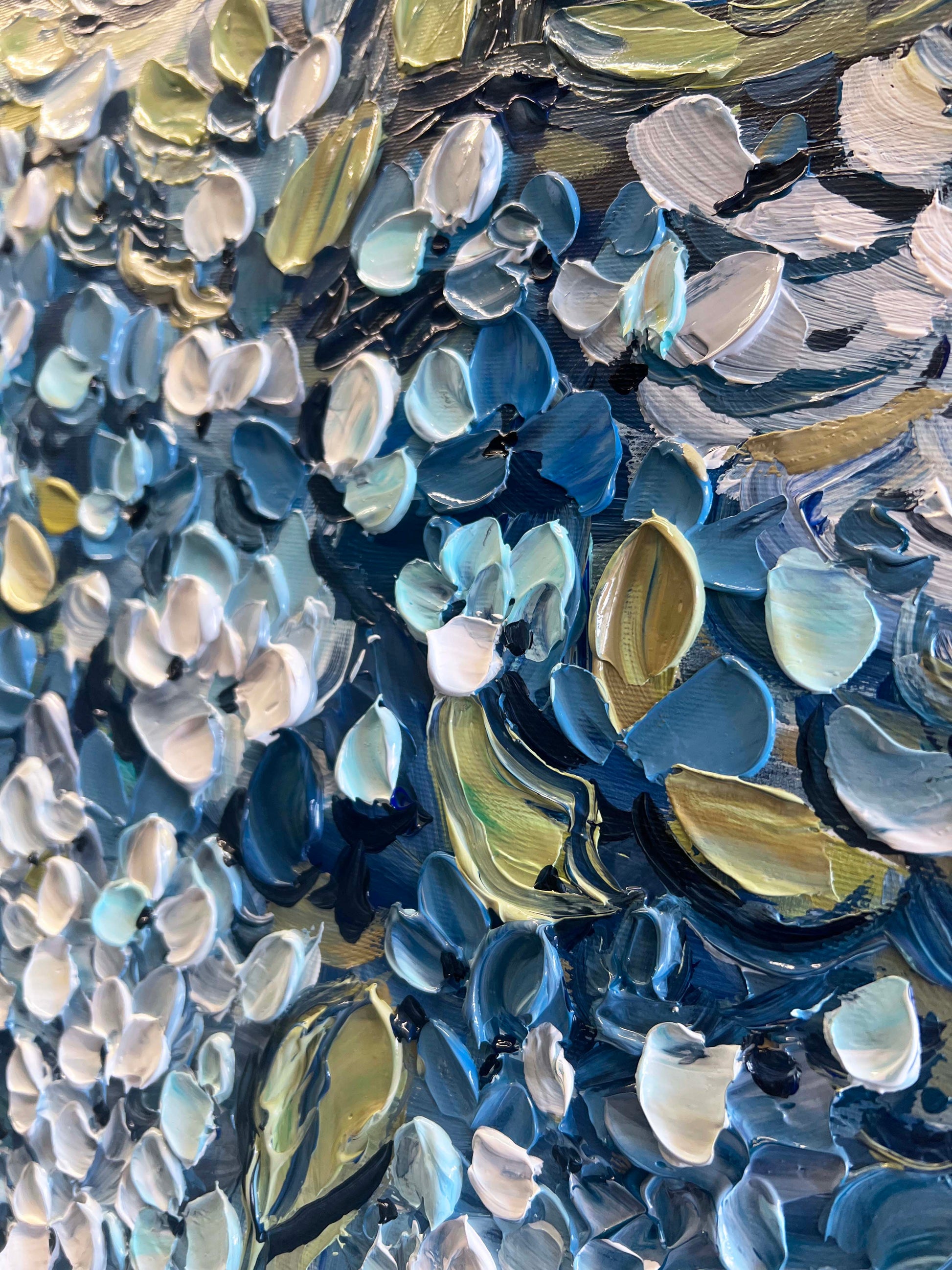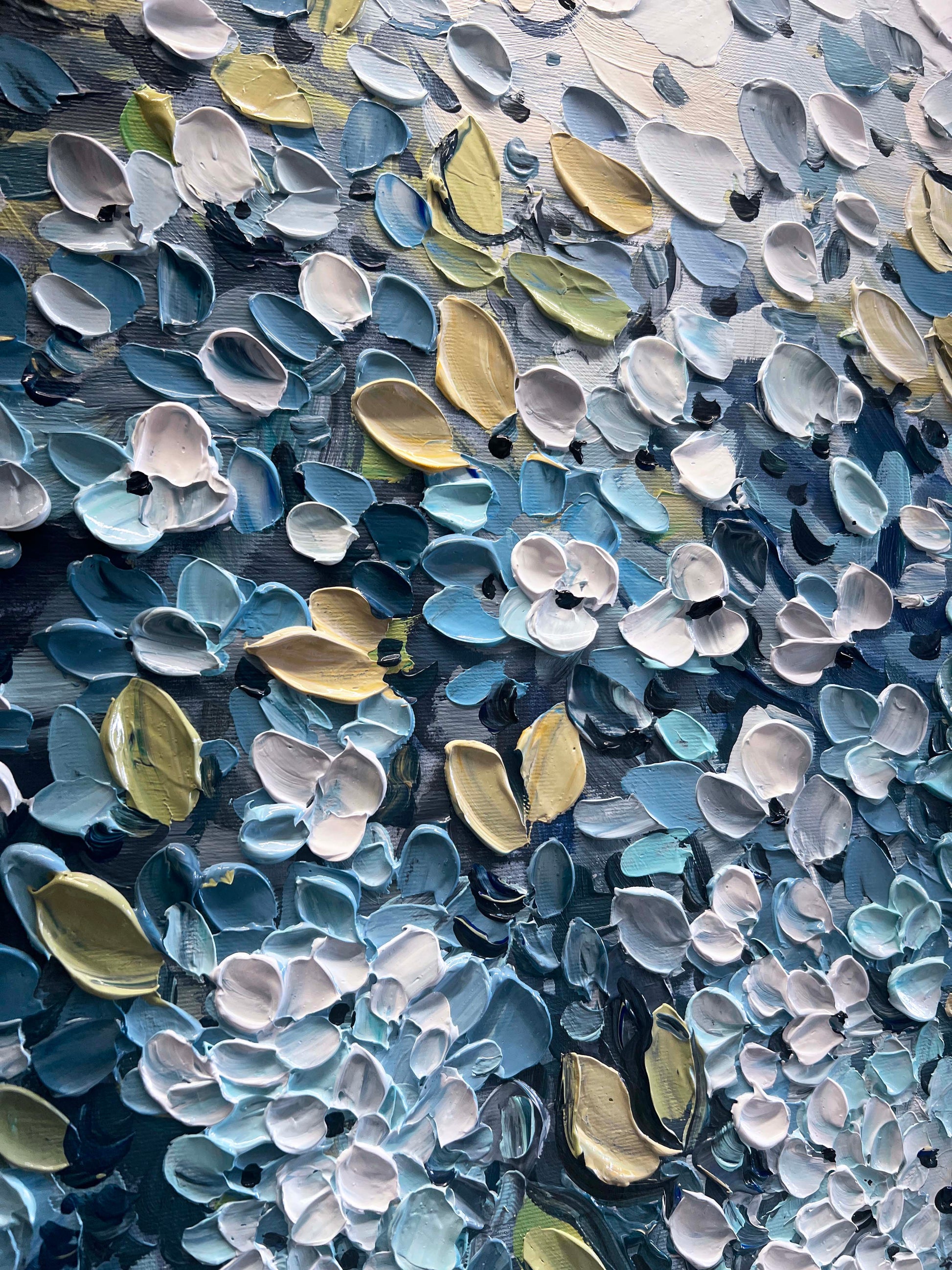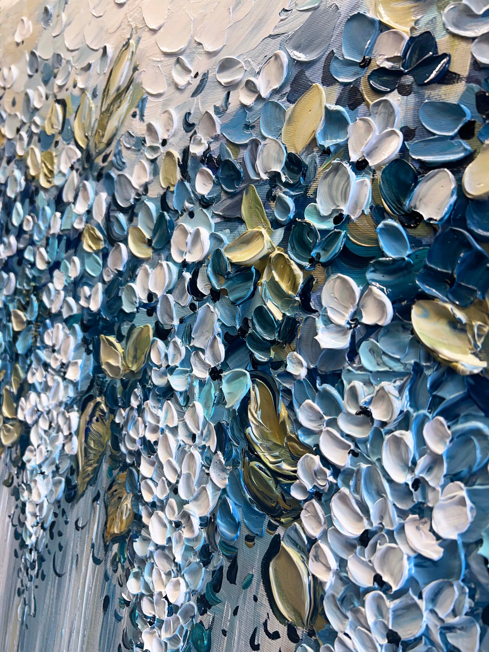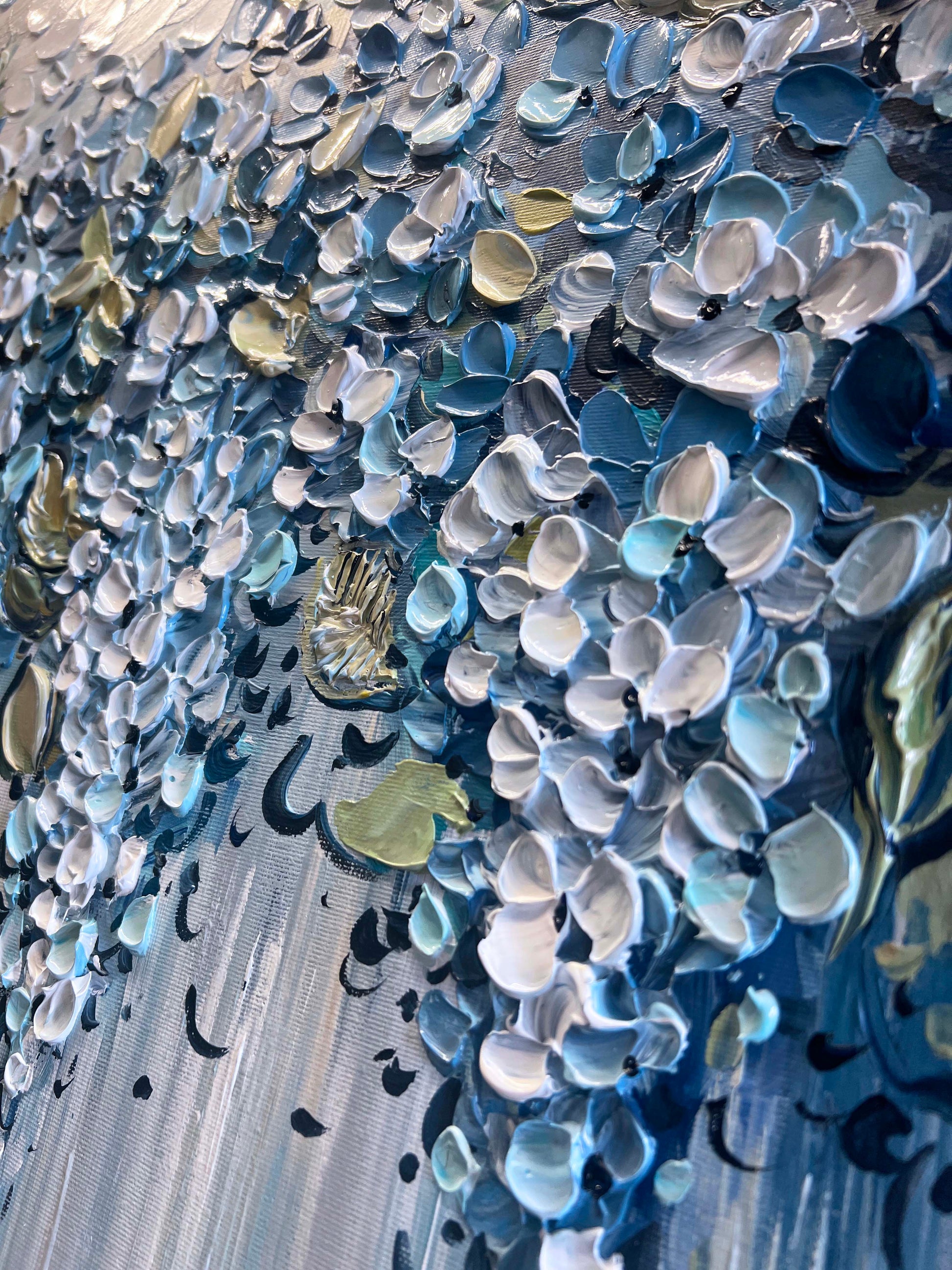 "Wisteria Cascade" is a statement artwork that captures the timeless elegance of cascading wisteria blossoms. Painted in textured layers of blue, white, and sage with delicate golden accents, it evokes both opulence and serenity — like a jeweled waterfall in bloom. The richness of its palette brings depth and sophistication, making it a perfect centerpiece for refined interiors.